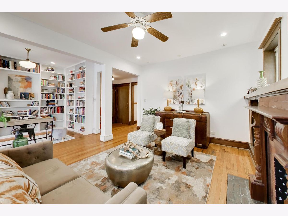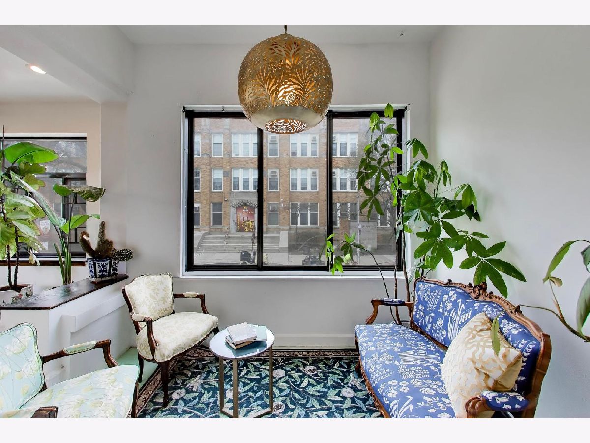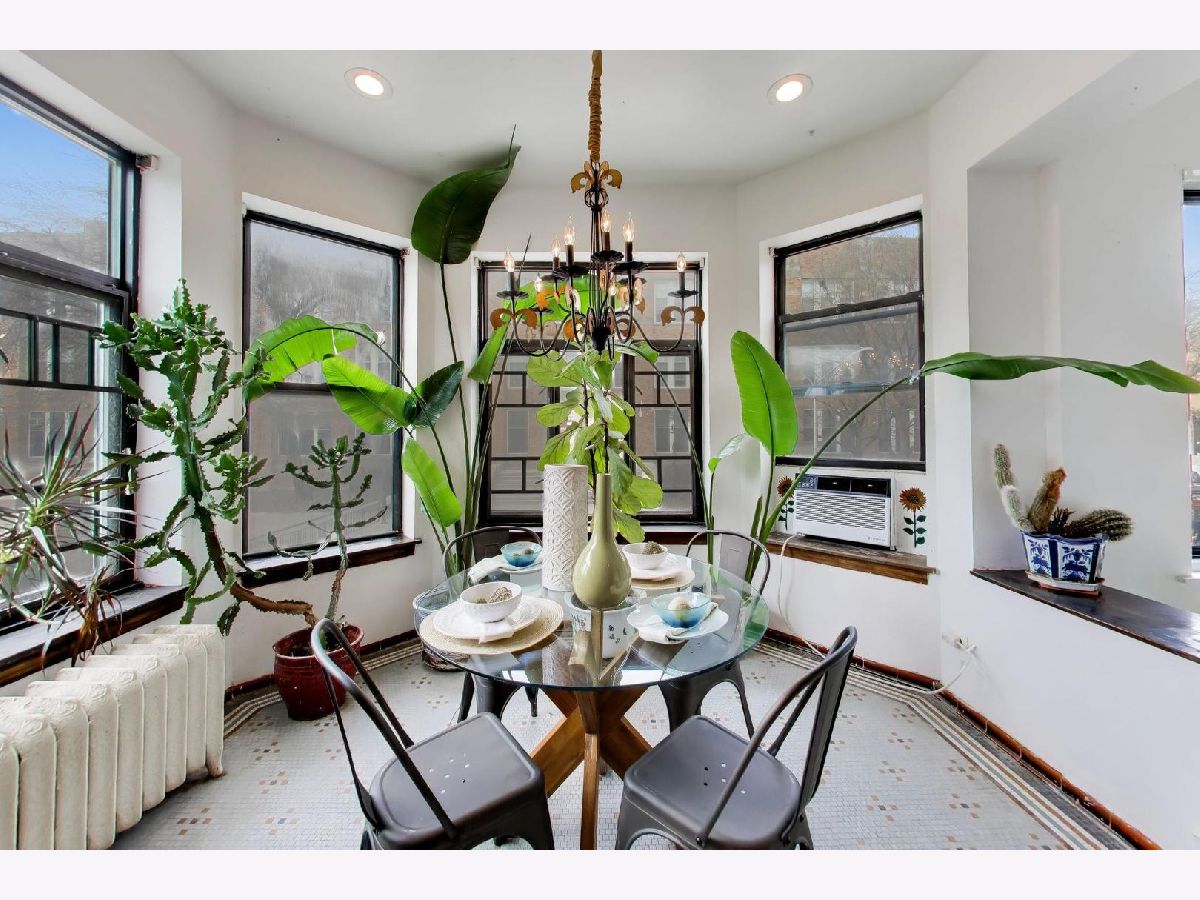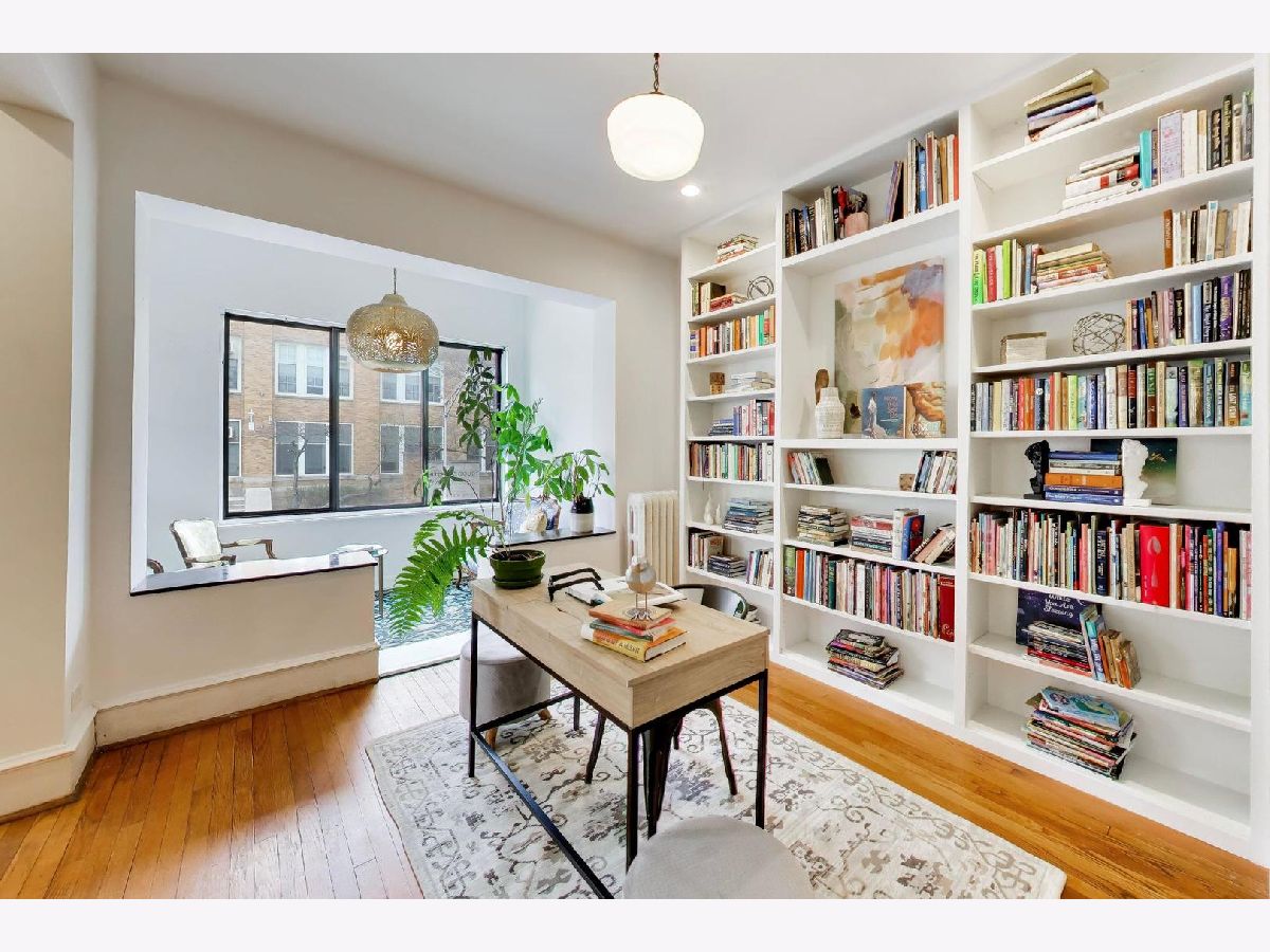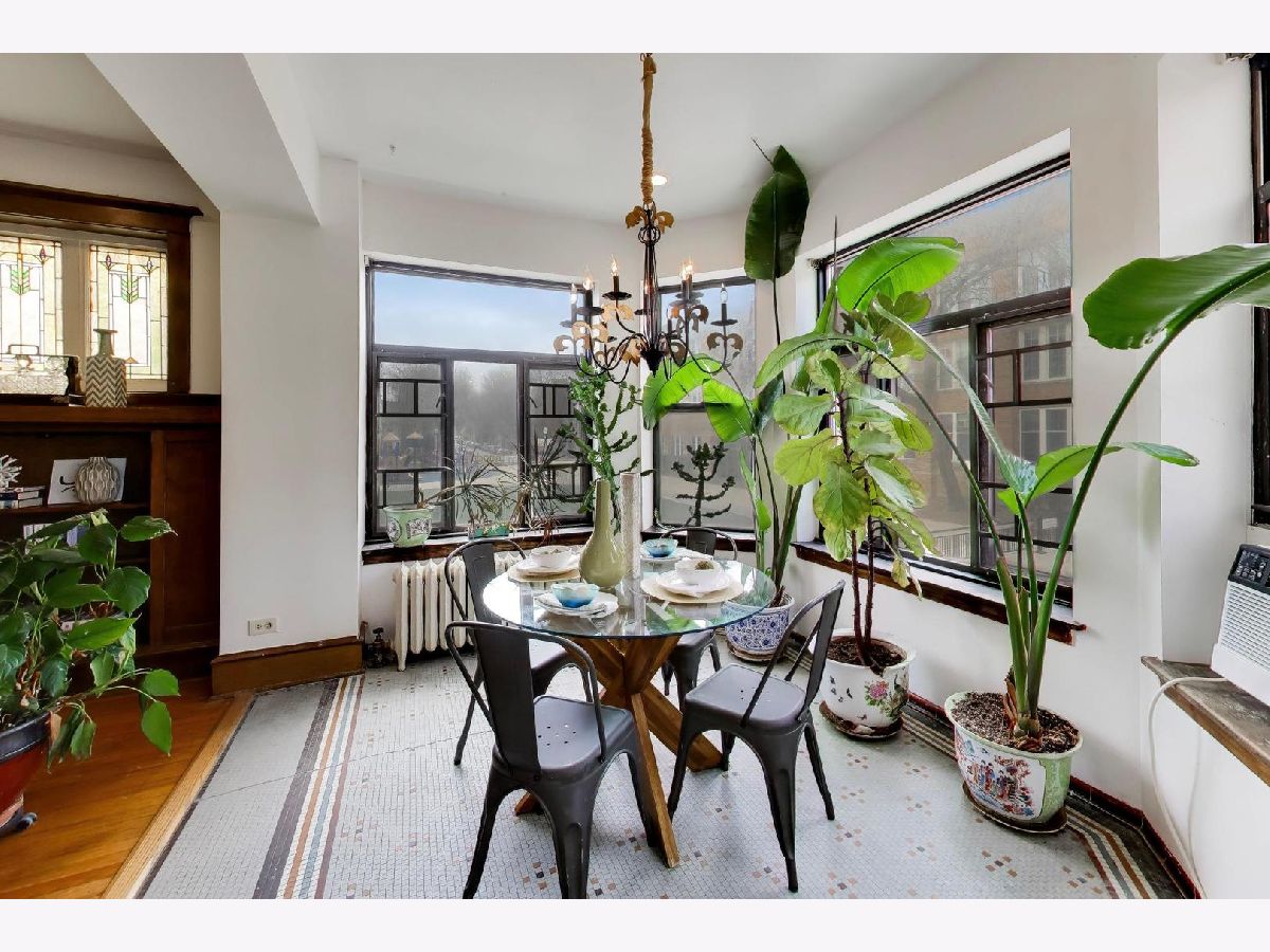 This gorgeous, sun-drenched condo is a vintage lover's dream. Located next to a park, this spacious home is light-filled, airy and boasts with 10ft tall ceilings with an open floorplan. Featuring period woodwork throughout, a lovely decorative fireplace with bookcases, and the original mosaic tile floor in the sitting/sunroom plus custom built-in bookshelves for extra storage or display space in the office/library/sitting room. The clever distribution and demarcation of areas allow for flexible use as dining room, living room, and office and is a great space for entertaining guests or unwinding with a book. The kitchen is equipped with white cabinets, a tile backsplash, and a new Bosch dishwasher (2021) and KitchenAid range and hood (2021) and has a seating area on the back deck just off it. The bathroom features custom hand painted tile and updated hardware. The large primary bedroom has the original built-in dresser and good closet space. A built-in window AC unit (2024) comfortably cools the living and dining rooms, and the unit is equipped with vents to have AC filtered throughout should the new owner wish to install a new HVAC system in the walk-in closet off the entryway. There is lots of storage, both inside the unit and out, including a huge coat closet, a walk-in closet in the second bedroom, and a dedicated storage room in the basement. Also in the basement is the building's free laundry room and storage for bikes. If you need a place for your car, great! It comes with deeded garage parking. On top of it all, you don't have to limit your green thumb to houseplants if you live here as there's a beautiful yard with a bevy of perennials plus a south-facing raised bed garden for growing veggies. It's perfectly located for commuting, with the red line one block away and the Sheridan express bus to downtown two blocks down Foster. It's also short walking distance to the lake/beach/bike path, one block to two grocery stores (Mariano's and Jewel) and an easy walk to all the restaurants, shops, and great venues in Andersonville and Uptown. The building is pet friendly, owner-occupied, and has a well-run association with ample reserves and no upcoming specials or big projects. It's a special one--don't miss it.