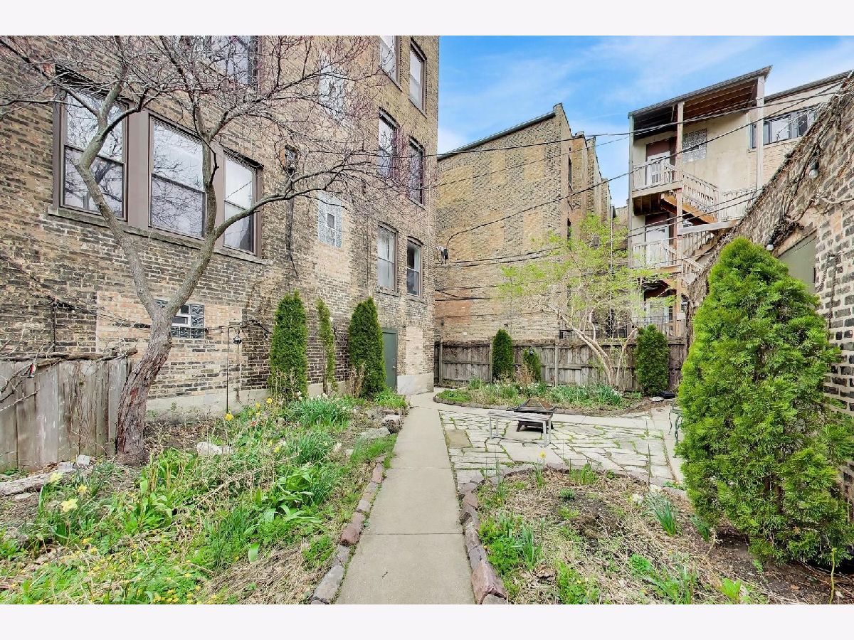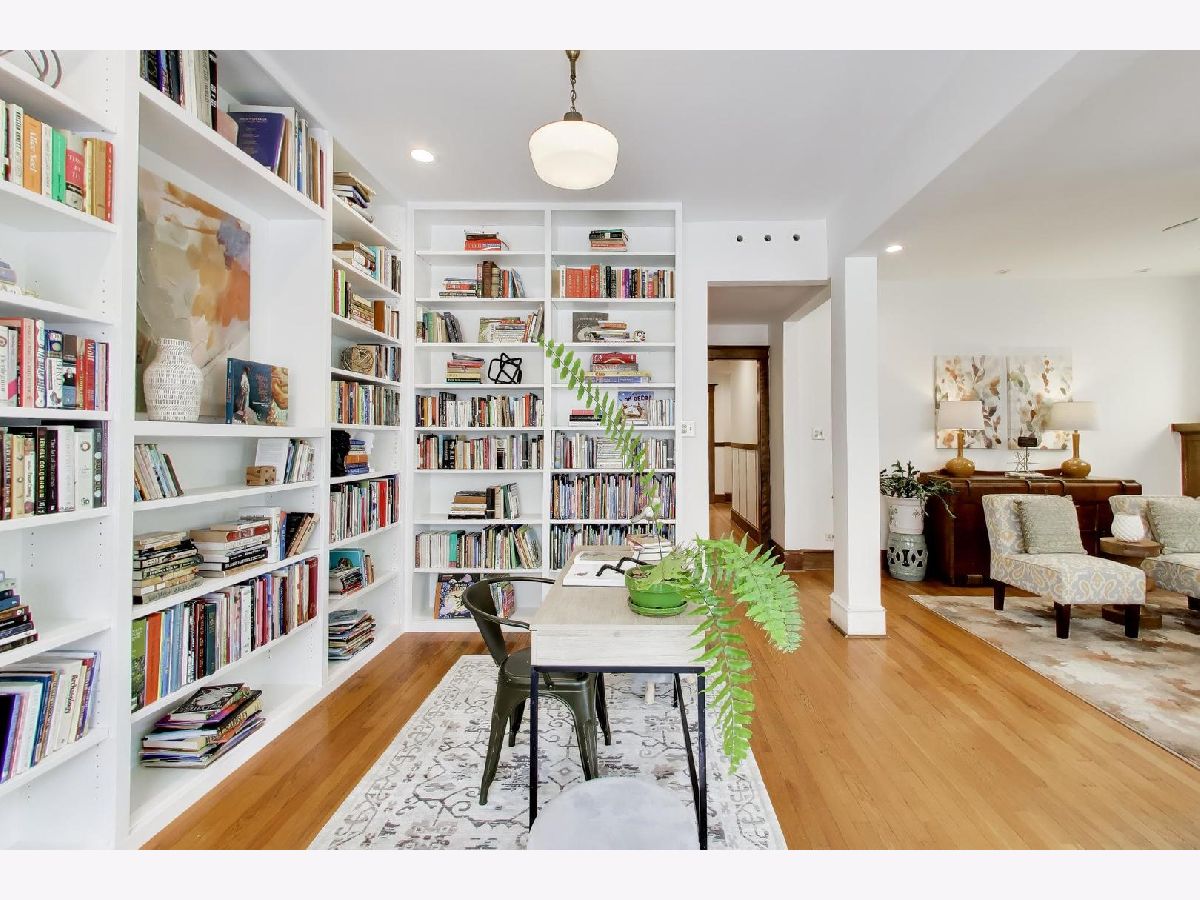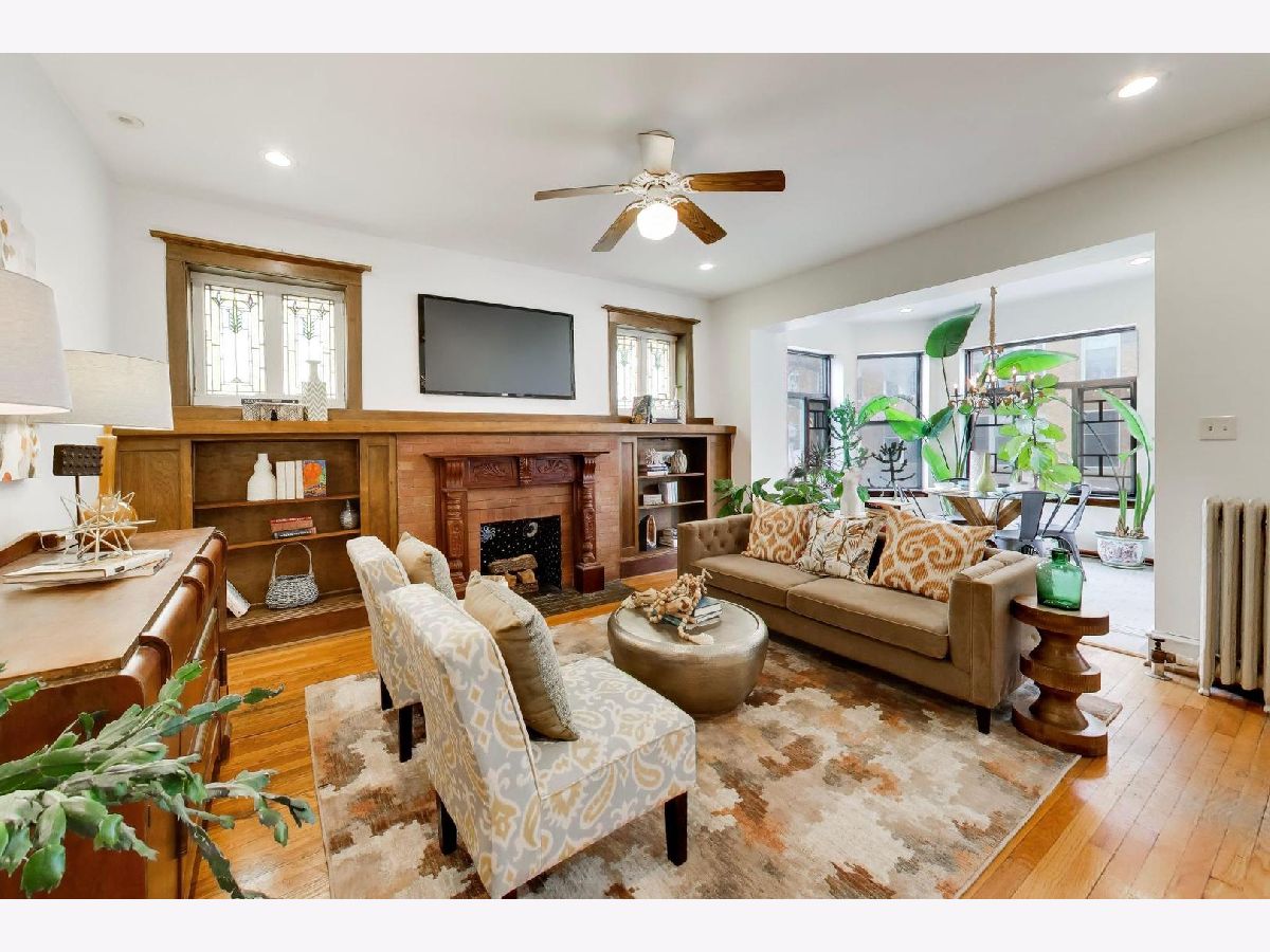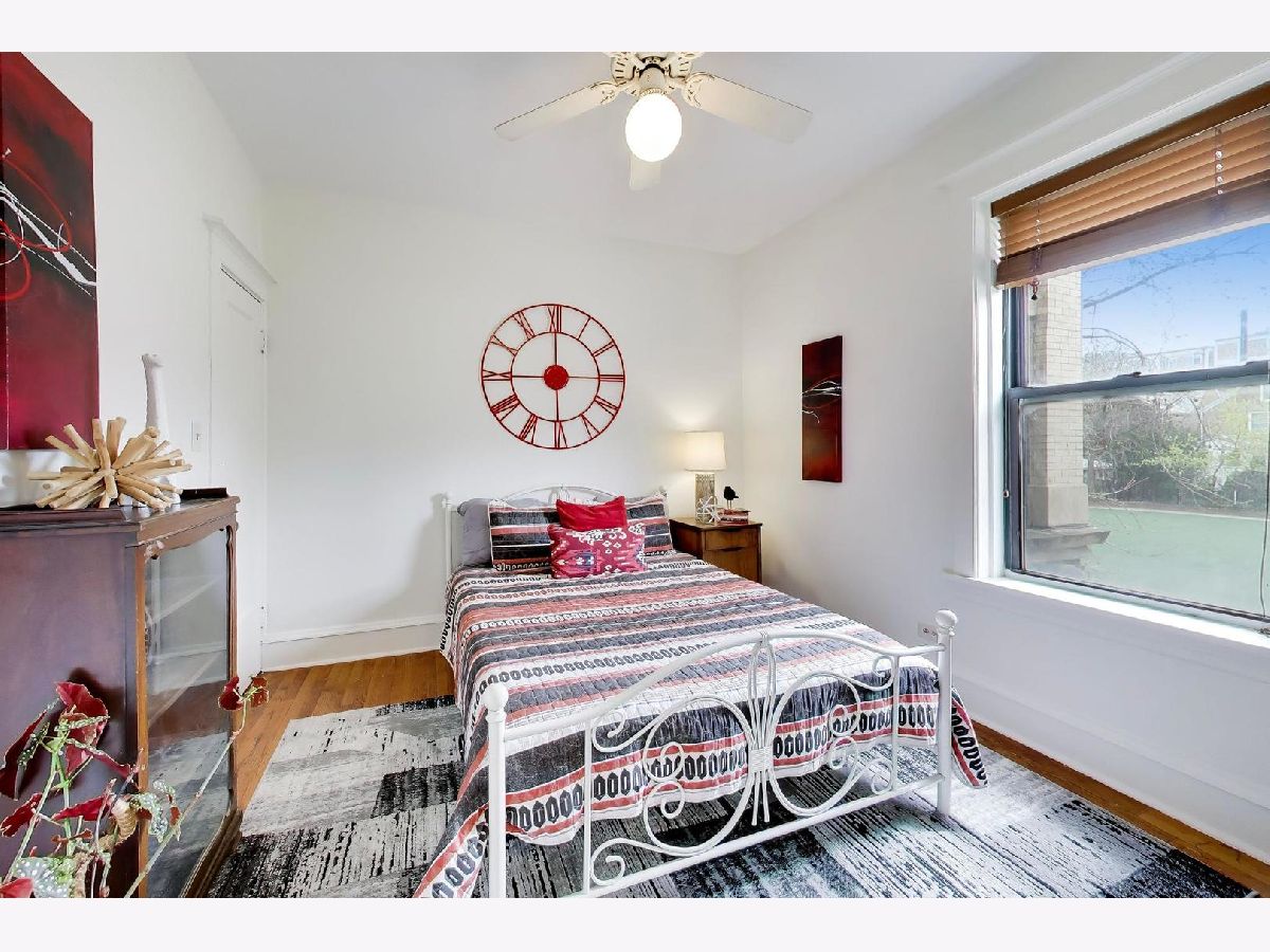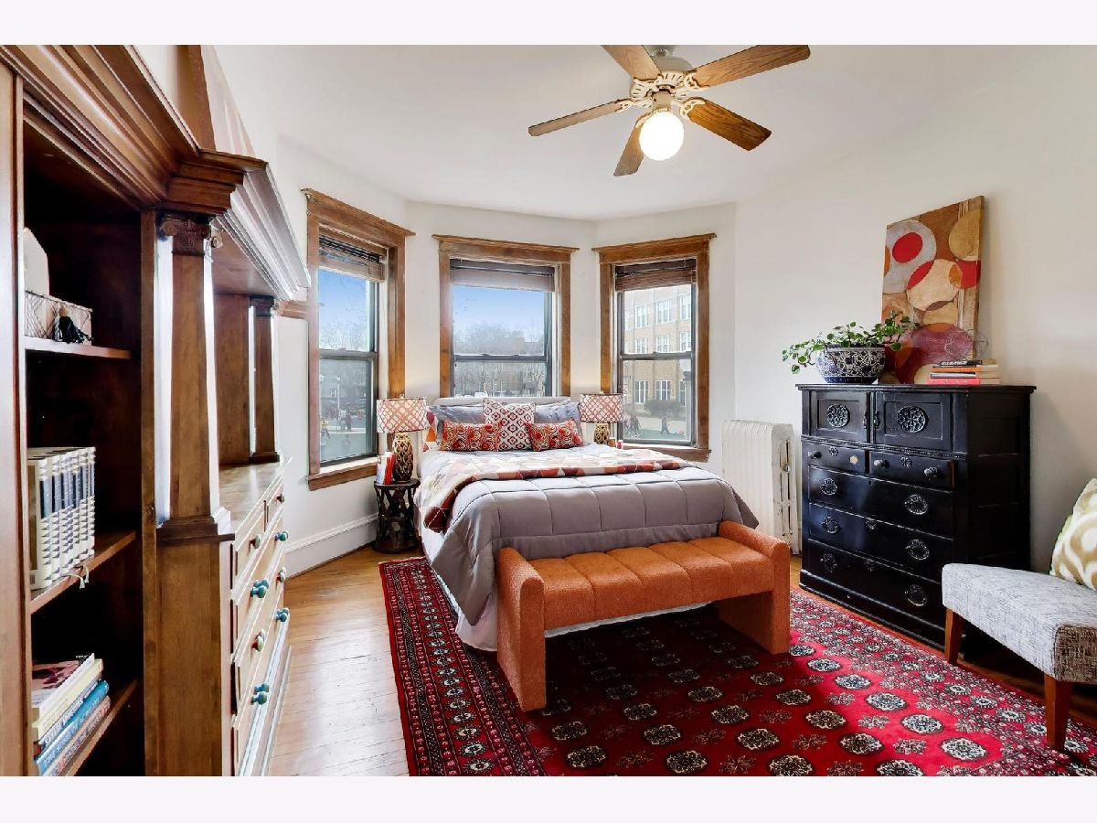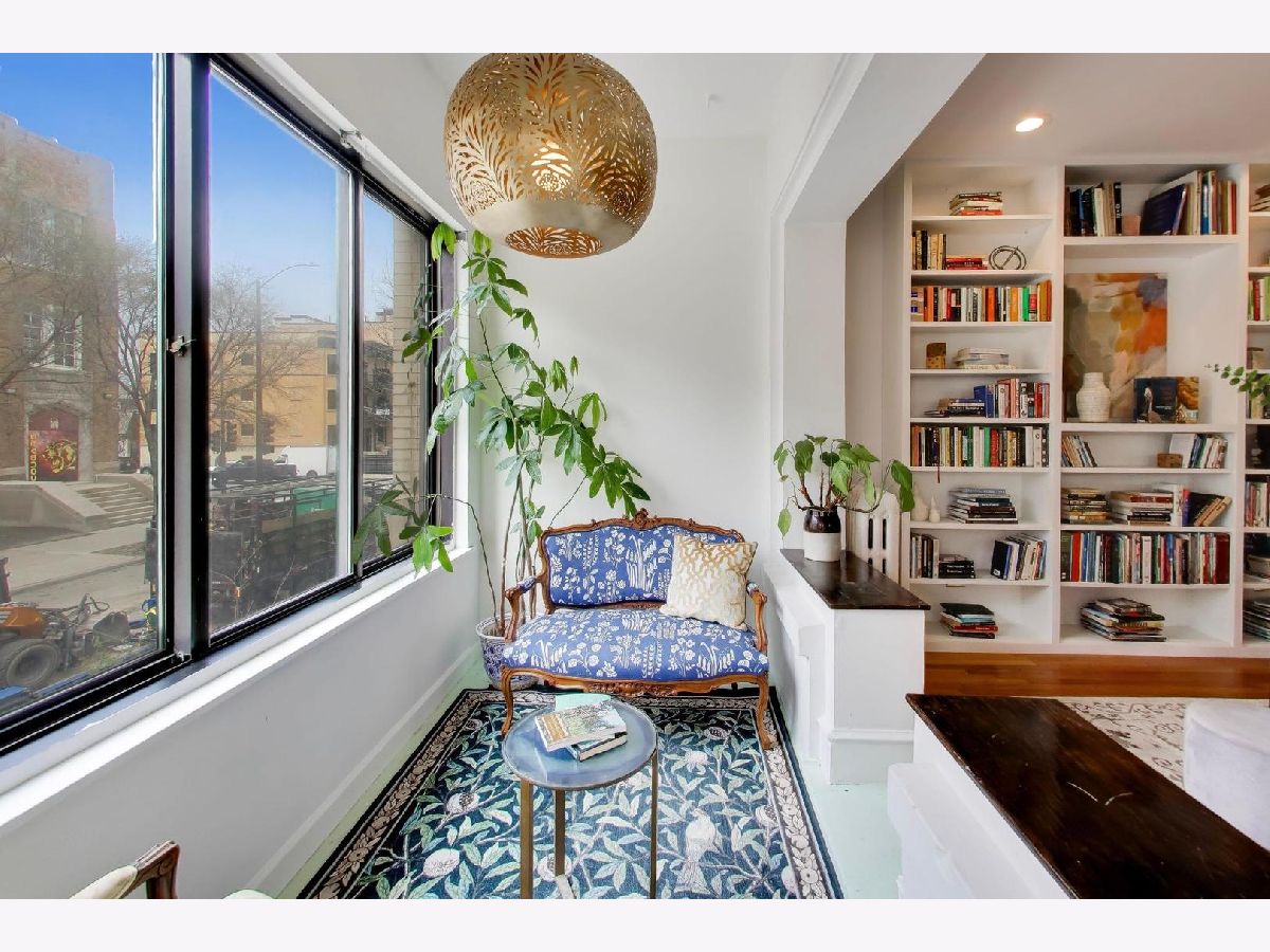 This gorgeous, sun-drenched condo is a vintage lover's dream. Located next to a park, this spacious home is light-filled, airy and boasts with 10ft tall ceilings with an open floorplan. Featuring period woodwork throughout, a lovely decorative fireplace with bookcases, and the original mosaic tile floor in the sitting/sunroom plus custom built-in bookshelves for extra storage or display space in the office/library/sitting room. The clever distribution and demarcation of areas allow for flexible use as dining room, living room, and office and is a great space for entertaining guests or unwinding with a book. The kitchen is equipped with white cabinets, a tile backsplash, and a new Bosch dishwasher (2021) and KitchenAid range and hood (2021) and has a seating area on the back deck just off it. The bathroom features custom hand painted tile and updated hardware. The large primary bedroom has the original built-in dresser and good closet space. A built-in window AC unit (2024) comfortably cools the living and dining rooms, and the unit is equipped with vents to have AC filtered throughout should the new owner wish to install a new HVAC system in the walk-in closet off the entryway. There is lots of storage, both inside the unit and out, including a huge coat closet, a walk-in closet in the second bedroom, and a dedicated storage room in the basement. Also in the basement is the building's free laundry room and storage for bikes. If you need a place for your car, great! It comes with deeded garage parking. On top of it all, you don't have to limit your green thumb to houseplants if you live here as there's a beautiful yard with a bevy of perennials plus a south-facing raised bed garden for growing veggies. It's perfectly located for commuting, with the red line one block away and the Sheridan express bus to downtown two blocks down Foster. It's also short walking distance to the lake/beach/bike path, one block to two grocery stores (Mariano's and Jewel) and an easy walk to all the restaurants, shops, and great venues in Andersonville and Uptown. The building is pet friendly, owner-occupied, and has a well-run association with ample reserves and no upcoming specials or big projects. It's a special one--don't miss it.