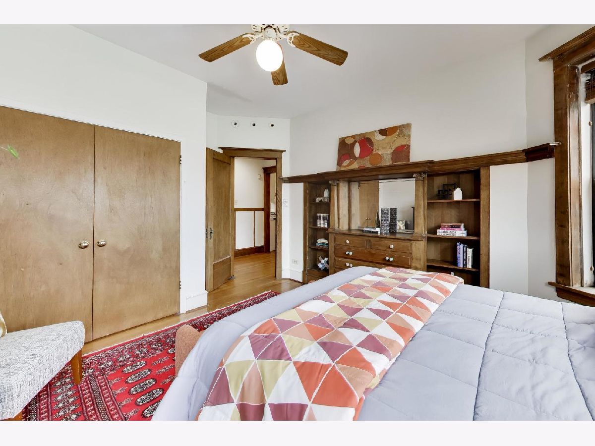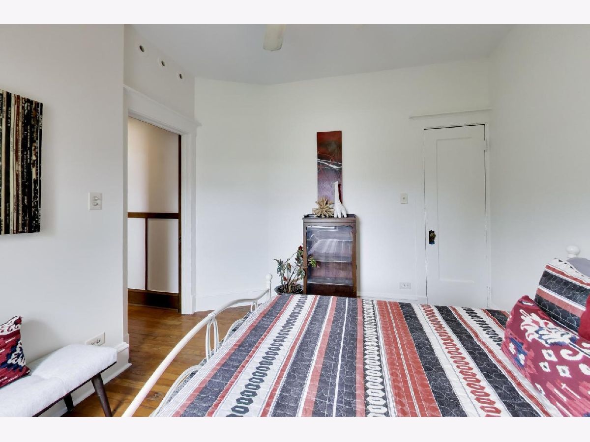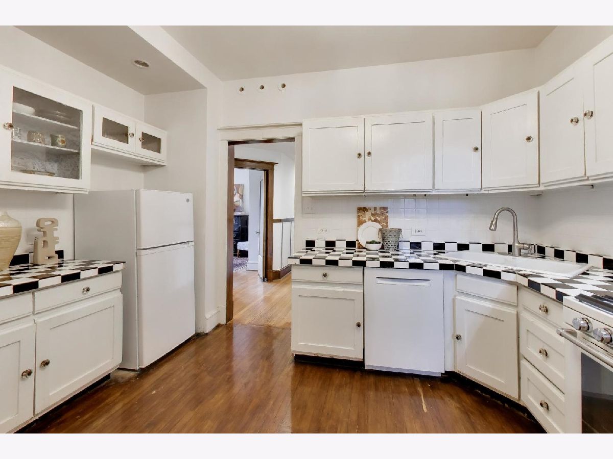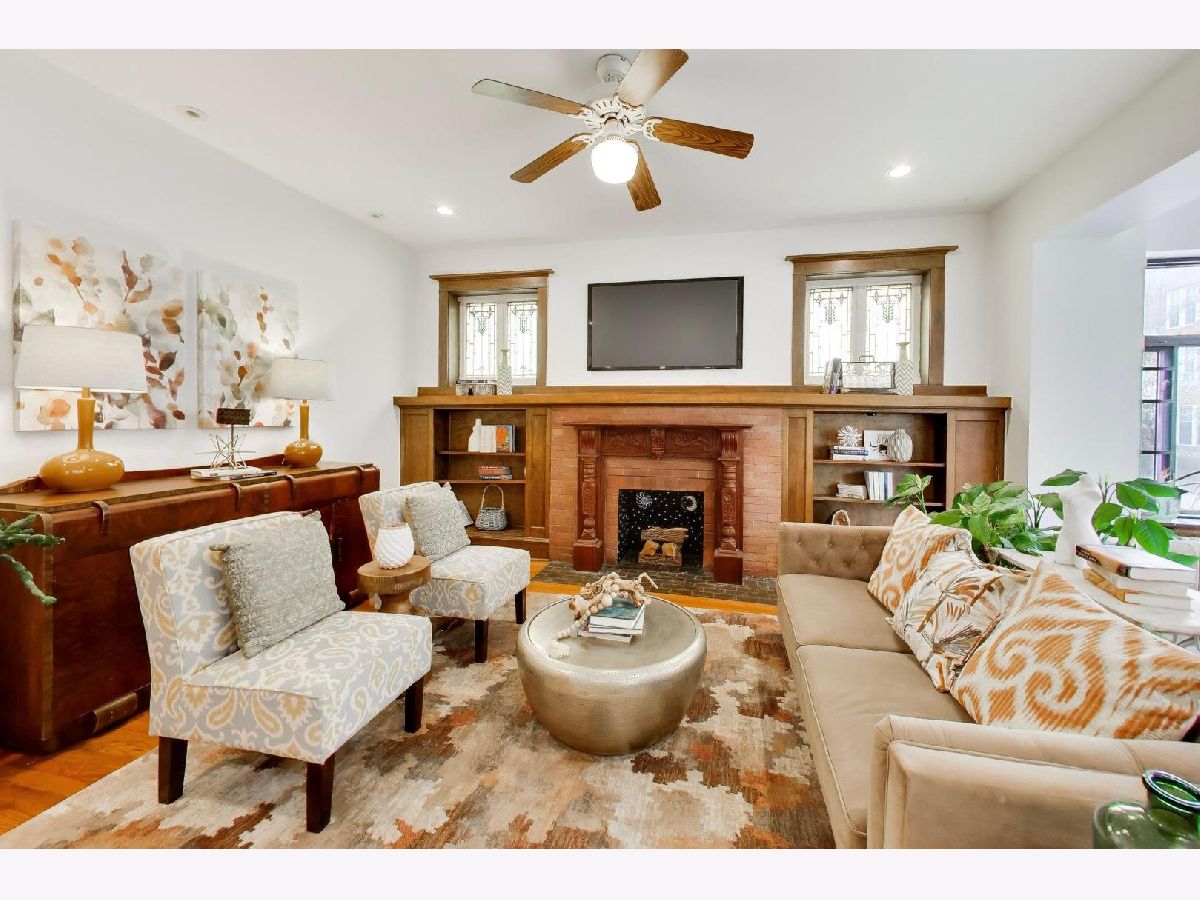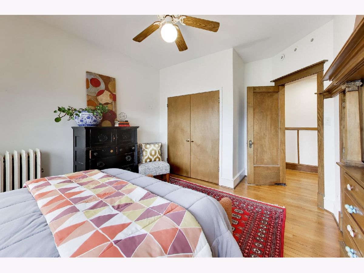 This gorgeous, sun-drenched condo is a vintage lover's dream. Located next to a park, this spacious home is light-filled, airy and boasts with 10ft tall ceilings with an open floorplan. Featuring period woodwork throughout, a lovely decorative fireplace with bookcases, and the original mosaic tile floor in the sitting/sunroom plus custom built-in bookshelves for extra storage or display space in the office/library/sitting room. The clever distribution and demarcation of areas allow for flexible use as dining room, living room, and office and is a great space for entertaining guests or unwinding with a book. The kitchen is equipped with white cabinets, a tile backsplash, and a new Bosch dishwasher (2021) and KitchenAid range and hood (2021) and has a seating area on the back deck just off it. The bathroom features custom hand painted tile and updated hardware. The large primary bedroom has the original built-in dresser and good closet space. A built-in window AC unit (2024) comfortably cools the living and dining rooms, and the unit is equipped with vents to have AC filtered throughout should the new owner wish to install a new HVAC system in the walk-in closet off the entryway. There is lots of storage, both inside the unit and out, including a huge coat closet, a walk-in closet in the second bedroom, and a dedicated storage room in the basement. Also in the basement is the building's free laundry room and storage for bikes. If you need a place for your car, great! It comes with deeded garage parking. On top of it all, you don't have to limit your green thumb to houseplants if you live here as there's a beautiful yard with a bevy of perennials plus a south-facing raised bed garden for growing veggies. It's perfectly located for commuting, with the red line one block away and the Sheridan express bus to downtown two blocks down Foster. It's also short walking distance to the lake/beach/bike path, one block to two grocery stores (Mariano's and Jewel) and an easy walk to all the restaurants, shops, and great venues in Andersonville and Uptown. The building is pet friendly, owner-occupied, and has a well-run association with ample reserves and no upcoming specials or big projects. It's a special one--don't miss it.