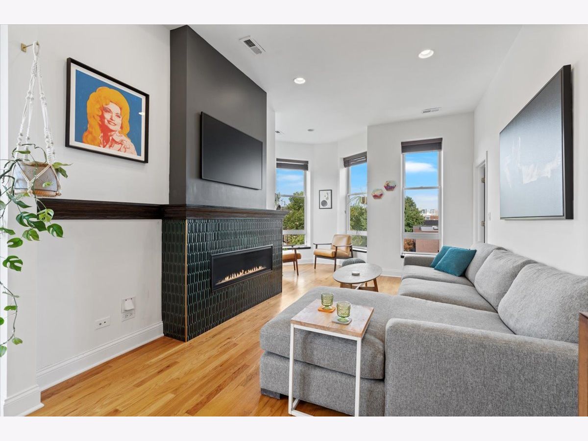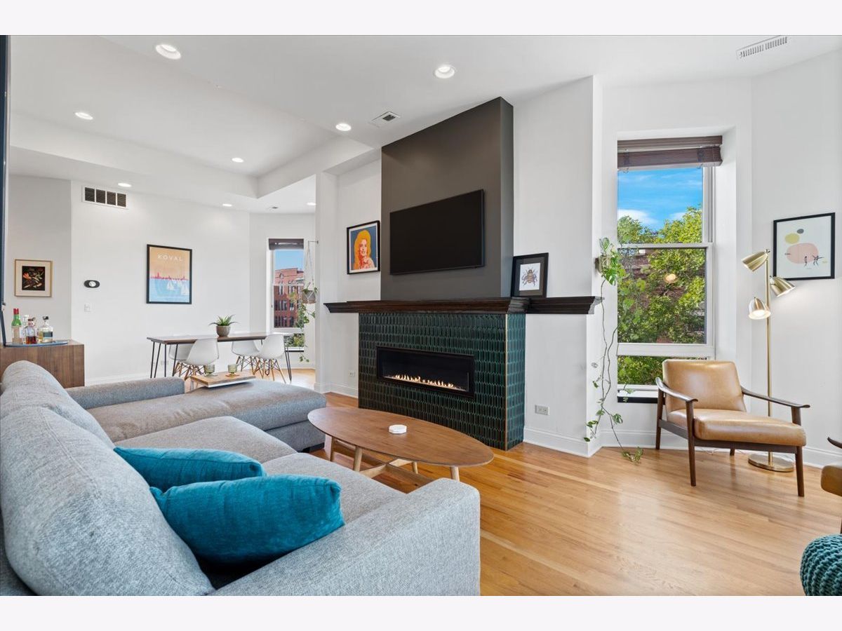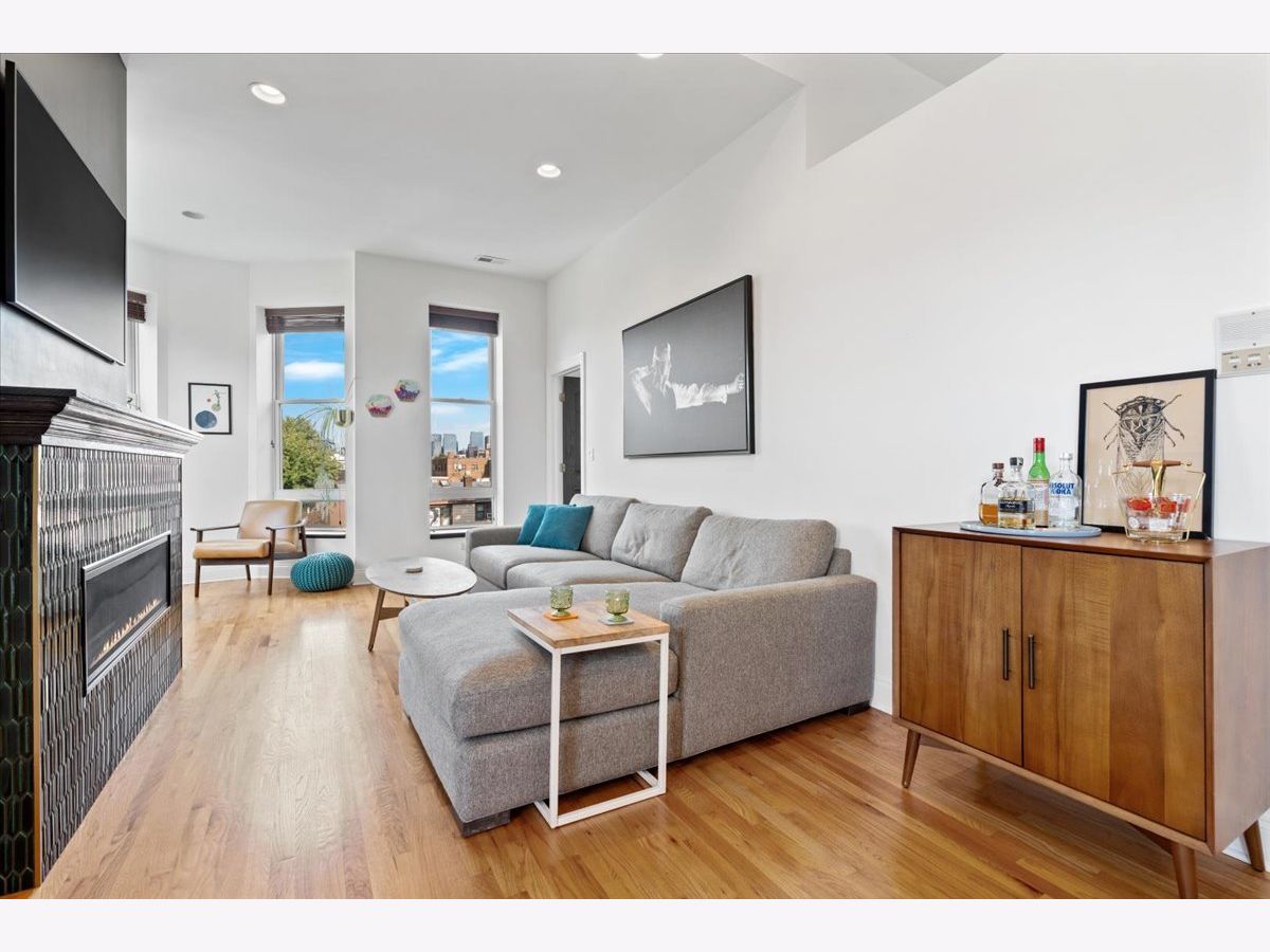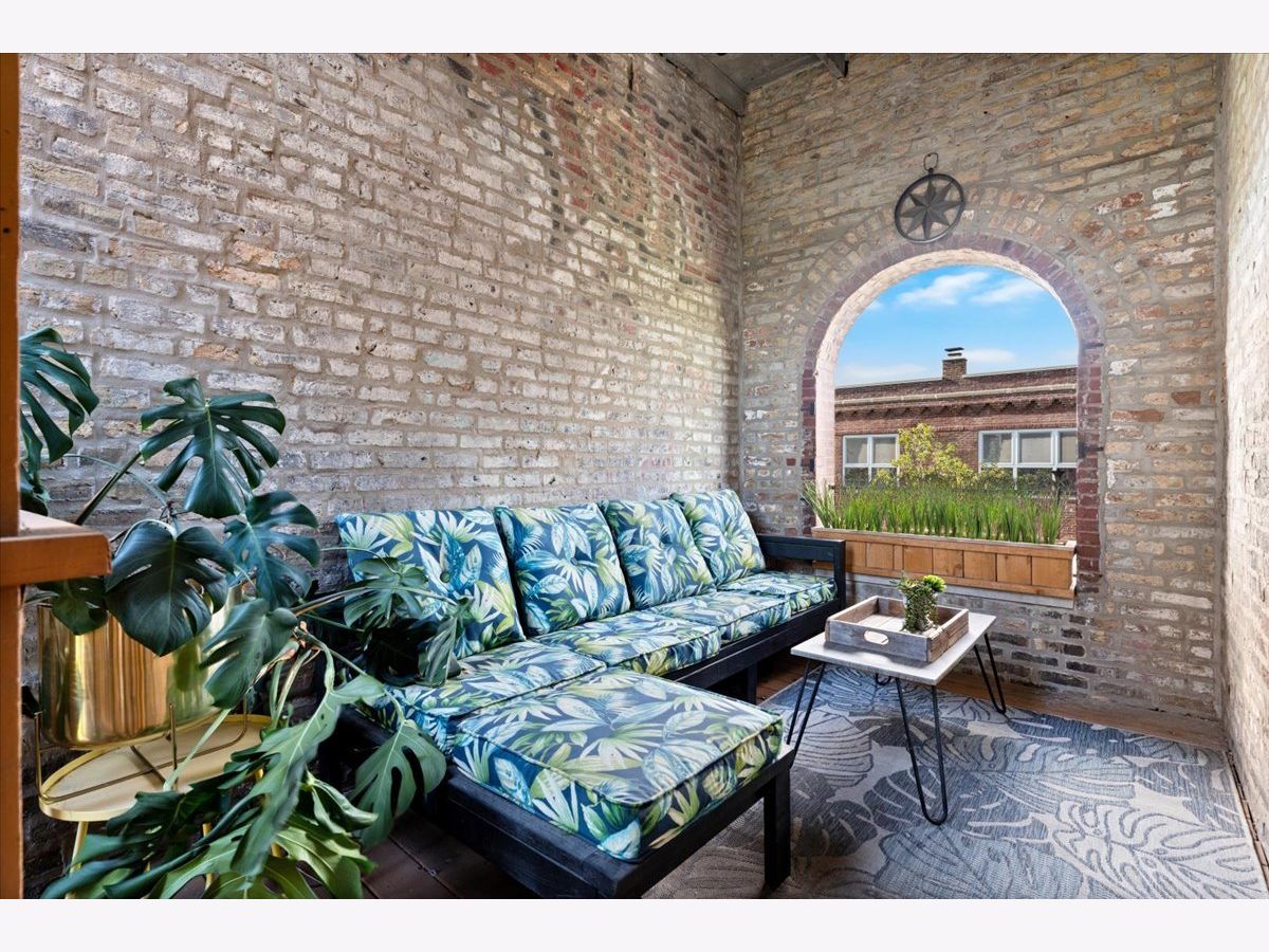 Magazine Worthy Penthouse condo in a stately 1879 building on the corner of Leavitt & Race boasts soaring, 11ft+ ceilings, skyline views & incredible light from tall windows on three sides! Enter this special home by ascending your personal (& original) staircase flooded with light from two large skylights overhead & arrive upon a wide open, 29 ft long living/ dining space anchored by a fireplace in the center & bookended by a turret with panoramic skyline views on one end & a large bay on the other. This dramatic space is magnified by the sunlight & views from 7 massive windows and the 10- 11 foot ceilings throughout. The kitchen is adjacent to the dining area & is comprised of espresso cabinets, granite counters, a beautiful green glass subway tile backsplash & a suite of newer stainless appliances. The primary bedroom enjoys tall windows, a large closet & is en suite with a marble bath featuring a double- bowl vanity, a tub/ shower combo & a large window. The guest bedroom at the opposite end of the home ensures maximum privacy for owner & guests alike. This bedroom has a large step-in closet & two windows with panoramic skyline views! The guest bath includes a marble- clad walk- in shower. A gallery hall leads past the primary suite to a large, covered deck with three brick walls punctuated by a massive arched opening with an antique iron railing that would not be out of place in Tuscany! This is an incredible space to entertain and relax right off your home. Price includes a convenient, assigned parking space via a curb cut (no need to drive down an alley) as well as shared storage in the basement. New furnace in 2022. New AC in 2021. New stainless appliance suite in May 2022. Steps to the Metra and all the dining, shopping and nightlife options on Chicago, Grand & Western!