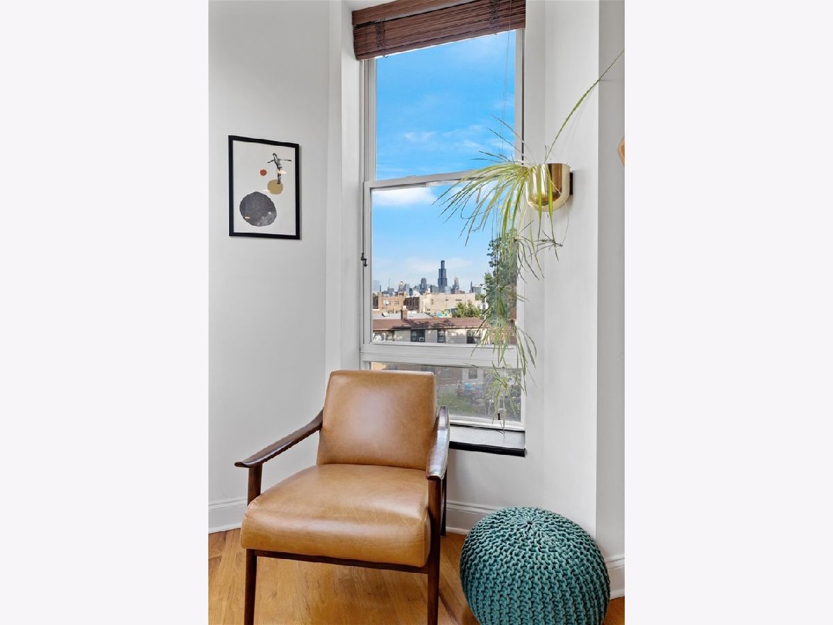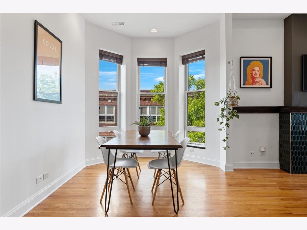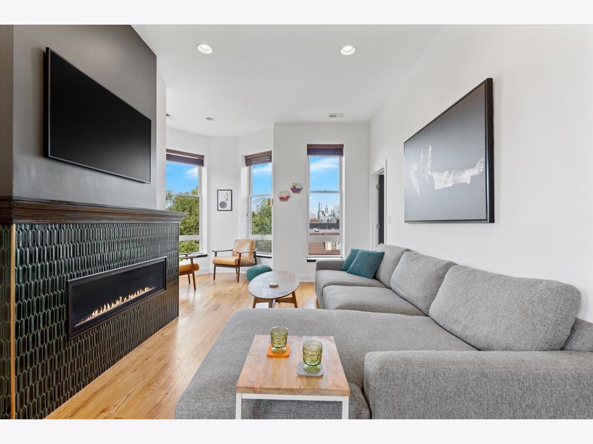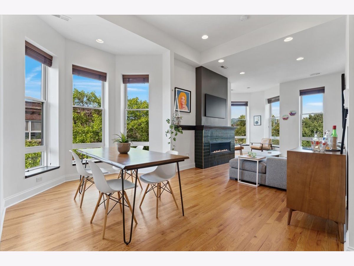 Magazine Worthy Penthouse condo in a stately 1879 building on the corner of Leavitt & Race boasts soaring, 11ft+ ceilings, skyline views & incredible light from tall windows on three sides! Enter this special home by ascending your personal (& original) staircase flooded with light from two large skylights overhead & arrive upon a wide open, 29 ft long living/ dining space anchored by a fireplace in the center & bookended by a turret with panoramic skyline views on one end & a large bay on the other. This dramatic space is magnified by the sunlight & views from 7 massive windows and the 10- 11 foot ceilings throughout. The kitchen is adjacent to the dining area & is comprised of espresso cabinets, granite counters, a beautiful green glass subway tile backsplash & a suite of newer stainless appliances. The primary bedroom enjoys tall windows, a large closet & is en suite with a marble bath featuring a double- bowl vanity, a tub/ shower combo & a large window. The guest bedroom at the opposite end of the home ensures maximum privacy for owner & guests alike. This bedroom has a large step-in closet & two windows with panoramic skyline views! The guest bath includes a marble- clad walk- in shower. A gallery hall leads past the primary suite to a large, covered deck with three brick walls punctuated by a massive arched opening with an antique iron railing that would not be out of place in Tuscany! This is an incredible space to entertain and relax right off your home. Price includes a convenient, assigned parking space via a curb cut (no need to drive down an alley) as well as shared storage in the basement. New furnace in 2022. New AC in 2021. New stainless appliance suite in May 2022. Steps to the Metra and all the dining, shopping and nightlife options on Chicago, Grand & Western!