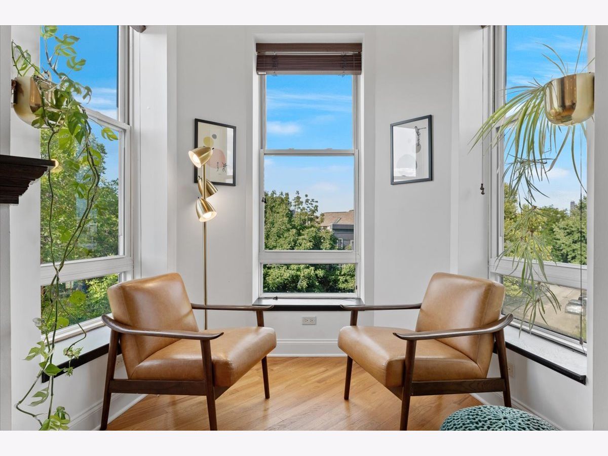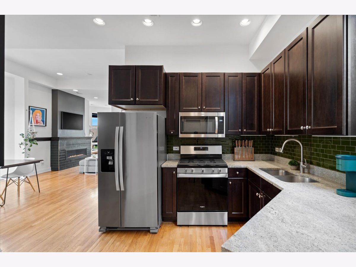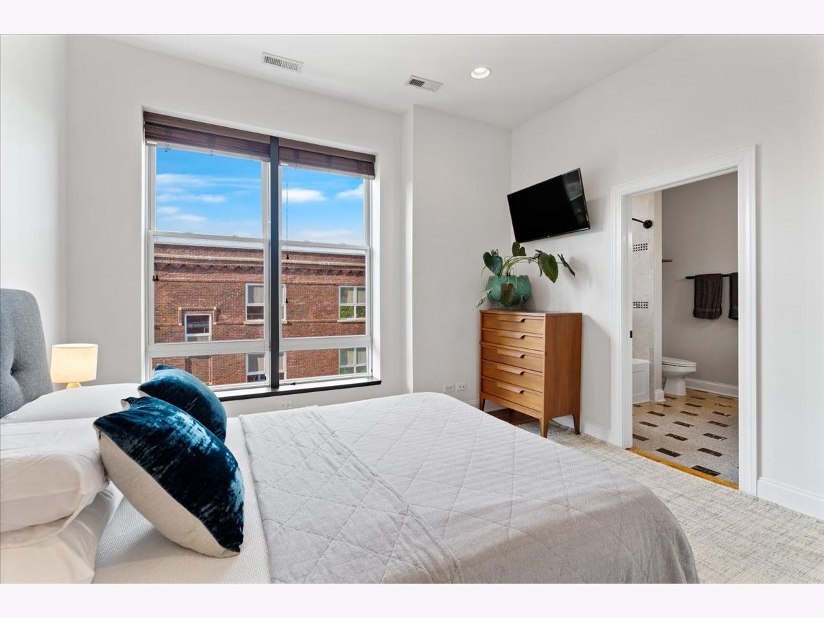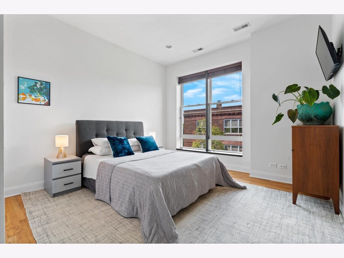 Magazine Worthy Penthouse condo in a stately 1879 building on the corner of Leavitt & Race boasts soaring, 11ft+ ceilings, skyline views & incredible light from tall windows on three sides! Enter this special home by ascending your personal (& original) staircase flooded with light from two large skylights overhead & arrive upon a wide open, 29 ft long living/ dining space anchored by a fireplace in the center & bookended by a turret with panoramic skyline views on one end & a large bay on the other. This dramatic space is magnified by the sunlight & views from 7 massive windows and the 10- 11 foot ceilings throughout. The kitchen is adjacent to the dining area & is comprised of espresso cabinets, granite counters, a beautiful green glass subway tile backsplash & a suite of newer stainless appliances. The primary bedroom enjoys tall windows, a large closet & is en suite with a marble bath featuring a double- bowl vanity, a tub/ shower combo & a large window. The guest bedroom at the opposite end of the home ensures maximum privacy for owner & guests alike. This bedroom has a large step-in closet & two windows with panoramic skyline views! The guest bath includes a marble- clad walk- in shower. A gallery hall leads past the primary suite to a large, covered deck with three brick walls punctuated by a massive arched opening with an antique iron railing that would not be out of place in Tuscany! This is an incredible space to entertain and relax right off your home. Price includes a convenient, assigned parking space via a curb cut (no need to drive down an alley) as well as shared storage in the basement. New furnace in 2022. New AC in 2021. New stainless appliance suite in May 2022. Steps to the Metra and all the dining, shopping and nightlife options on Chicago, Grand & Western!