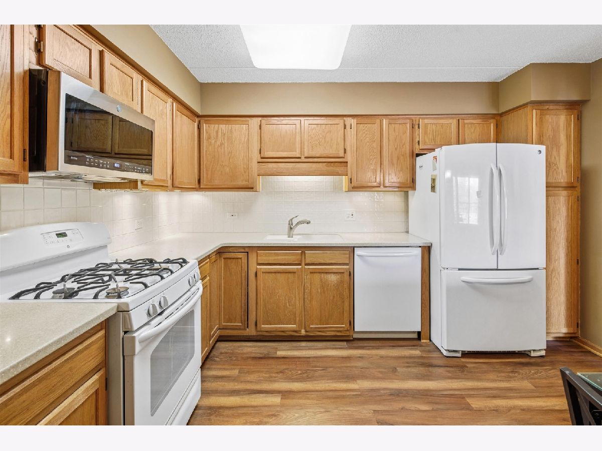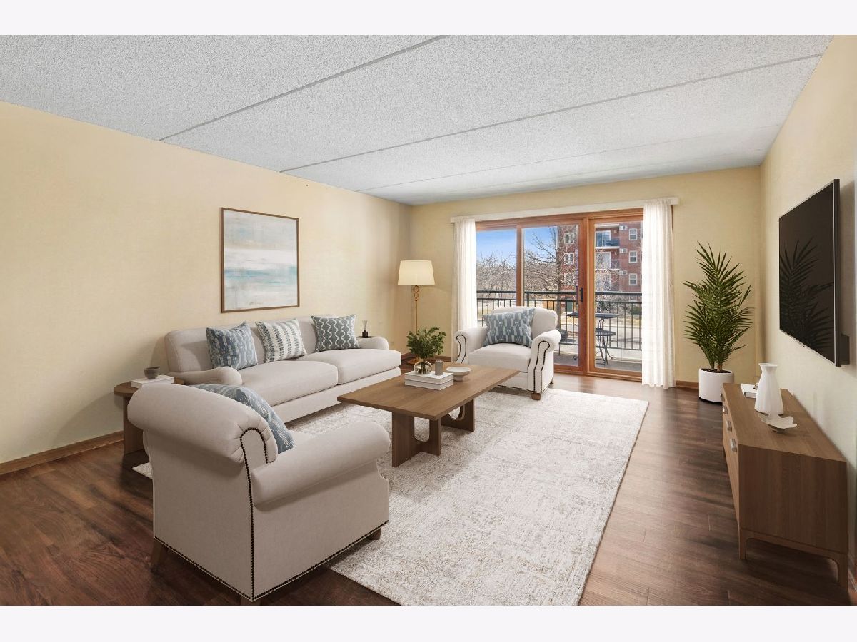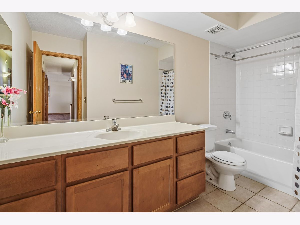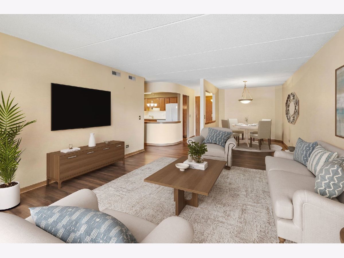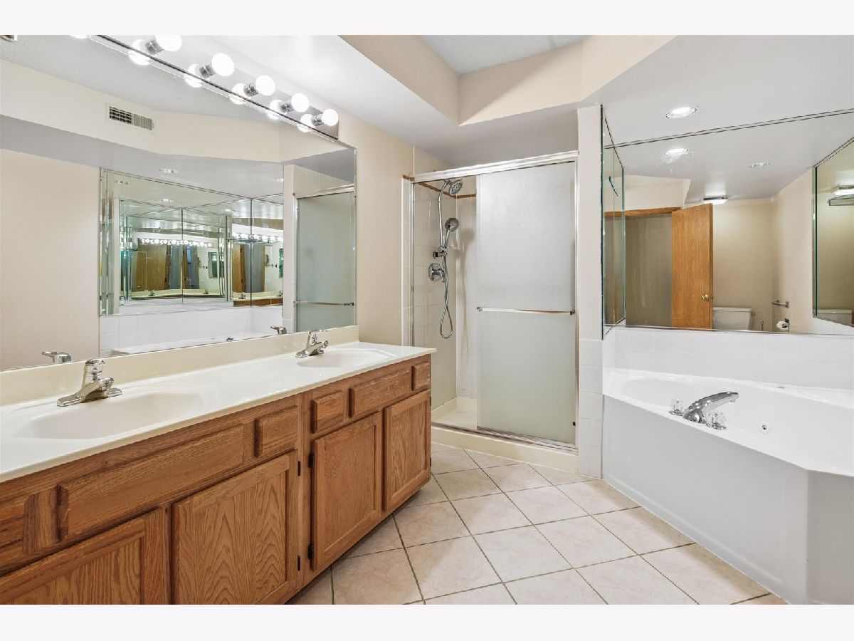 Experience the serenity of Rivers Edge Terrace! This spacious 2-bedroom, 2-bath condo boasts brand-new LVT flooring and a light-filled, open layout. The living and formal dining areas flow seamlessly, with sliding doors leading to a 16x6 covered balcony offering picturesque views of the fountain and pond. The charming eat-in kitchen features ample oak cabinetry, Corian countertops, a large pantry, and a new microwave. The luxurious primary suite includes a double vanity, whirlpool tub, separate shower, and an expansive walk-in cedar closet! Nice sized second bedroom currently used as an office. Full second bath for guests.. In-unit laundry room with full-size washer and dryer. Enjoy the convenience of a heated garage space (#51) with an adjacent large storage closet. This beautifully maintained elevator building recently received a new roof and a new A/C compressor for this unit. Nestled in a serene, suburban-like setting within the city, you'll love the easy access to Labagh Woods trails, grocery stores, shopping, dining, restaurants and more! Your monthly assessments cover heat, gas,water, basic cable and professional management of beautiful grounds.Easy access to Jewel, Target,Starbucks, 94 xway and Foster/Pulaski bus lines.