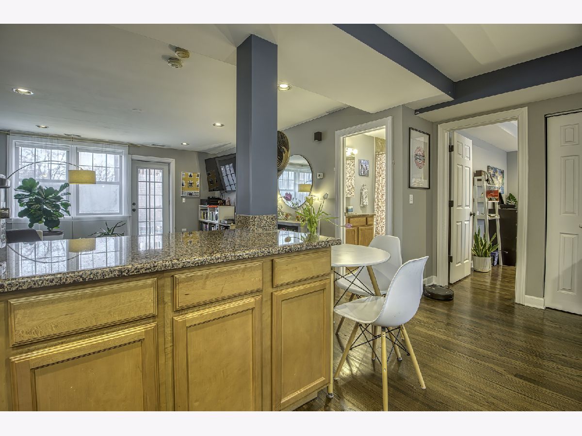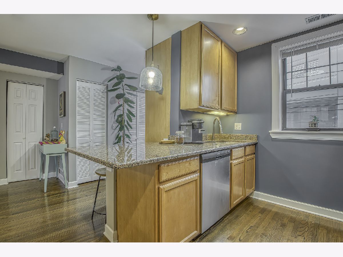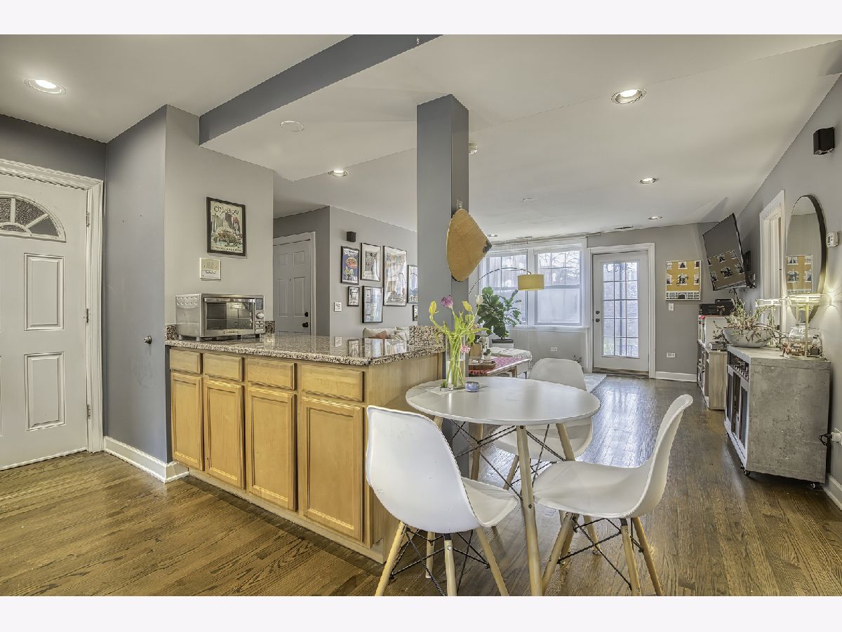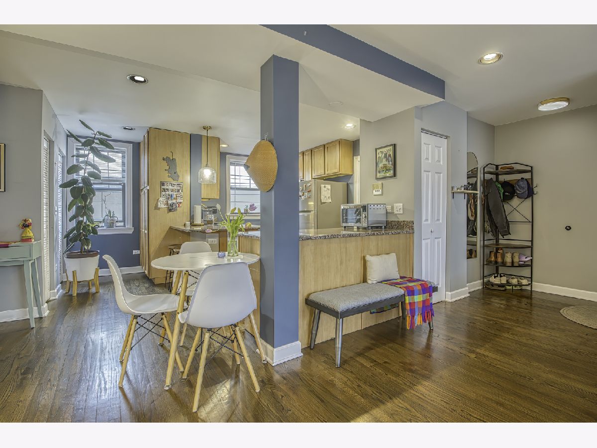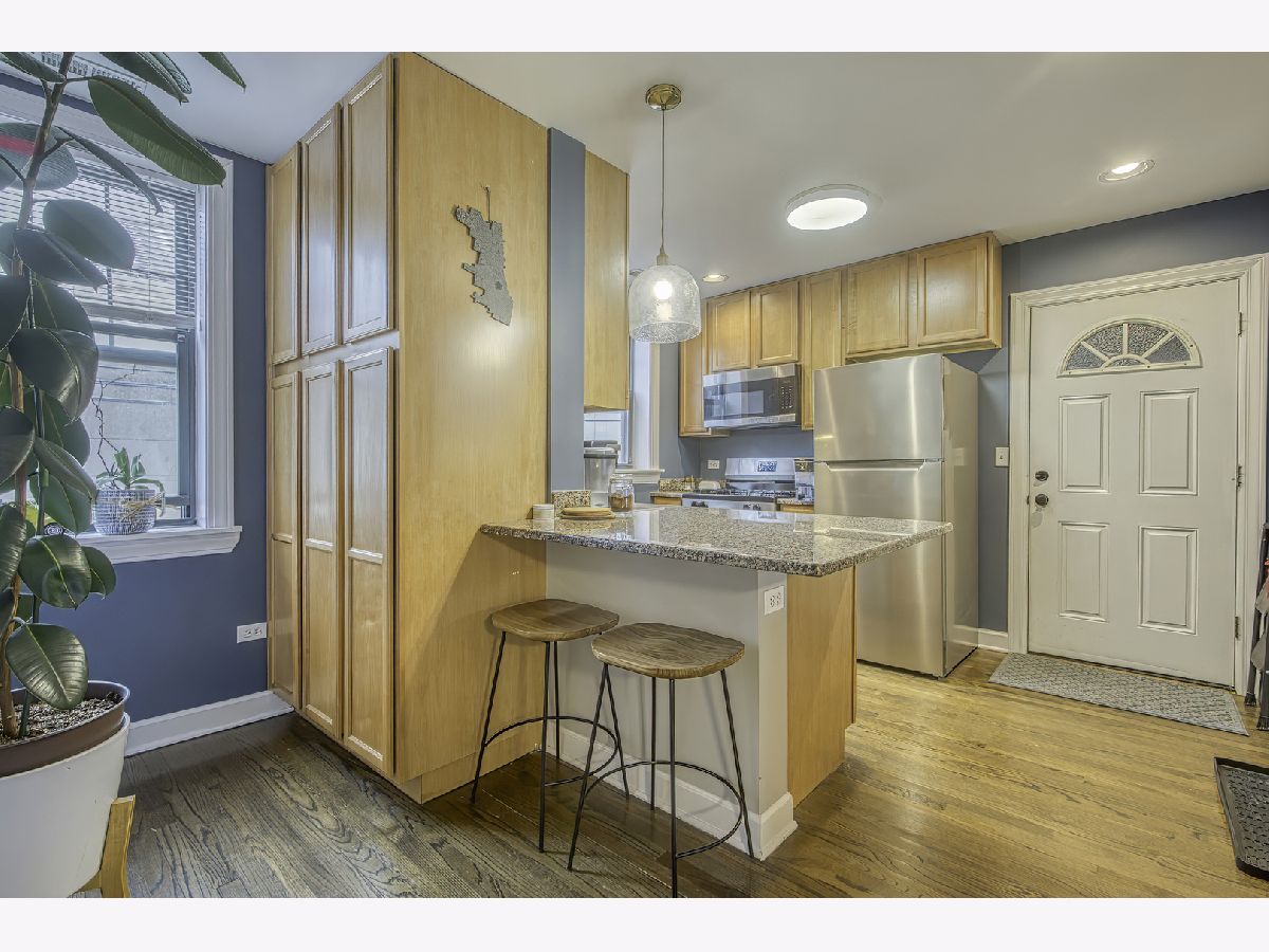 Warm and inviting high first-floor condo with hardwood floors throughout and great natural light. The kitchen has excellent counter space and tons of storage, along with granite counters, a breakfast bar, and a small eat-in area. The spacious living room opens to a private balcony. A split-bedroom floor plan gives both bedrooms privacy, while the primary suite features a beautifully renovated bath completed in 2025. Recent improvements include new kitchen appliances, furnace, lighting, and garbage disposal in 2025, washer/dryer in 2024, and a renovated main bath in 2025, making this feel like an easy move. Two exterior parking spaces, storage, and bike storage included. Located close to Tony's, Half Acre, Lincoln Square, Andersonville, Winnemac Park, Legion Park, the Western Brown Line, and both the Ravenswood and Peterson Metra. MULTIPLE OFFERS RECEIVED - H&B DUE BY MONDAY 4/20 AT 4:00