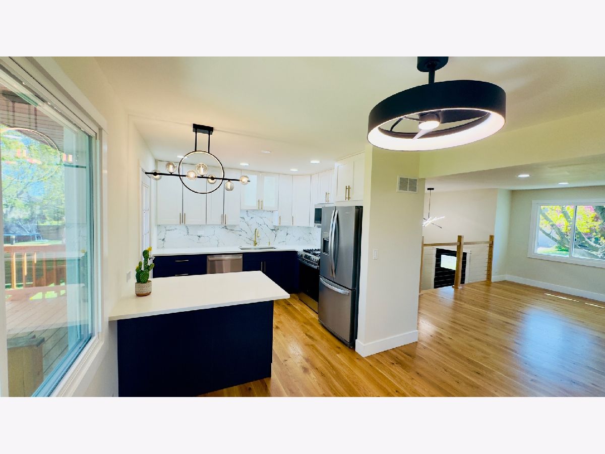Welcome to this completely remodeled and spacious 5-bedroom raised ranch, located in the highly sought-after Grade School District 34 and High School District 117. Nestled in the desirable Seven Hills neighborhood, this home is surrounded by mature trees and offers a peaceful, family-friendly setting. The property features a large deck and a fully fenced backyard-perfect for entertaining, relaxing, or outdoor play. Step inside to a bright and inviting living room highlighted by a large picture window. The living room flows seamlessly into the dining area and beautifully updated kitchen, creating an ideal layout for everyday living. The main level offers three generously sized bedrooms and a full bathroom. The finished lower level provides additional living space with a spacious family room featuring a fireplace, two additional bedrooms, a full bathroom, and a versatile laundry and storage area with ample space. Complete rehabilitation includes: All new windows and roof New hardwood flooring throughout Fully remodeled bathrooms Brand-new kitchen with quartz countertops and stainless-steel appliances Additional features include a one-car detached garage, large deck, and finished basement. Conveniently located near I-94, with easy access to Gurnee Mills shopping, dining, and entertainment-just minutes away. Move-in ready and beautifully updated-this home offers space, comfort, and an unbeatable location.