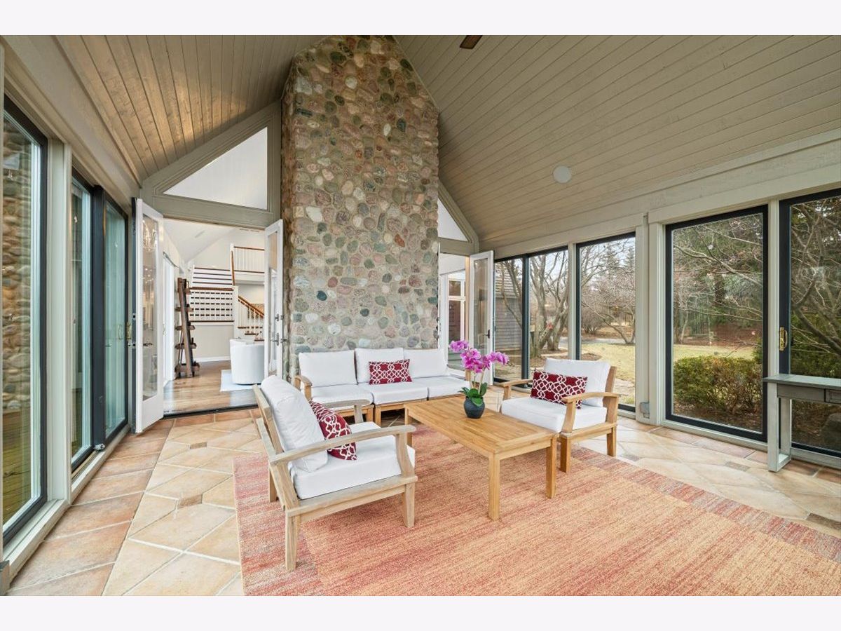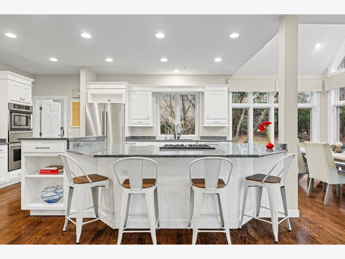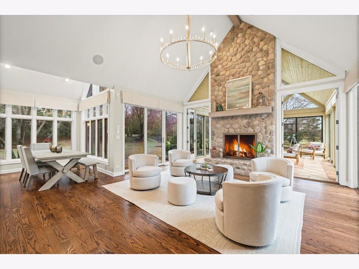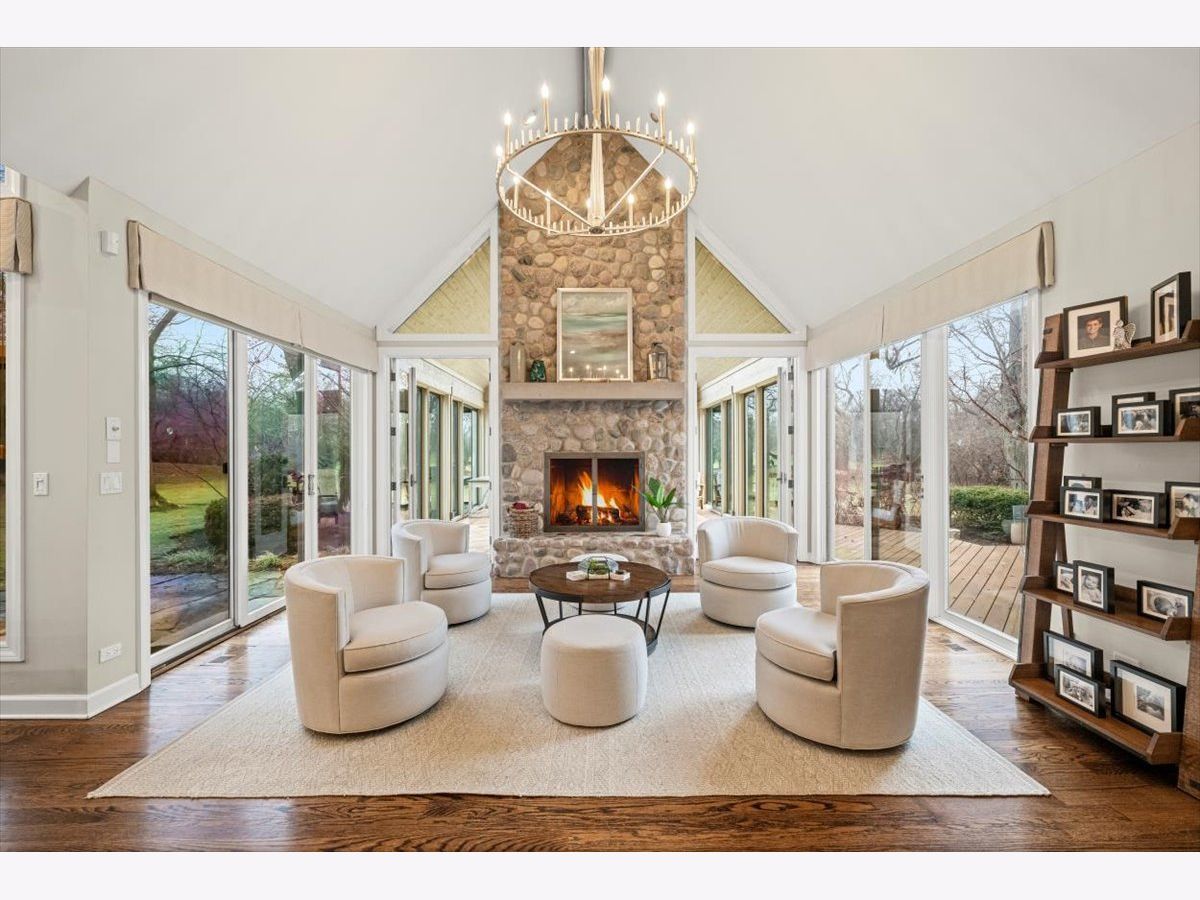 Striking Nantucket-style home set on a beautifully landscaped, private 1.5-acre lot in highly desirable Lake Forest, offering timeless curb appeal and a serene setting within the top ranked Lake Forest High School and Everett Elementary School district. A covered front porch and charming window boxes create a warm, welcoming first impression and classic North Shore appeal. Inside, vaulted ceilings, elegant 8-foot doors, and hardwood floors throughout enhance a grand, open floor plan ideal for entertaining. Expansive floor-to-ceiling windows flood the home with natural light, creating bright, inviting living spaces with seamless flow. The kitchen is the heart of the home, featuring custom Wood-Mode cabinetry, a large center island with breakfast bar, and a walk-in pantry. It opens to an inviting family room anchored by a dramatic stone fireplace-perfect for everyday living and gatherings. Just beyond, the sunroom offers radiant heated floors and three walls of expansive sliding glass doors, blending indoor and outdoor living and providing an ideal space for family time and entertaining. The main-level primary suite serves as a peaceful retreat with a spa-inspired bath including heated floors, a jacuzzi tub, separate shower, and walk-in closet. A private first-floor office offers excellent flexibility for remote work, study space, or a playroom. The second level features three generously sized bedrooms, a loft area, and two full bathrooms, offering ample space for family and guests. The finished lower level expands the living area with a temperature-controlled wine room, recreation space, exercise area, and abundant storage-ideal for growing families and active lifestyles. Additional highlights include a heated three-car garage, new roof (2023), and freshly painted exterior (2025). Ideally located near Metra service, highway access, shopping, award-winning Lake Forest schools, Conway Farms Golf Club, and Northwestern Medicine Lake Forest Hospital. A rare opportunity to own a move-in-ready luxury home with abundant land in Lake Forest - offering space, privacy, and timeless design in one of the North Shore's most sought-after communities.