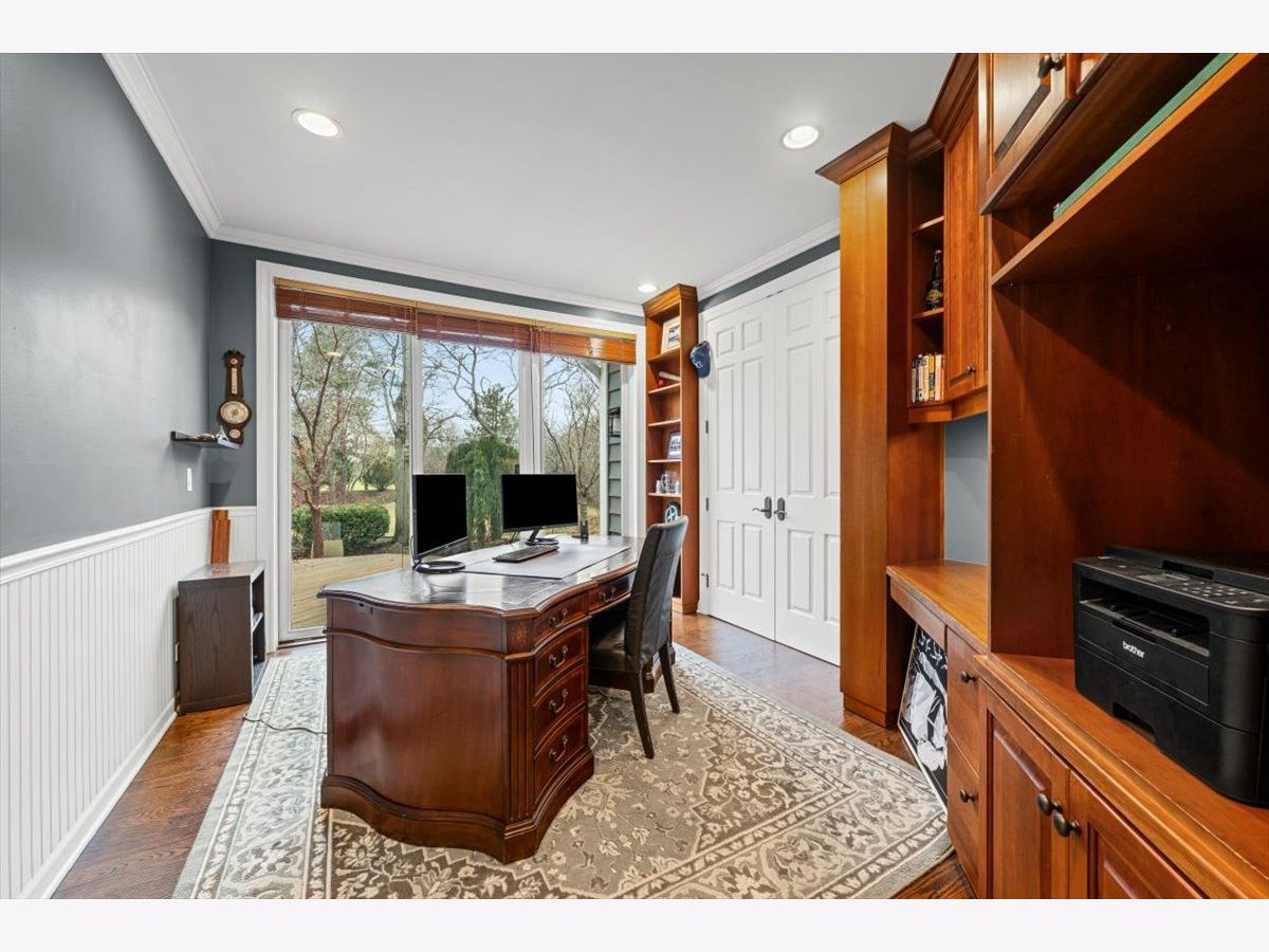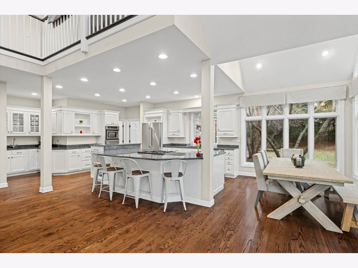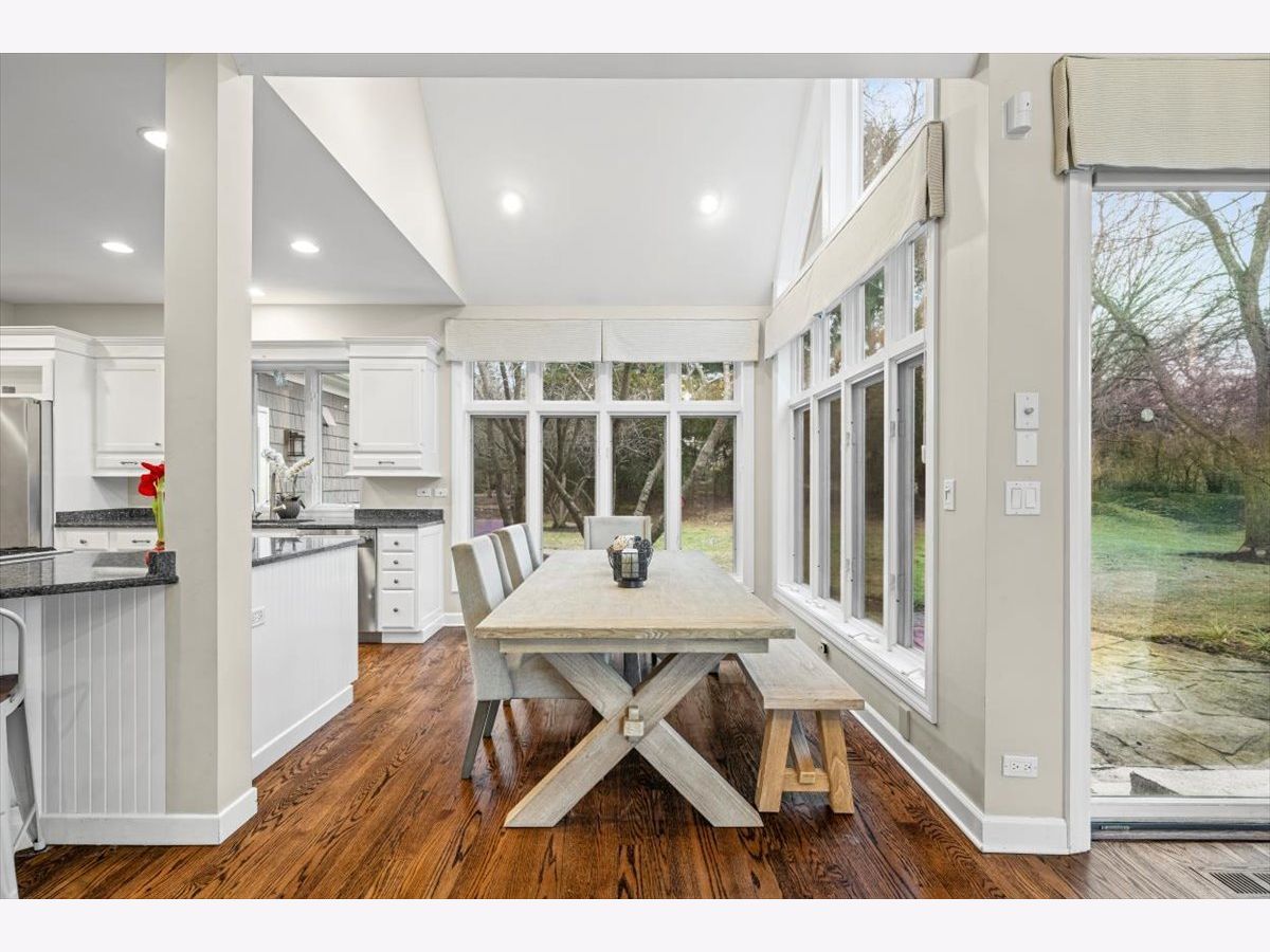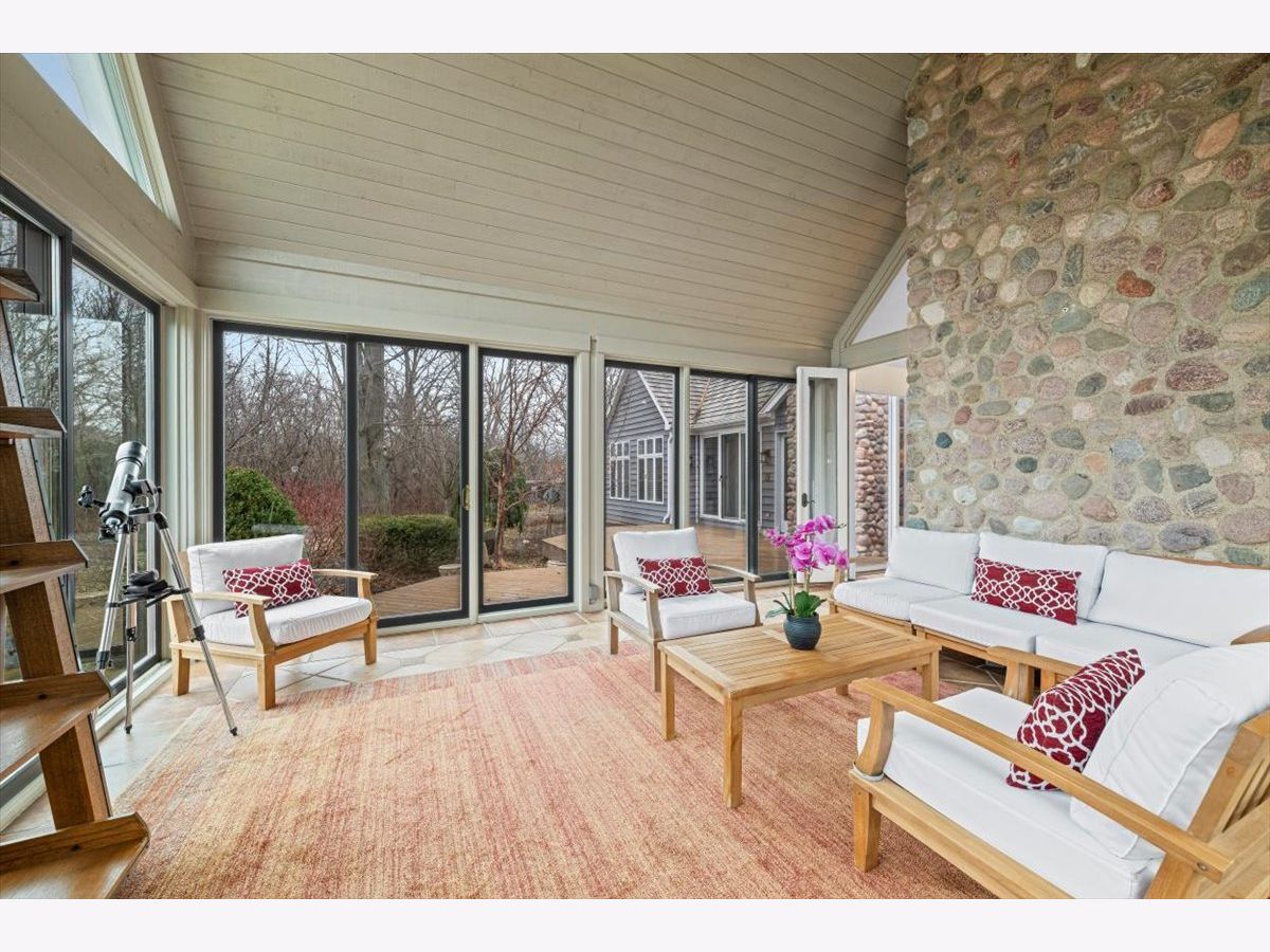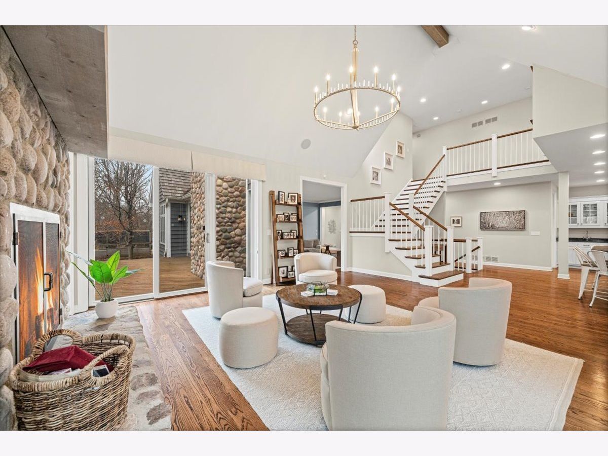Striking Nantucket-style home set on a beautifully landscaped, private 1.5-acre lot in highly desirable Lake Forest, offering timeless curb appeal and a serene setting within the top ranked Lake Forest High School and Everett Elementary School district. A covered front porch and charming window boxes create a warm, welcoming first impression and classic North Shore appeal. Inside, vaulted ceilings, elegant 8-foot doors, and hardwood floors throughout enhance a grand, open floor plan ideal for entertaining. Expansive floor-to-ceiling windows flood the home with natural light, creating bright, inviting living spaces with seamless flow. The kitchen is the heart of the home, featuring custom Wood-Mode cabinetry, a large center island with breakfast bar, and a walk-in pantry. It opens to an inviting family room anchored by a dramatic stone fireplace-perfect for everyday living and gatherings. Just beyond, the sunroom offers radiant heated floors and three walls of expansive sliding glass doors, blending indoor and outdoor living and providing an ideal space for family time and entertaining. The main-level primary suite serves as a peaceful retreat with a spa-inspired bath including heated floors, a jacuzzi tub, separate shower, and walk-in closet. A private first-floor office offers excellent flexibility for remote work, study space, or a playroom. The second level features three generously sized bedrooms, a loft area, and two full bathrooms, offering ample space for family and guests. The finished lower level expands the living area with a temperature-controlled wine room, recreation space, exercise area, and abundant storage-ideal for growing families and active lifestyles. Additional highlights include a heated three-car garage, new roof (2023), and freshly painted exterior (2025). Ideally located near Metra service, highway access, shopping, award-winning Lake Forest schools, Conway Farms Golf Club, and Northwestern Medicine Lake Forest Hospital. A rare opportunity to own a move-in-ready luxury home with abundant land in Lake Forest - offering space, privacy, and timeless design in one of the North Shore's most sought-after communities.