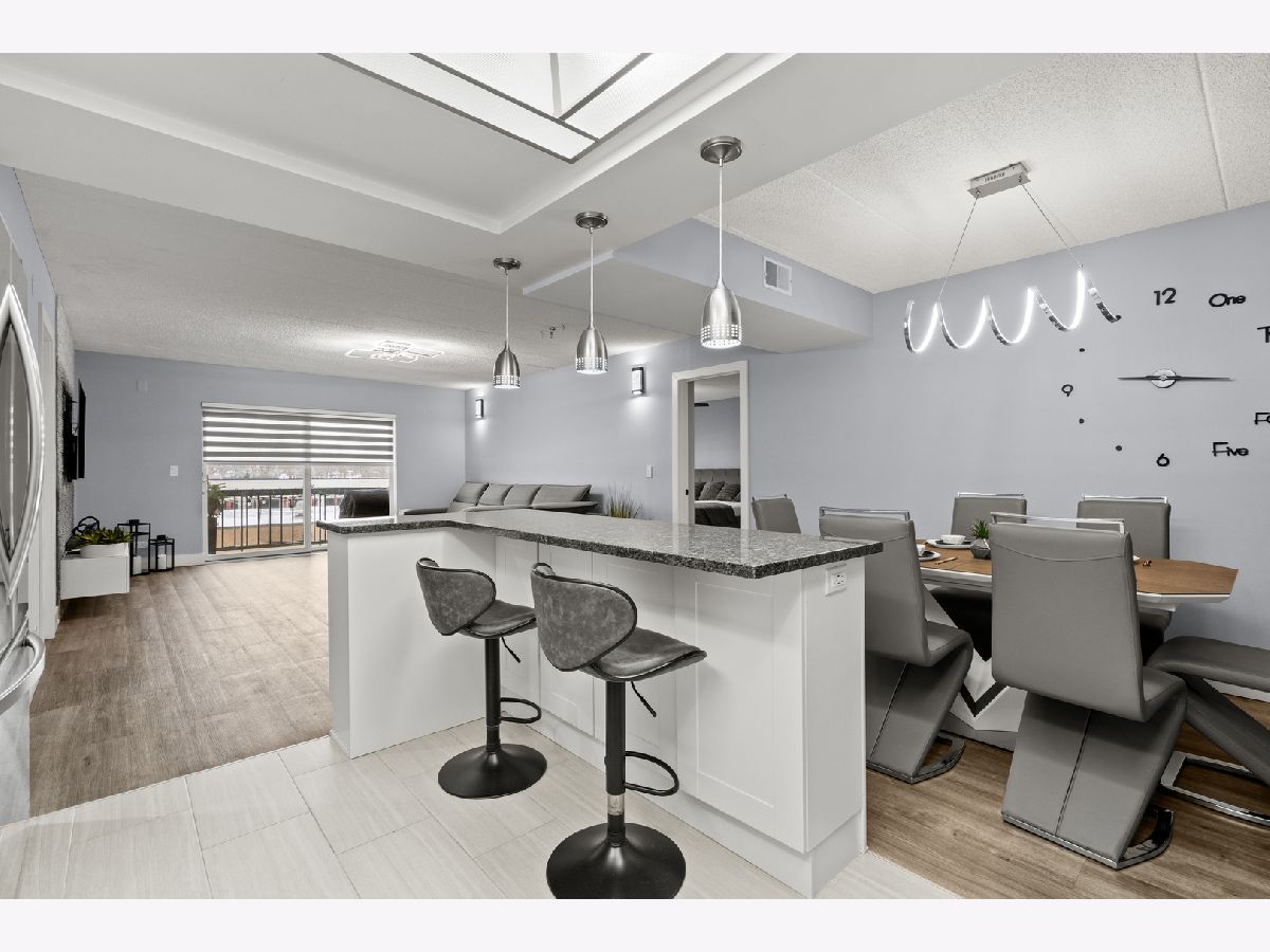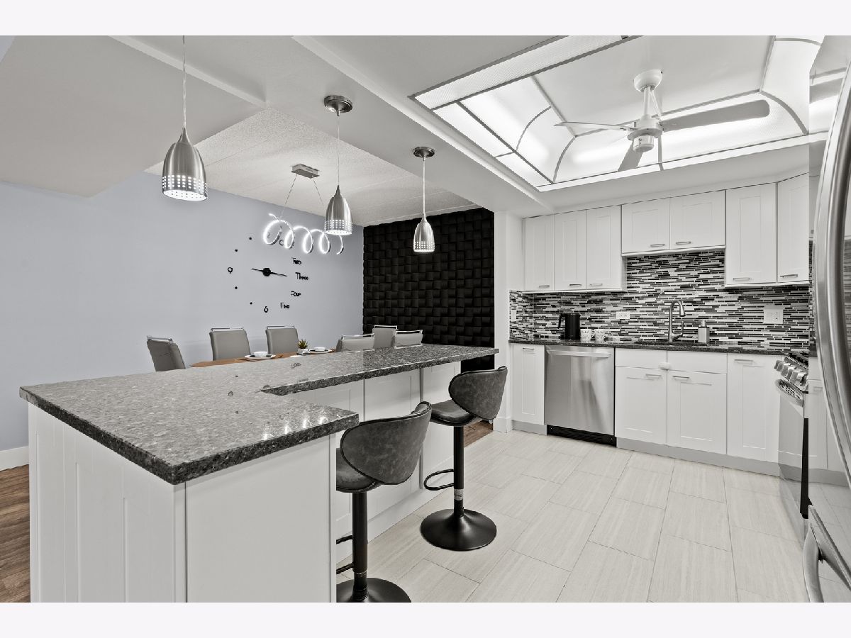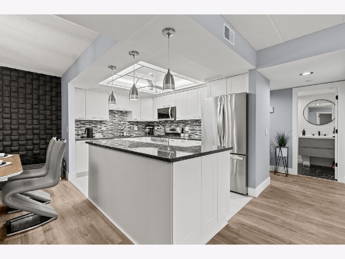 Beautifully updated 2-bedroom, 2-bath condo located in the heart of Des Plaines! This move-in-ready home features a desirable open-concept layout with wood laminate flooring throughout and solid European-style doors. The updated kitchen offers white cabinetry, a stylish mosaic tile backsplash, granite countertops, and stainless steel LG appliances. Both bathrooms have been fully remodeled with modern finishes. Upgraded light fixtures and stunning designer tile accent walls in the living and dining rooms add a contemporary touch. The spacious primary bedroom includes a walk-in closet plus an additional closet and a private bath with a walk-in shower. Enjoy balcony access from the living room, a full-size laundry room, and a smart thermostat for added convenience. The unit also comes with additional storage on the same level, providing extra space and practicality. Includes 1-car garage parking, plus the owner currently rents an additional garage space. Unbeatable location-just a 5-minute walk to the Metra station, restaurants, library, shops, and coffee spots. A perfect blend of style, comfort, and convenience!