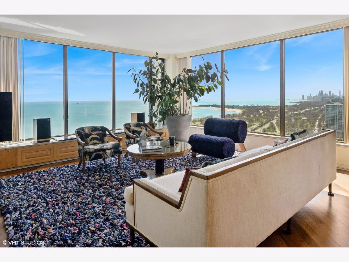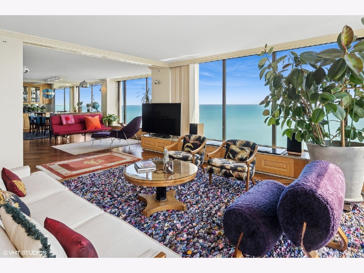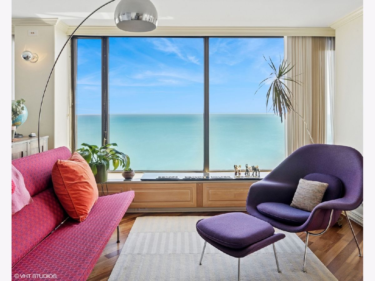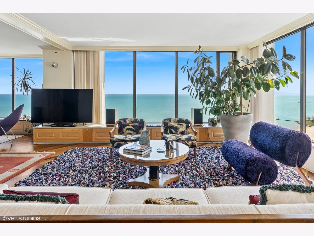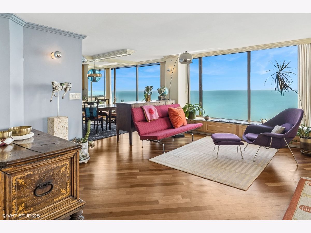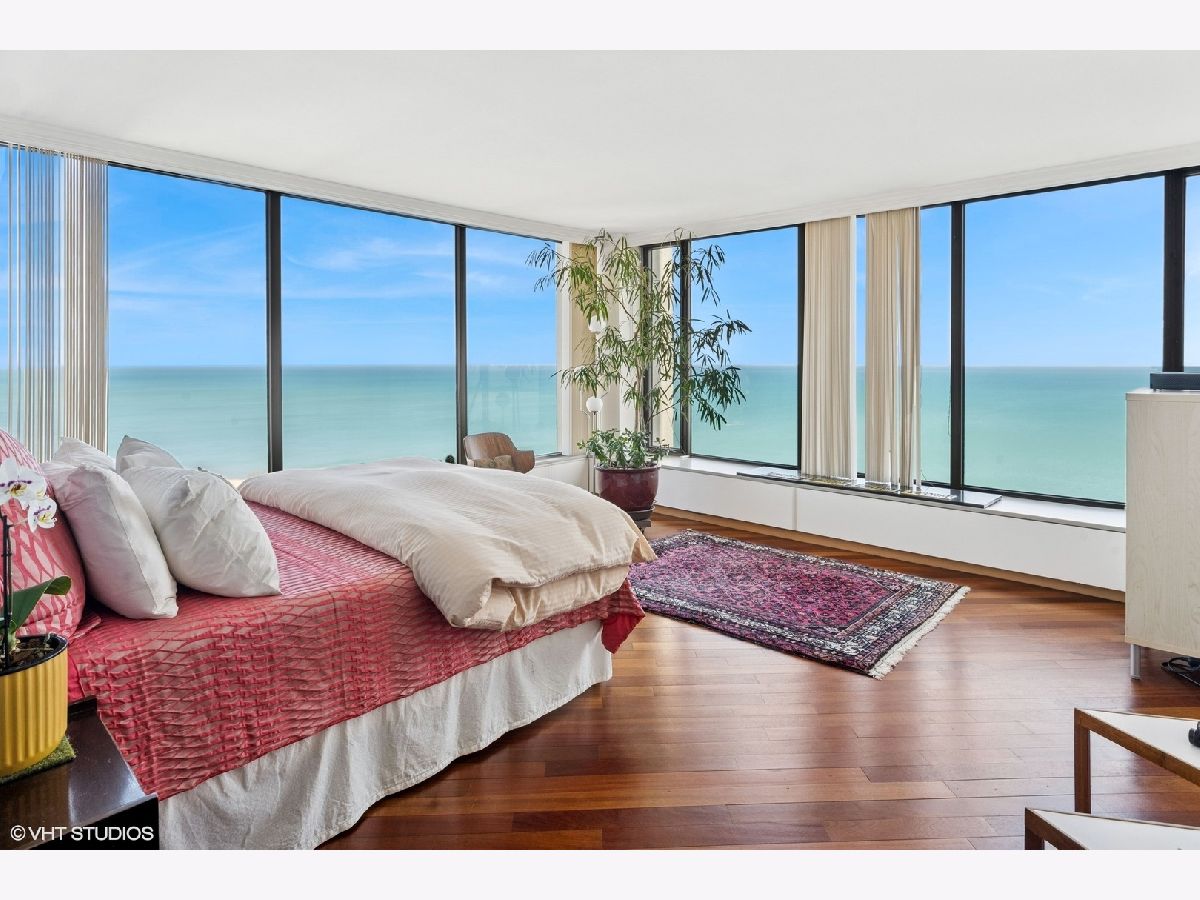 Spectacular lake-front living in this iconic mid-century modern building by renowned Chicago architecture firm in Chicago's Edgewater Beach community! This high-floor double corner unit commands unobstructed and breathtaking views east to the lake and beaches, south to the city skyline and north to Evanston and beyond. Two 2-bedroom corner units were combined to create a 2,685 sq ft oasis filled with abundant natural light. This unit is one of only three combined units in this full amenity building - a rarity to come to market. The unit features hardwood cherry floors throughout the main living area and primary bedroom, an open kitchen with a large island that flows seamlessly into spacious open plan living, sitting and dining room areas, and three bedrooms, each with an ensuite bath, including a spacious primary bath with steam shower, heated floor and 2-person jetted bathtub. There is an additional powder room off the kitchen, and a utility closet with a deep sink off the primary suite. Wake up to gorgeous sunrises over the lake from the primary bedroom, enjoy cooking and entertaining in your expansive kitchen and living area, or simply marvel at the ever-changing moods of our Great Lake. This well-managed building offers 24-hour door staff and onsite management, and a variety of amenities including an outdoor pool with cabanas and a veranda, a library, two party rooms, a rooftop sun deck, and a bike storage room. Additional neighboring access to tennis courts, indoor swimming pool and fitness club is available. On the park side of the building there are BBQ grills, a playground and a dog run. The location is a dream for outdoor enthusiasts, with fantastic direct access to Lincoln Park and lakefront bike trails just outside the back door. Easy access to DuSable/LSD, Express bus to/from downtown just out the front door and newly renovated red line train make this transportation-oriented neighborhood lively and accessible. An array of fine restaurants and shopping options are nearby, including Mariano's and Jewel Osco. Valet or self-park options offered in the onsite garage. Pet-friendly building. Assessments include heat, A/C, and cable/internet. With so much to offer - from views to amenities to location - this is a truly special property and a great place to live!