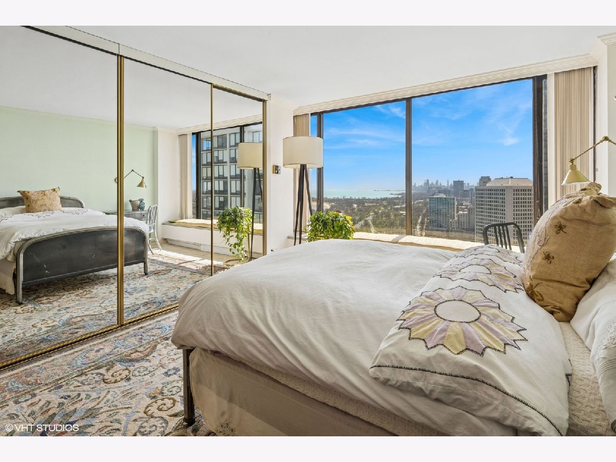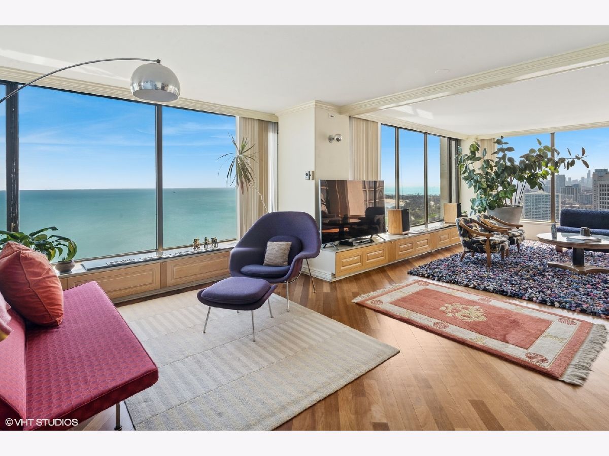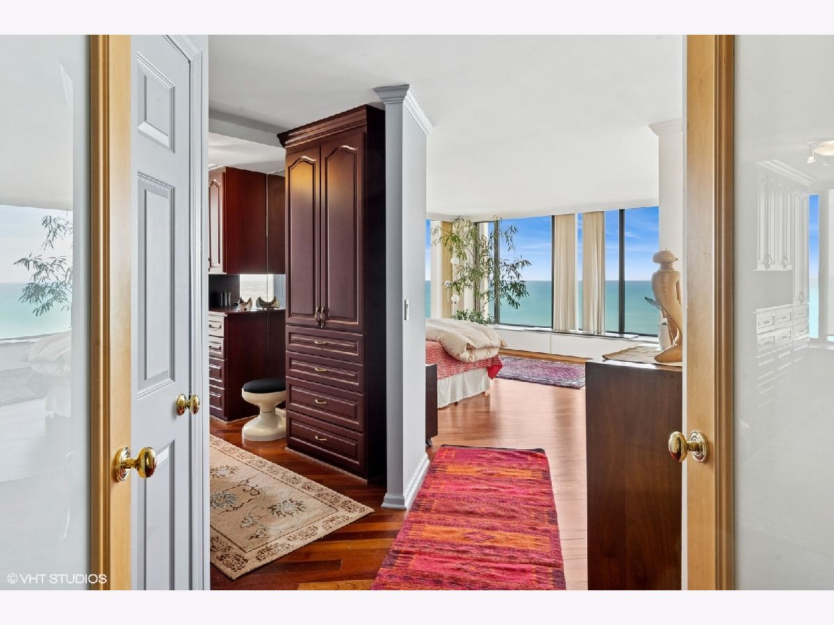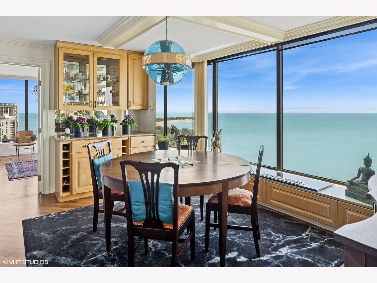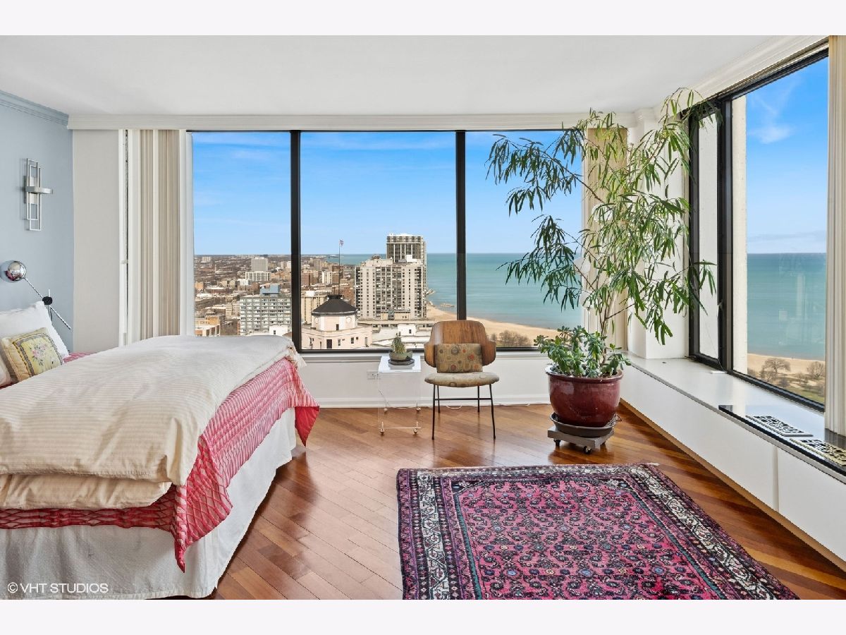 Spectacular lake-front living in this iconic mid-century modern building by renowned Chicago architecture firm in Chicago's Edgewater Beach community! This high-floor double corner unit commands unobstructed and breathtaking views east to the lake and beaches, south to the city skyline and north to Evanston and beyond. Two 2-bedroom corner units were combined to create a 2,685 sq ft oasis filled with abundant natural light. This unit is one of only three combined units in this full amenity building - a rarity to come to market. The unit features hardwood cherry floors throughout the main living area and primary bedroom, an open kitchen with a large island that flows seamlessly into spacious open plan living, sitting and dining room areas, and three bedrooms, each with an ensuite bath, including a spacious primary bath with steam shower, heated floor and 2-person jetted bathtub. There is an additional powder room off the kitchen, and a utility closet with a deep sink off the primary suite. Wake up to gorgeous sunrises over the lake from the primary bedroom, enjoy cooking and entertaining in your expansive kitchen and living area, or simply marvel at the ever-changing moods of our Great Lake. This well-managed building offers 24-hour door staff and onsite management, and a variety of amenities including an outdoor pool with cabanas and a veranda, a library, two party rooms, a rooftop sun deck, and a bike storage room. Additional neighboring access to tennis courts, indoor swimming pool and fitness club is available. On the park side of the building there are BBQ grills, a playground and a dog run. The location is a dream for outdoor enthusiasts, with fantastic direct access to Lincoln Park and lakefront bike trails just outside the back door. Easy access to DuSable/LSD, Express bus to/from downtown just out the front door and newly renovated red line train make this transportation-oriented neighborhood lively and accessible. An array of fine restaurants and shopping options are nearby, including Mariano's and Jewel Osco. Valet or self-park options offered in the onsite garage. Pet-friendly building. Assessments include heat, A/C, and cable/internet. With so much to offer - from views to amenities to location - this is a truly special property and a great place to live!