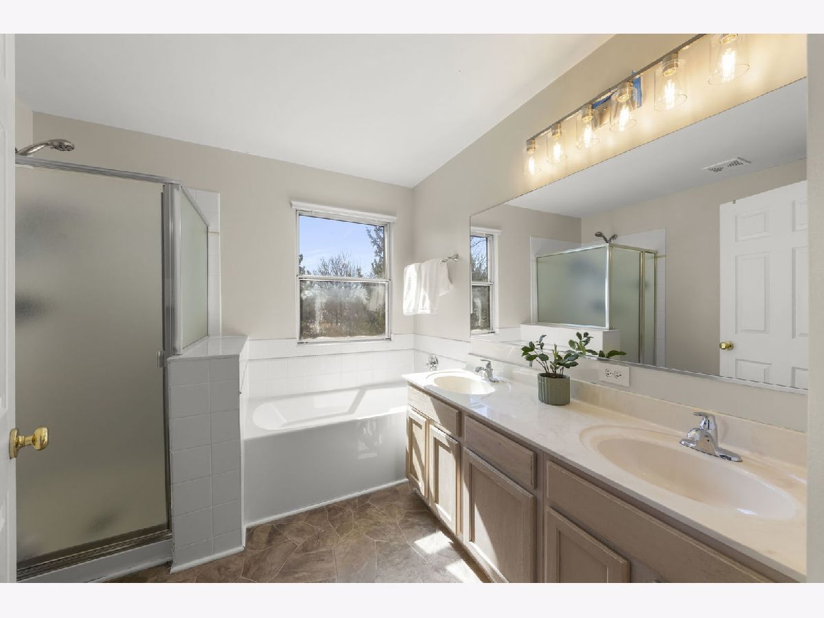Incredible opportunity to own this gorgeous and well-maintained 3-bedroom, 2.5-bathroom home with a 2-car garage in Bolingbrook's Bloomfield Village. Curb appeal stands out with a classic brick and siding exterior, clean lines, and a welcoming front entry. Inside, you'll immediately notice the abundance of natural light pouring in through the many windows, creating a bright and welcoming feel throughout the home. The main floor features bright and open formal living and dining areas that provide comfortable everyday space with newer flooring and neutral finishes. The kitchen offers a practical layout with white cabinetry, granite countertops, an eye-catching tile backsplash, and a breakfast bar. It flows seamlessly into a sunny breakfast nook and a spacious family room, making the space ideal for both everyday living and entertaining. A charming half-bathroom with classic white wainscoting and a dedicated first-floor laundry room add to the everyday convenience of the main level. Upstairs, you'll find a comfortable primary suite featuring a walk-in closet, and a large ensuite primary bathroom complete with a dual vanity, soaking tub, and a separate shower. The two secondary bedrooms are generously sized, offer great flexibility, and are served by a bright and clean full hall bathroom. The expansive unfinished basement provides a fantastic blank canvas for future living space, additional bedroom, recreation, or a home gym, and already includes a separate framed room that is perfect for a quiet home office. Out back, enjoy a large, partially fenced yard anchored by mature trees and a lovely wooden deck that is perfect for summer nights with friends or relaxing outdoors. An incredible value and a fantastic opportunity to put your own stamp on a home. Come take a sneak peek at your new life today! // UPDATES: Upstairs Carpet (2026), Remodeled Mudroom (2026), Main Floor Bathroom Toilet (2026), Roof (2024), Gutters and Gutter Guards (2024), Washer & Dryer (2024), New Deck (2023), LVP Flooring on Main Level (2023), Basement Partially Finished (2023), New A/C (2021), Nest Thermostat (2021), Main Floor Bathroom Fixtures (2021), Kitchen and Dining Room Lighting (2021)