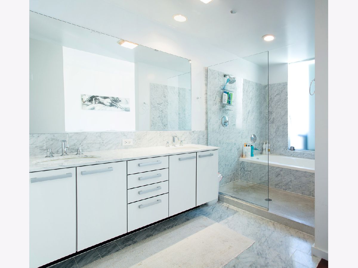 Modern Loft-Style Luxury in the Heart of Streeterville. Experience contemporary urban living in this stunning southeast corner residence. Located in one of Streeterville's most coveted boutique buildings, this 2-bedroom, 2-bathroom home features soaring 10' ceilings, exposed concrete accents, and floor-to-ceiling windows that frame panoramic skyline views. Designer Finishes & Thoughtful Upgrades: The interior boasts rich Brazilian cherry flooring throughout and a sleek Italian "Alno" kitchen equipped with espresso cabinetry, Bosch appliances, and natural stone countertops with Grohe fixtures. Both bedrooms feature custom California Closets, while the primary suite offers a spa-like retreat with marble/honed Travertine, a double basin vanity, and a separate shower. Enjoy your morning coffee on the private terrace, which has been enhanced with upgraded flooring. Building & Location: This full-amenity building offers an indoor lap pool, fitness center, sauna, sundeck, and 24/7 door staff. Situated steps from Whole Foods, Michigan Avenue, and the lakefront. Deeded parking and a storage cage (#86) are included. ---