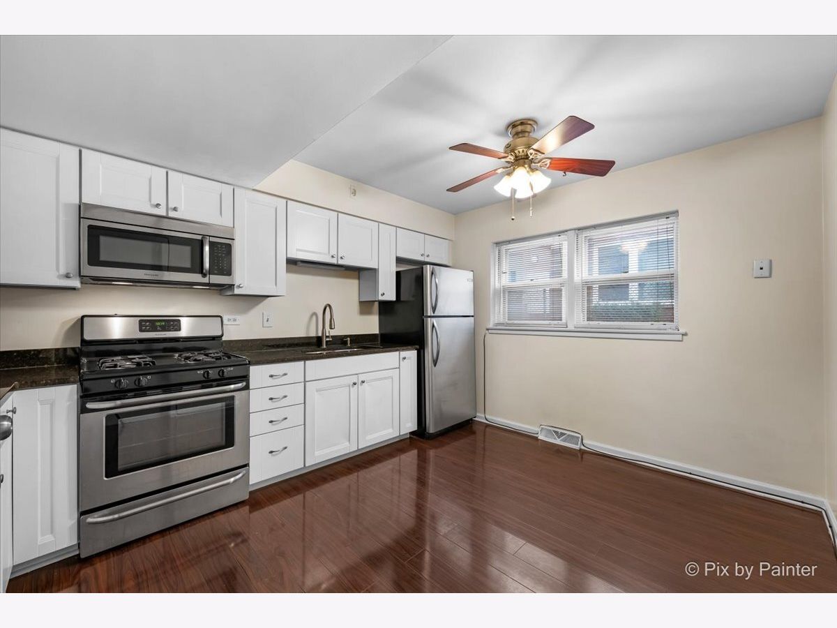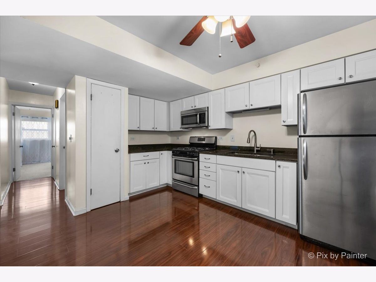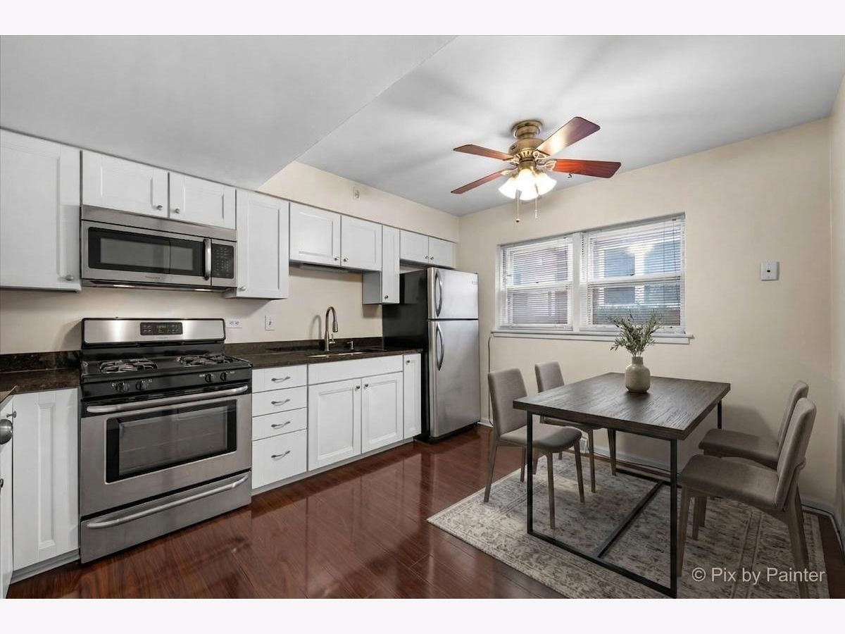 Your wait is over! Move right into this beautifully updated, spacious, and light-filled 1-bedroom, 1-bath condo. It perfectly blends comfort and affordability. The inviting living space features gleaming wood laminate flooring throughout the living room, hallway, and kitchen. The oversized eat-in kitchen is both functional and stylish, offering white cabinetry, granite countertops, and stainless steel appliances, including a refrigerator, stove, and microwave. The generously sized bedroom boasts corner double windows that fill the space with natural light, along with a large closet for ample storage. The bathroom is tastefully finished with modern fixtures, ceramic tiles and relaxing Jacuzzi tub. Enjoy a peaceful courtyard setting with beautifully maintained grounds, creating a private oasis ideal for relaxing and unwinding. Additional highlights include low monthly assessments, updated light fixtures, and pet-friendly living (up to 50 lbs). Convenient coin laundry is located on the same floor. This is also a prime opportunity for investors. Ideally located just minutes from I-90, CTA with Blue Line access, Metra, Jefferson Memorial Park, shopping, dining, and all the conveniences of city living. Welcome home!