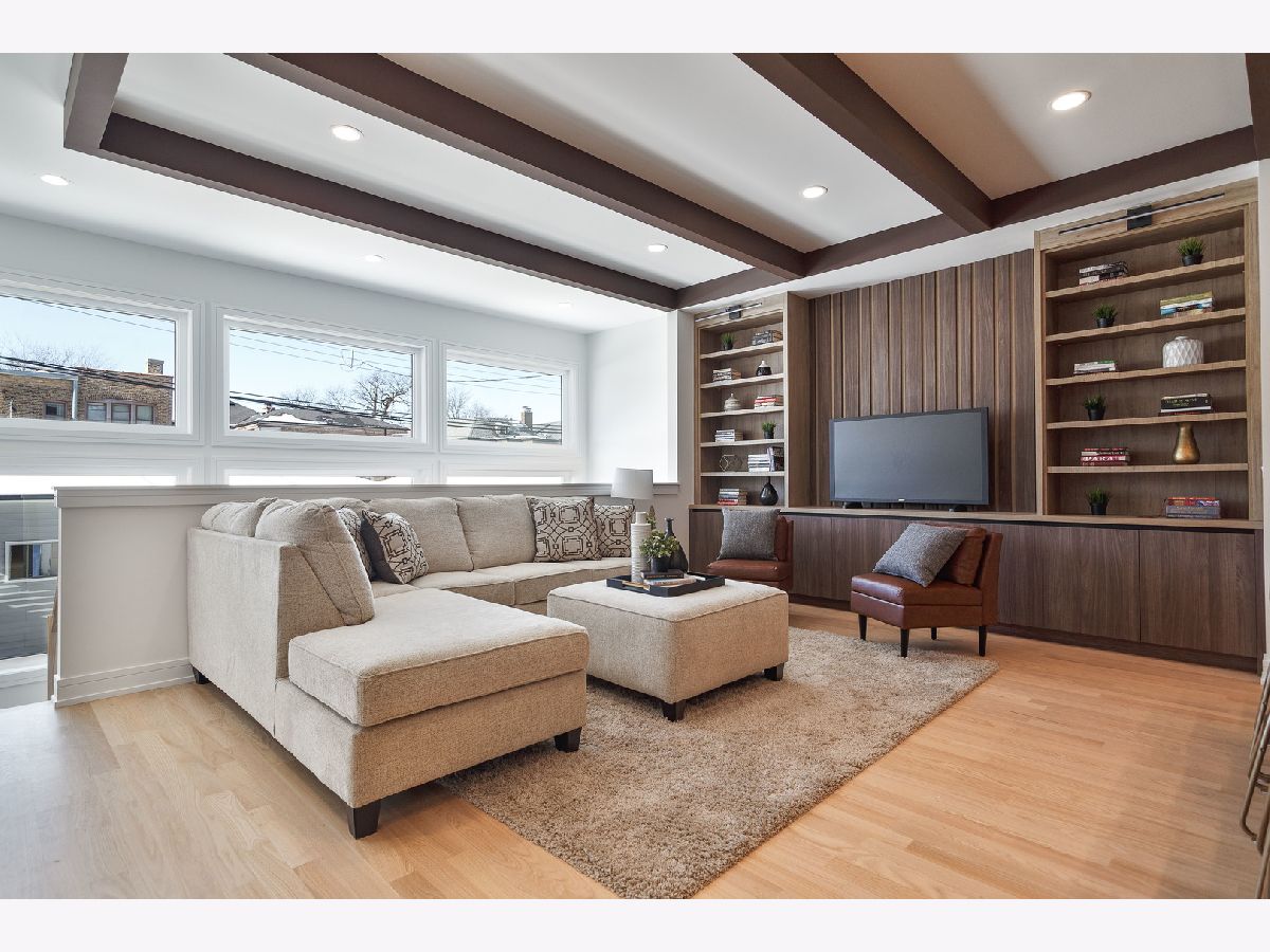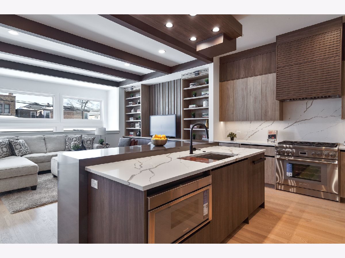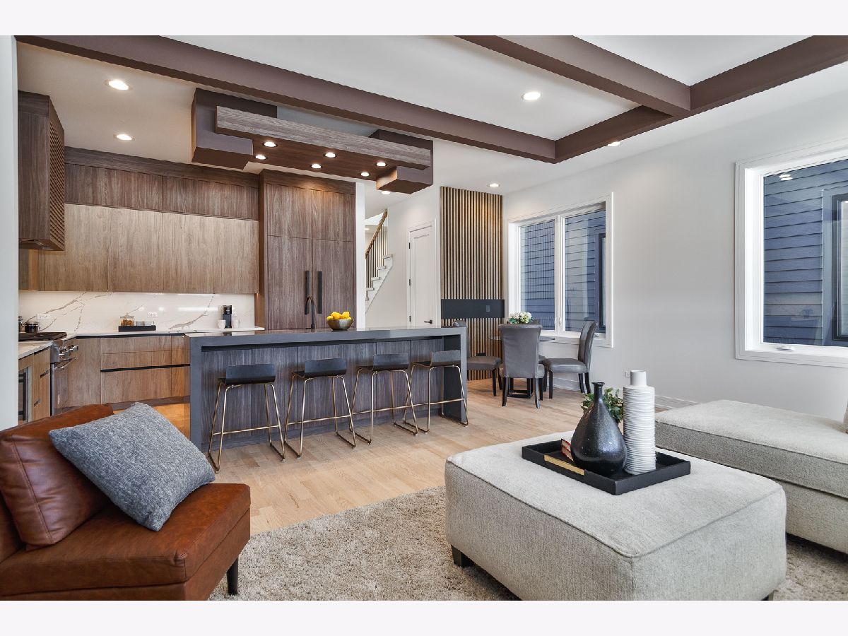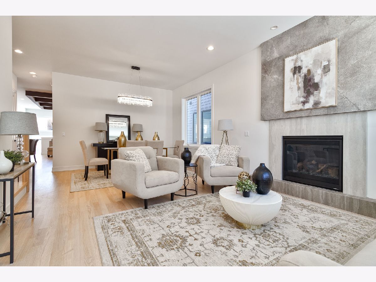 Impeccable new construction single-family home by expert builder on a 30' lot. Great curb appeal with wood grain board and batten facade highlighted by stone, Hardie board siding, black windows, and a modern front entry door. Spacious floor plan with 5 bedrooms and 3.1 baths. Combined living/dining room features large windows offering ample natural light and gas fireplace with floor to ceiling surround. Beautiful oak hardwood flooring throughout main and upper level. Chef quality kitchen perfect for entertaining equipped with professional Thermador appliances, island with bar seating, custom cabinetry, quartz counters, large pantry, and breakfast area. Adjoining family room with custom media center, coffered ceiling, and large windows overlooking the backyard. Rear mudroom with built-in bench. Spacious primary bedroom includes two walk-in closets with custom organizers, and spa like ensuite bath with freestanding soaking tub, frameless glass shower, dual vanities, toilet room, and heated flooring. Three additional bedrooms, guest bath with tub, dual sinks, and heated flooring, and laundry room with sink complete the upper level. Finished basement with radiant heated flooring throughout includes recreation room with wet bar featuring beverage center, 5th bedroom, full bath, second laundry hook-up, storage space, and mechanicals. Every detail has been considered; high end fixtures and finishes, statement lighting, 8' doors, custom ceiling details, pre-wiring for speakers and security cameras, built-out closets and pantry, skylights, and much more. Fully enclosed yard with security intercom + rear stamped concrete patio and detached extra-wide 25' two-car garage. Located in beautiful Peterson Park close to outdoor recreation, shopping, restaurants, and conveniences + other great neighborhoods like Andersonville and Lincoln Square! Photos are from the model home next door.