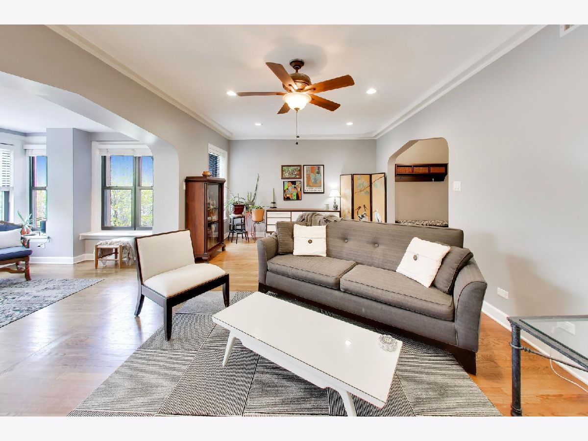 This Gorgeous jumbo 3rd floor penthouse Edgewater Beach condo sits among the trees and is filled with amazing natural light with west, south and east exposures. Pride in ownership is everywhere. This Vintage rehab unit is 2000sq ft and blends today with the quality vintage touches new construction can't provide. Upon entering the gracious foyer, you will be wowed with the spacious and bright open oversized living room & large sunroom featuring gorgeous hardwood floors throughout and a gas fireplace, along with custom built built-ins. This condo features 3 bedrooms 2 baths and 2000 sq ft of living space and has plenty of in-unit storage and extra deep closet space. The primary bedroom is large and accommodates a king sized bed and additional furniture comfortably. The Primary bath was a gut rehab in 2020 with gorgeous cabinetry, lighting, tile work and a heated 6' soaking tub. The dining room is truly impressive as it can seat 12+ people easily and there are 2 built-in hutches that are repurposed from the original butler pantry. The other bedrooms are nicely sized and get great light. The kitchen features an amazing amount of cabinet and counter space. The cabinets are of high quality and features granite counters 42" uppers, a large walk-in pantry closet and a breakfast eating area and all appliances are from 2017, The laundry closet easily fits side by side washer dryer (2022) with room for extra storage. The HVAC is also from 2022. The buildings hot water heater is 2024. Additionally, This unit comes with roof rights, so you can easily add skylights for even more light. The unit comes with a storage room 14'x7'x8.5' and 2 tandem parking spots in the garage. There is even a shared garage roof deck that is approximately 20'x50'. There is no greater value out there. Steps from Hollywood beach, the lakefront path, the 147 Express bus to downtown, Red line L, historic Bryn Mawr shopping district, and 5 minutes to Andersonville's Clark St. This home has it all.