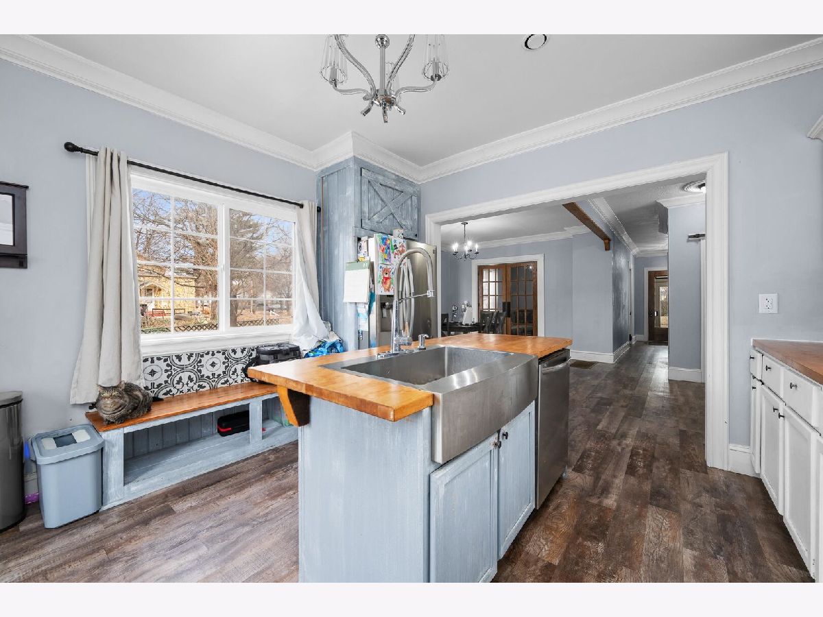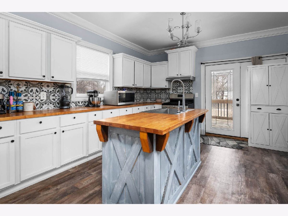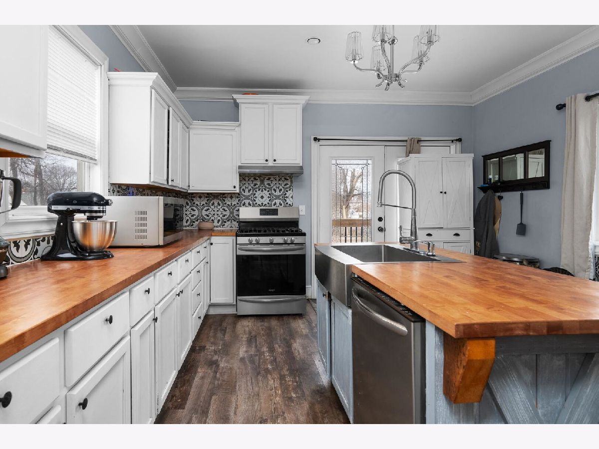Check out this kitchen!!! Main floor laundry and half bath are major updates to this remodeled (2022) home. The layout features welcoming foyer, formal dining room, large open living room and open floor plan to to spacious kitchen with butcher block island and hard surface counters. French doors lead out of the kitchen to a wonderful raised deck great for entertaining and cook outs. Main floor is totally finished with seamless LVP throughout. Upstairs you will find the full bath has been completely updated in 2024. Three large bedrooms complete the second floor. The basement is original to the era but has ample storage. The large lot has alley access, nice shed, extra parking and deck.
