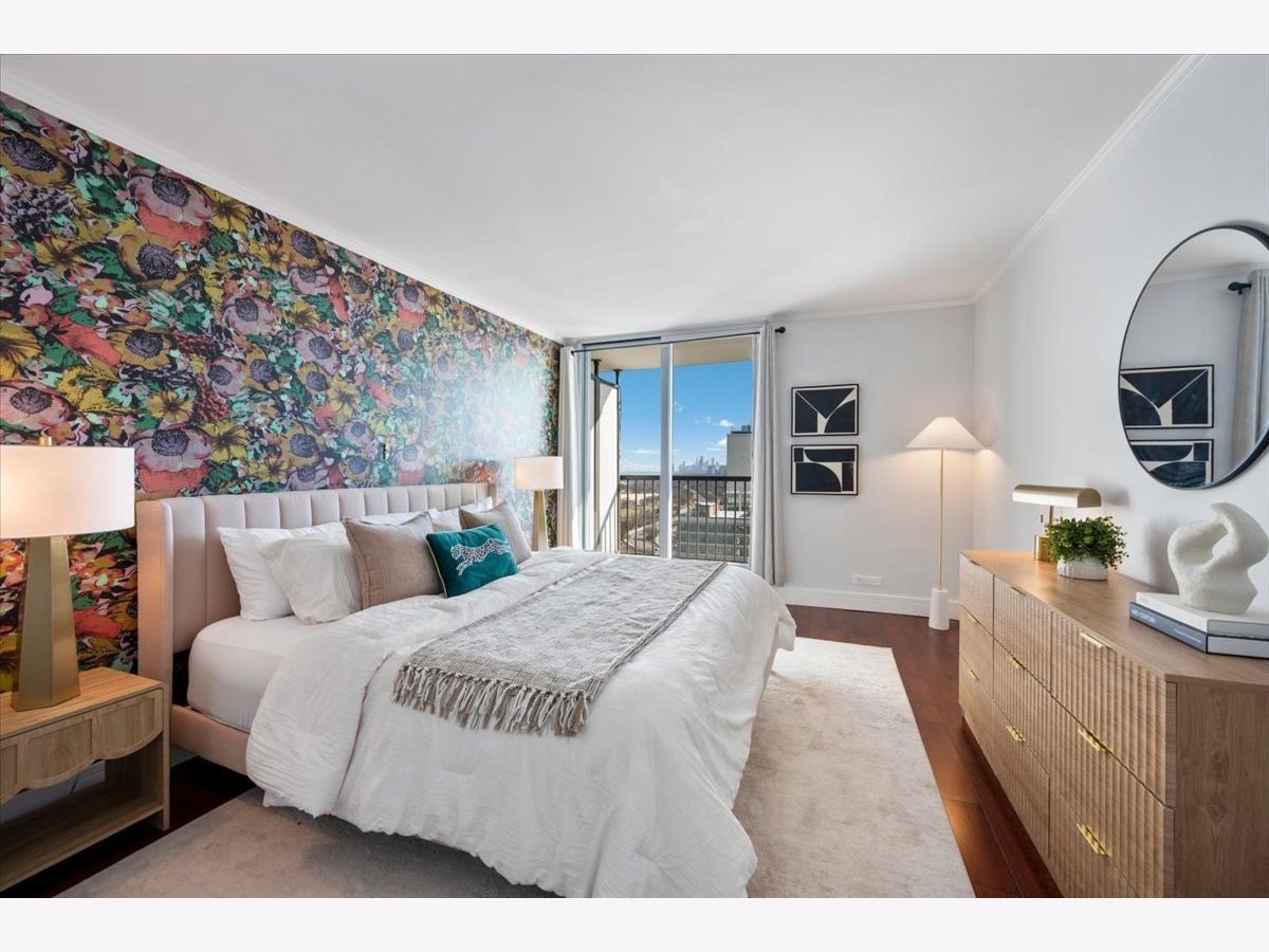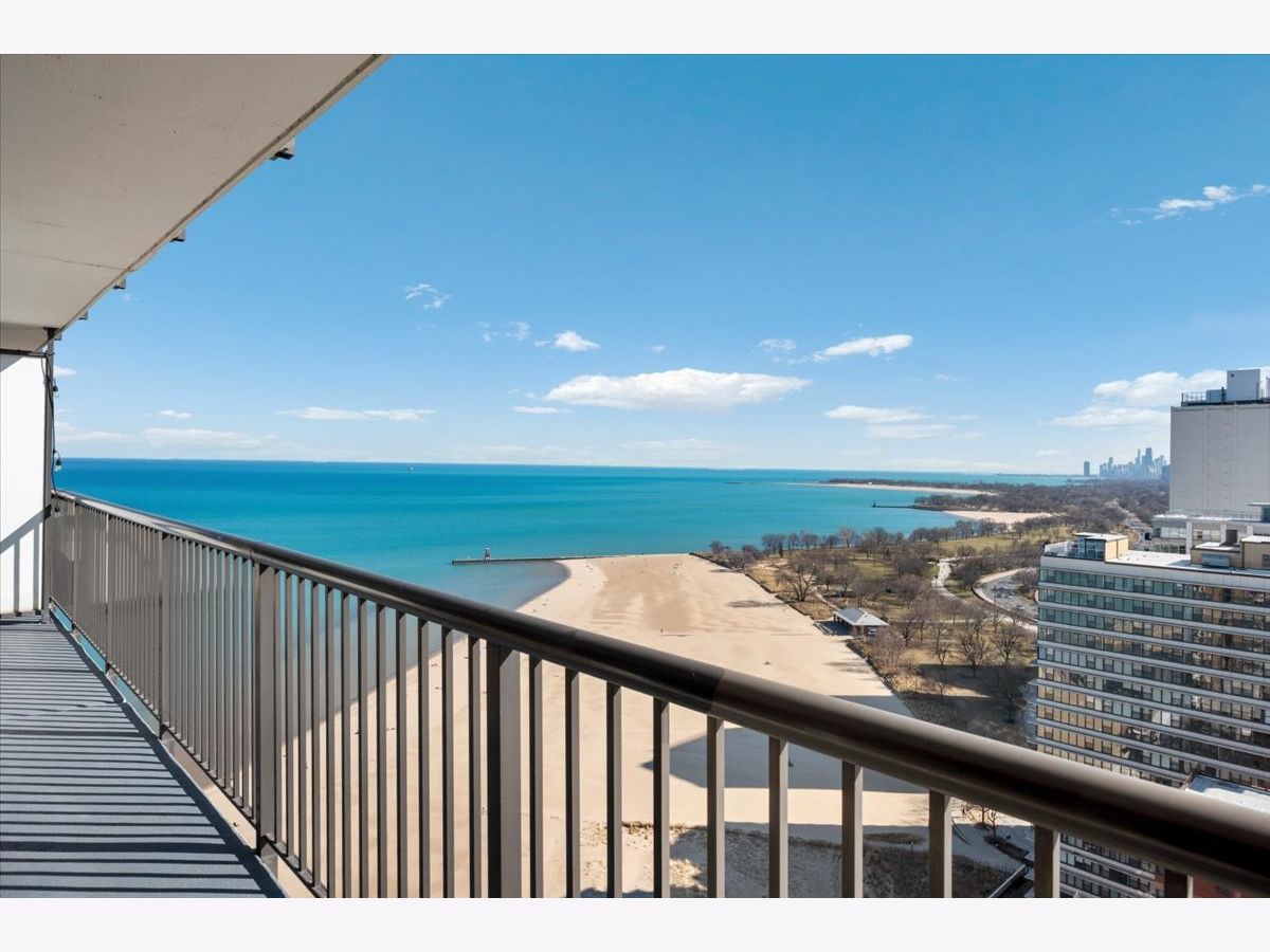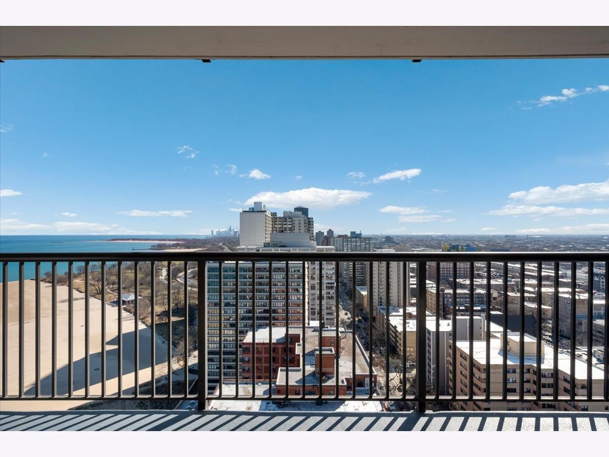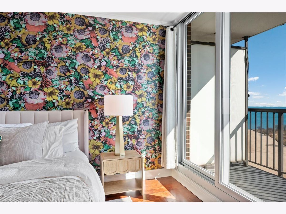 Panoramic lake and skyline views define this sought-after south-facing G tier residence on the 25th floor at 5855 N Sheridan, overlooking Hollywood Beach. A remarkable 30-foot private balcony spans the entire width of the home, delivering sweeping views of Lake Michigan, Lake Shore Drive, and the Chicago skyline - from glowing sunrises over the water to sparkling city lights at night. Inside, the home is freshly painted and thoughtfully curated with custom designer wallpaper, upgraded lighting, matte black fixtures, and a bold accent wall. Hardwood floors run throughout the living spaces.The updated kitchen features quartz countertops, elegant tile work, stainless steel appliances, and generous cabinetry. The refreshed bathroom offers heated floors, new tile shower, updated lighting, and custom storage. A spacious walk-in closet plus additional floor-to-ceiling storage (Space #98) provide exceptional storage for a one-bedroom. Solid core doors and quality finishes reflect meticulous care throughout. Full-amenity living includes 24-hour door staff, outdoor pool, fitness center, two expansive sundecks overlooking the lake, party room,receiving room, and on-site laundry. Monthly assessments of $878.25 include internet, basic cable, self-parking and use of all building amenities. One assigned garage parking space (#69) is included. Just steps to the lakefront trail, beaches, the Thorndale Red Line, Whole Foods, Loyola University, and neighborhood dining. Elevated lakefront living in one of Chicago's most desirable buildings.
