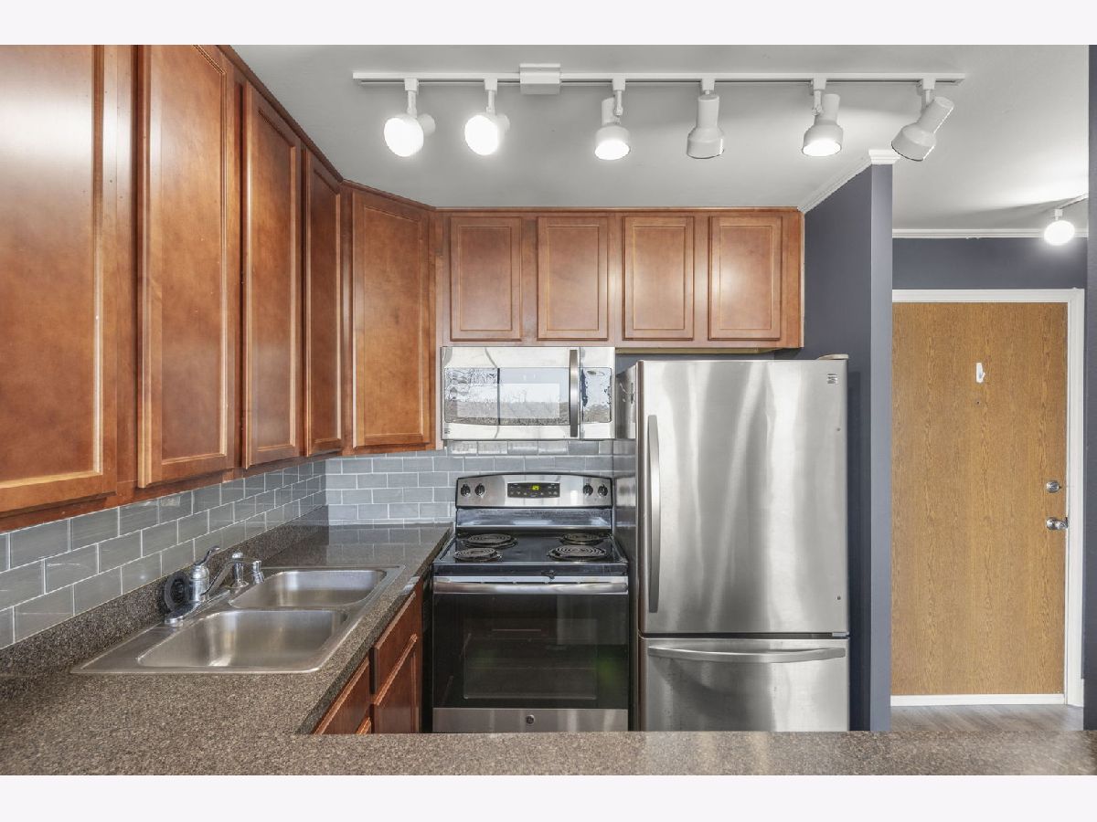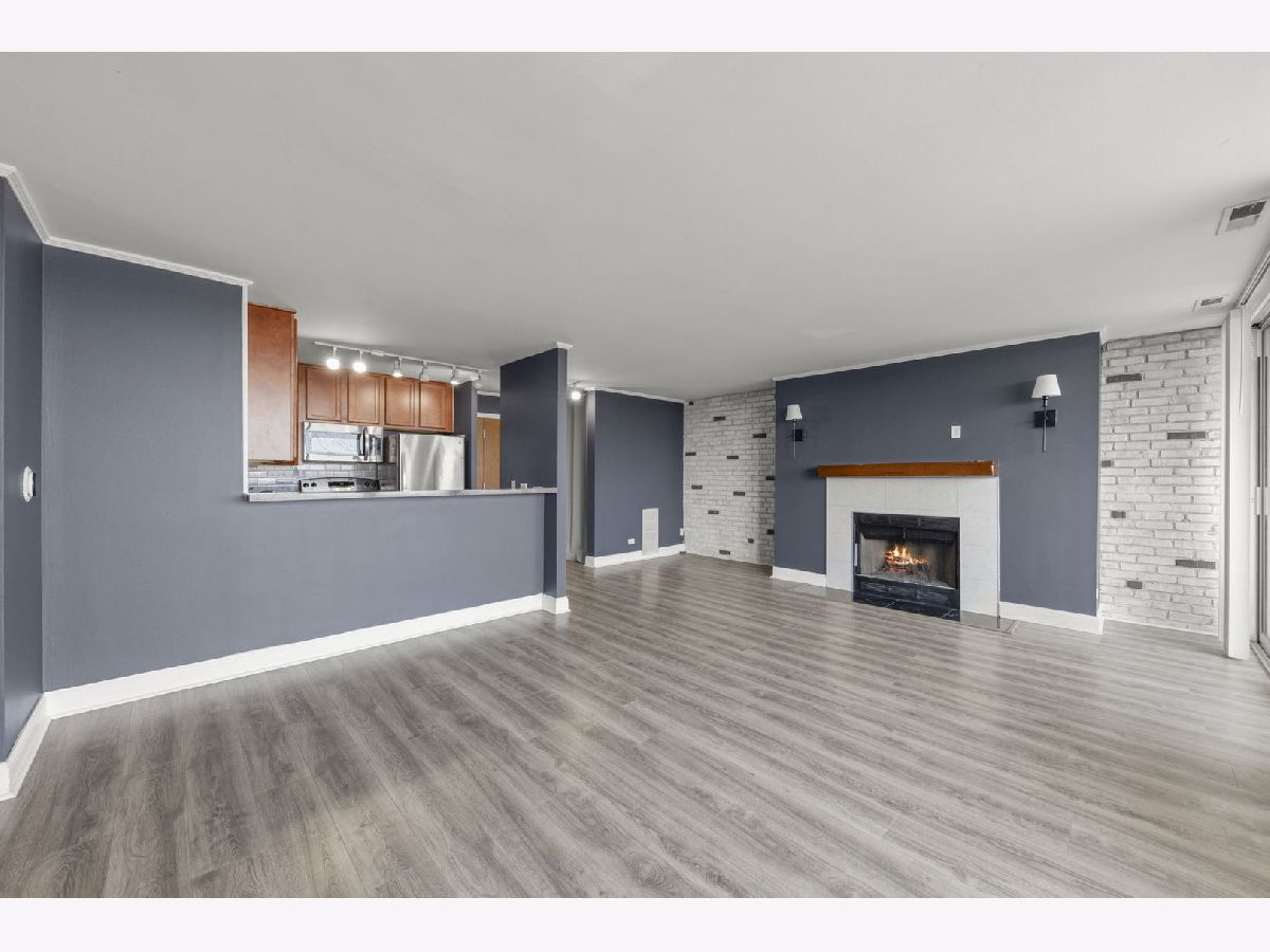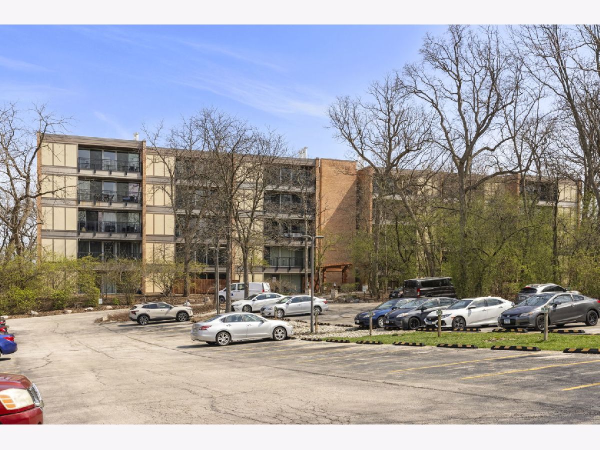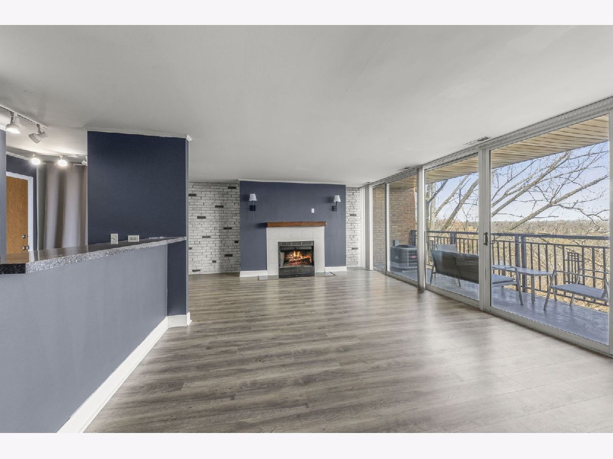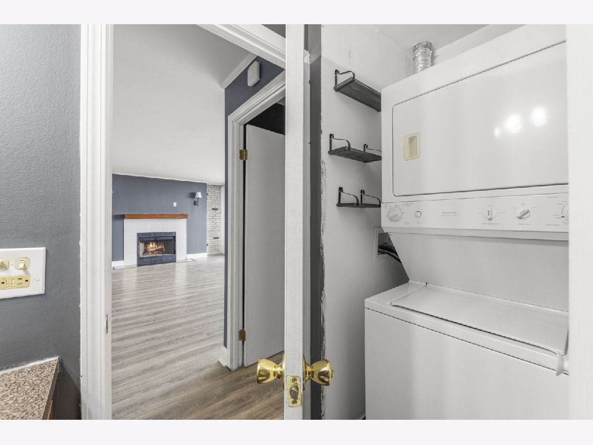 Top-floor 1-bedroom, 1-bathroom secure entry condominium offering unobstructed treetop and open-sky views from a private balcony. The open-concept living and dining area features wood laminate flooring, a wood-burning fireplace with a painted brick surround, and floor-to-ceiling sliding glass doors that open to the balcony. The kitchen includes raised-panel cherry cabinetry, a subway tile backsplash, and stainless steel appliances. An in-unit stacked washer and dryer is tucked in a dedicated laundry closet off the kitchen. The primary bedroom includes a ceiling fan and sliding glass door access to the balcony. Freshly painted throughout. One assigned parking space included. The Four Lakes community offers residents access to an outdoor pool, health club, tennis courts, bike trails, elevator, and an on-site restaurant. Located minutes from the Lisle Metra station, I-88, Morton Arboretum, and the DuPage County forest preserve trail system.