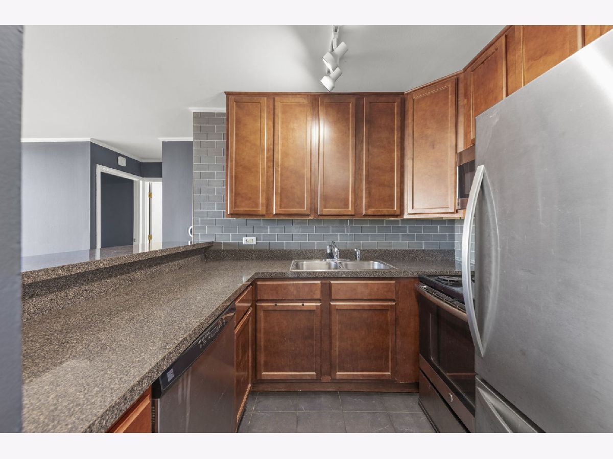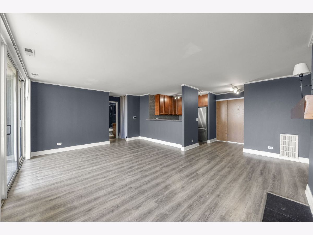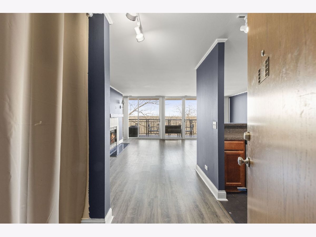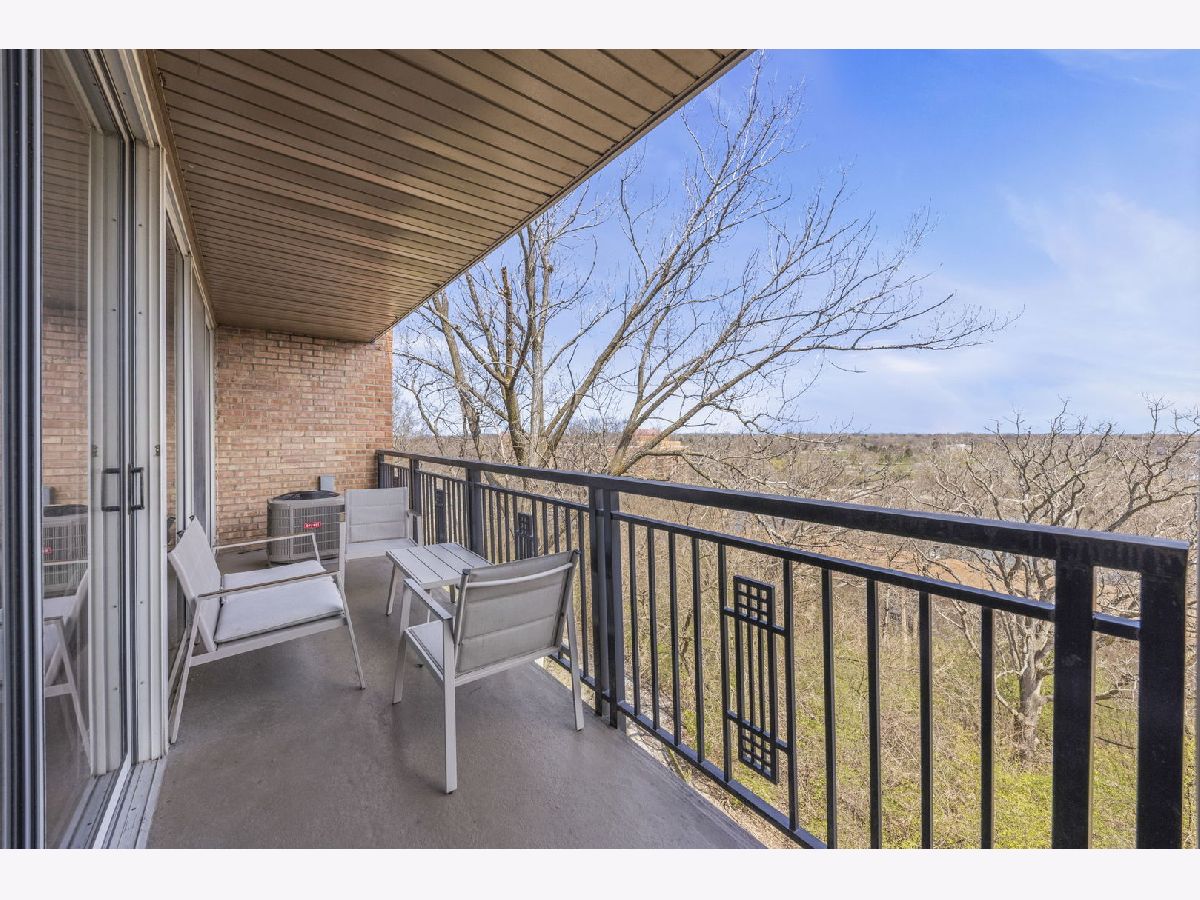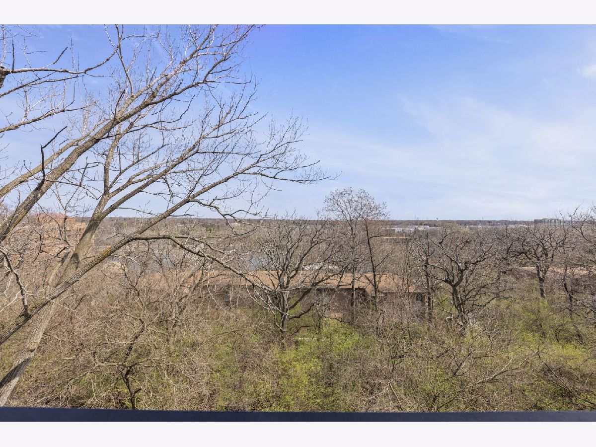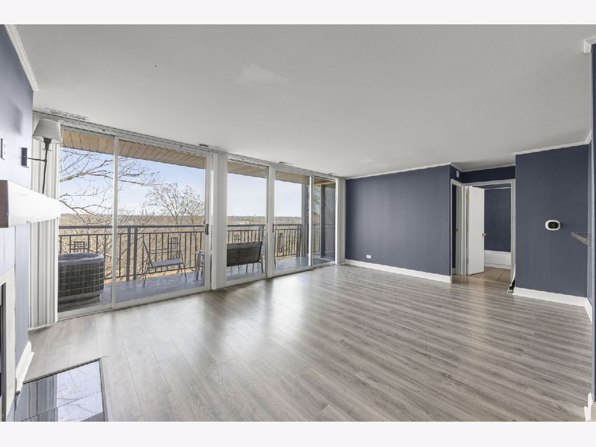 Top-floor 1-bedroom, 1-bathroom secure entry condominium offering unobstructed treetop and open-sky views from a private balcony. The open-concept living and dining area features wood laminate flooring, a wood-burning fireplace with a painted brick surround, and floor-to-ceiling sliding glass doors that open to the balcony. The kitchen includes raised-panel cherry cabinetry, a subway tile backsplash, and stainless steel appliances. An in-unit stacked washer and dryer is tucked in a dedicated laundry closet off the kitchen. The primary bedroom includes a ceiling fan and sliding glass door access to the balcony. Freshly painted throughout. One assigned parking space included. The Four Lakes community offers residents access to an outdoor pool, health club, tennis courts, bike trails, elevator, and an on-site restaurant. Located minutes from the Lisle Metra station, I-88, Morton Arboretum, and the DuPage County forest preserve trail system.