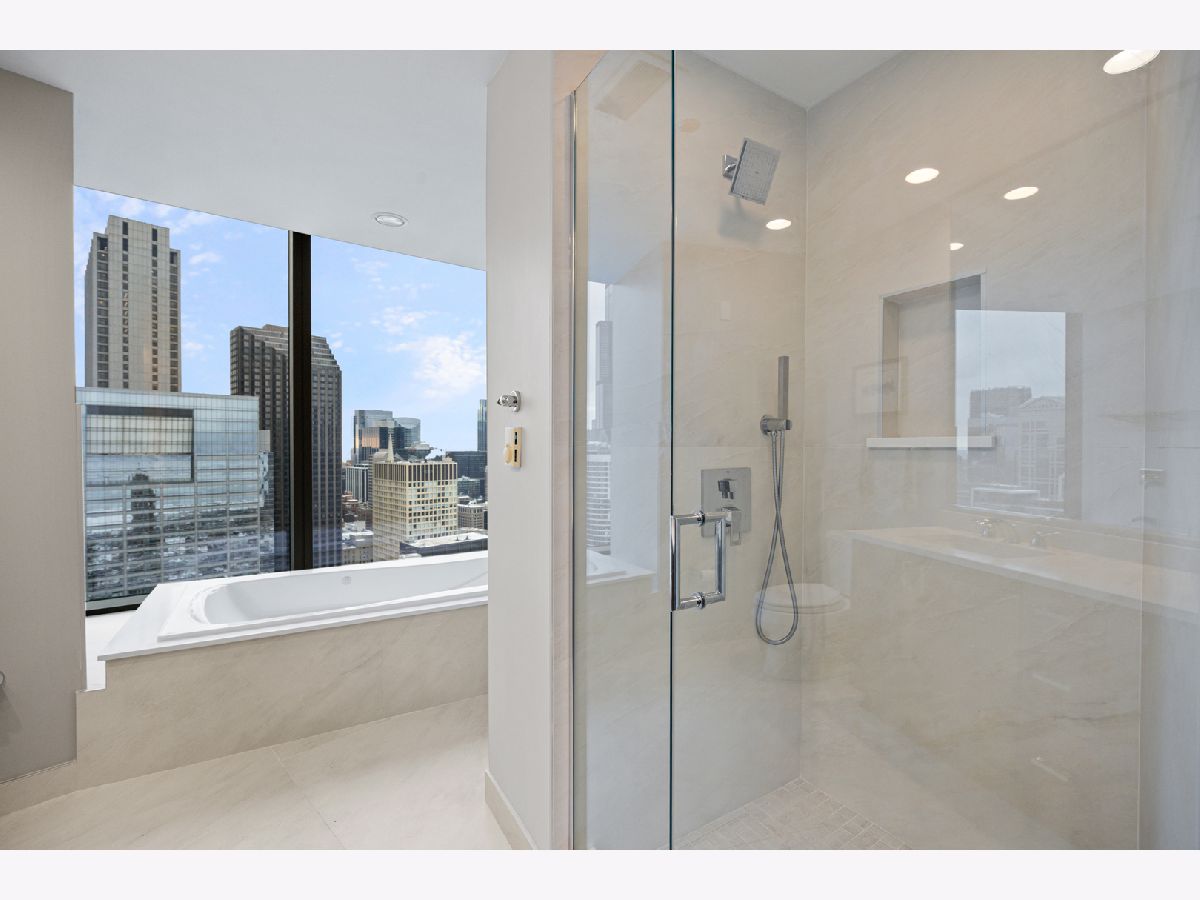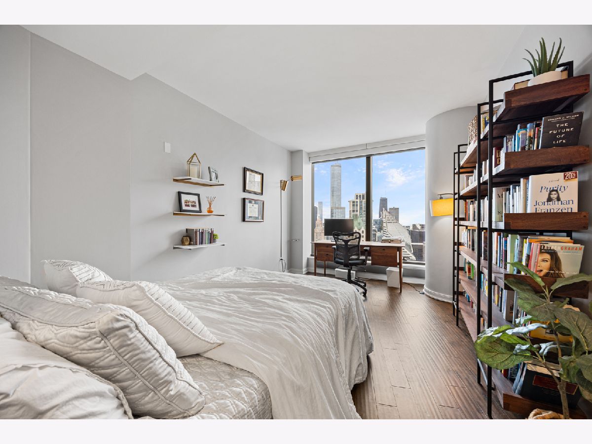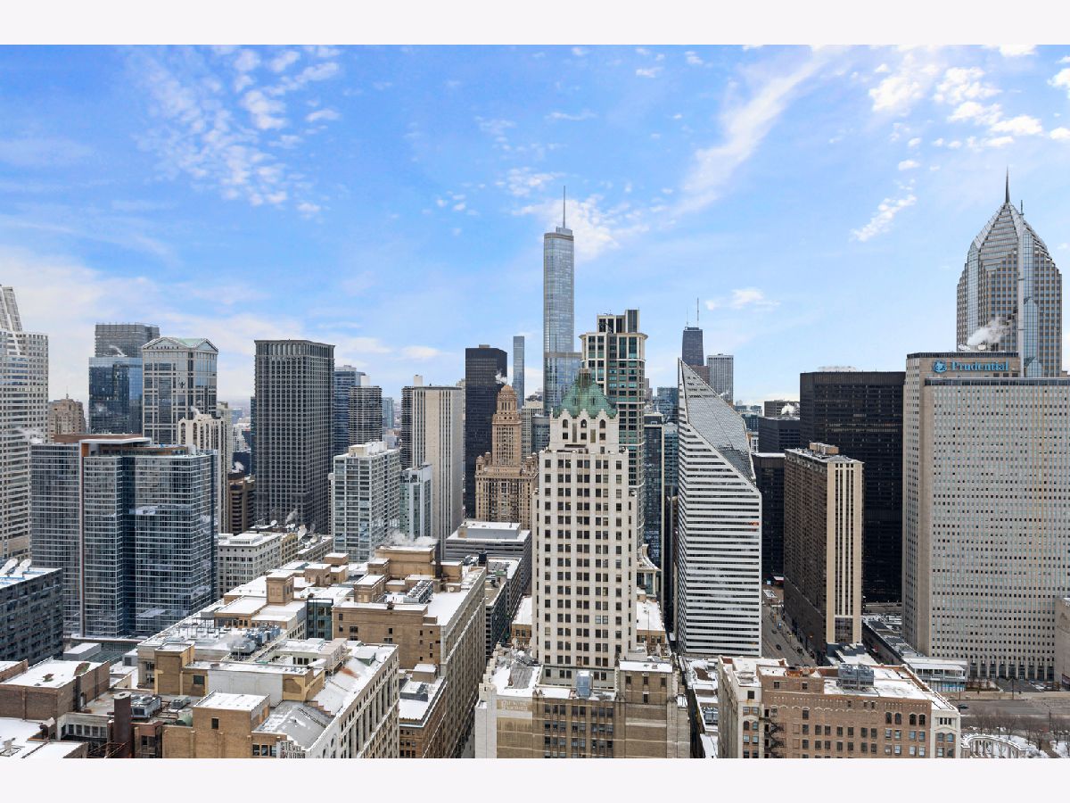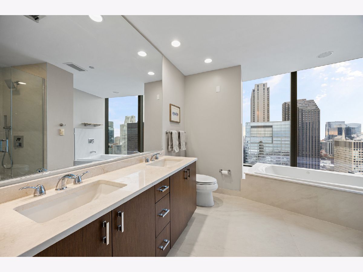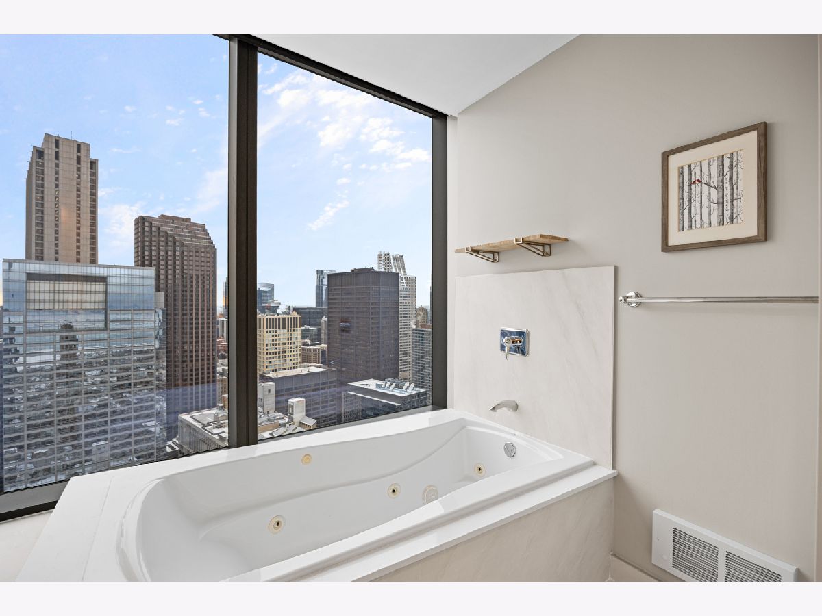 Stunning 1,600-square-foot corner residence at The Legacy, offering unobstructed views of Millennium Park, Lake Michigan, and the city skyline. This highly upgraded home features floor-to-ceiling windows with motorized shades throughout, wide-plank hardwood floors throughout, and custom lighting. The newly renovated primary bath includes beautiful 4'x4' porcelain tiles, a separate whirlpool tub, large shower and double bowl vanity. The spacious primary bedroom has incredible NW views of the city skyline and a custom walk-in closet. The chef's kitchen is equipped with Sub-Zero and Bosch stainless steel appliances. Enjoy breathtaking northeast views from the spacious private terrace.The Legacy is a full-amenity building featuring multiple sky decks, resident lounges, an indoor lap pool, whirlpool, steam rooms, fitness center, dog run, dry cleaning services, and 24-hour door staff. Residents also enjoy direct access to the University Club, one of the city's premier private clubs. Ideally located just steps from Lake Michigan, Millennium Park, and public transportation. 1 prime deeded parking spot is available for purchase.