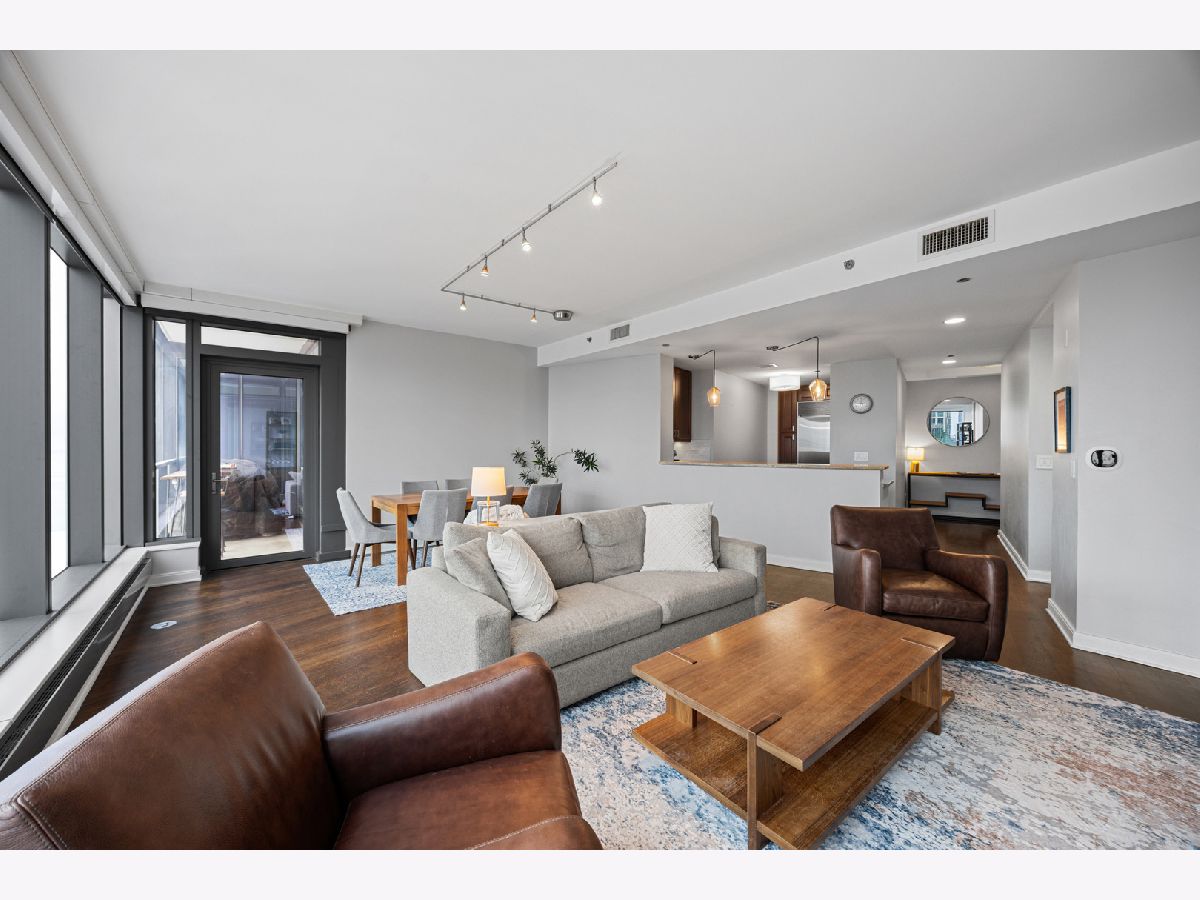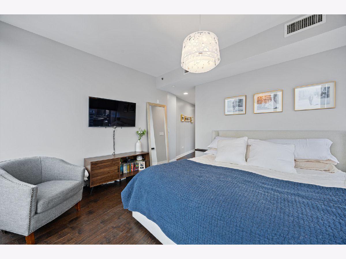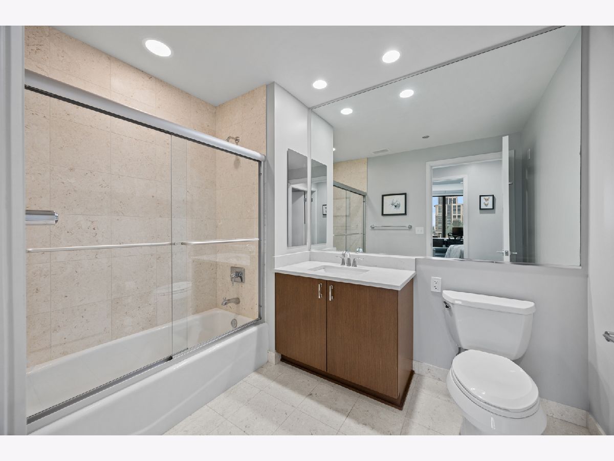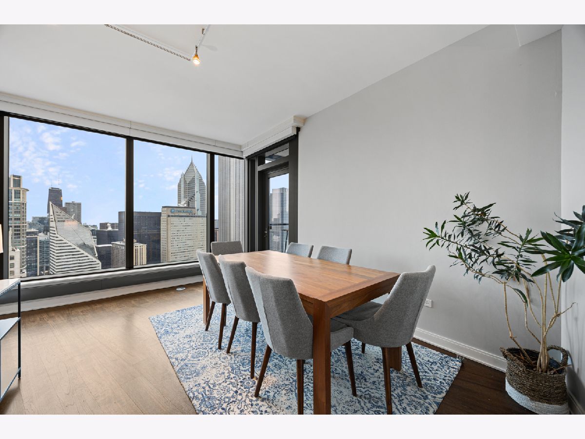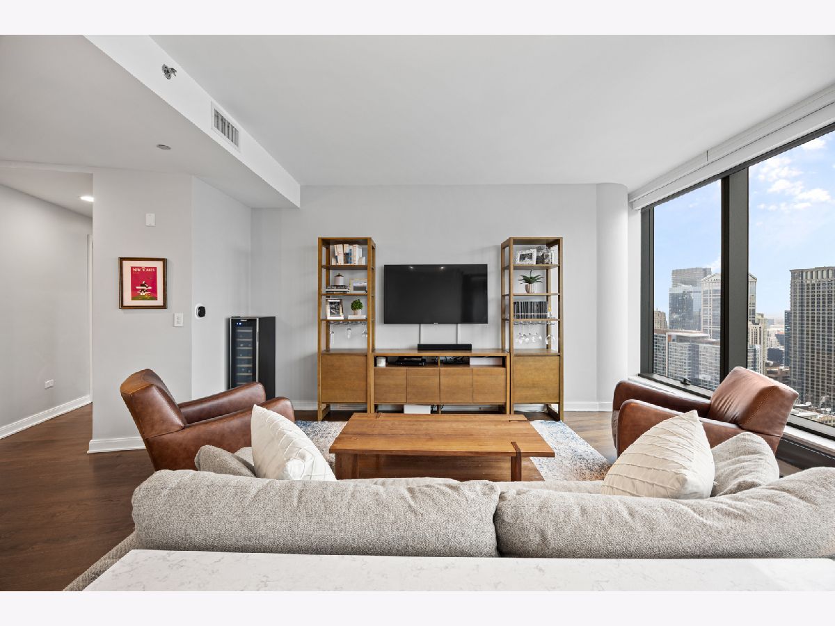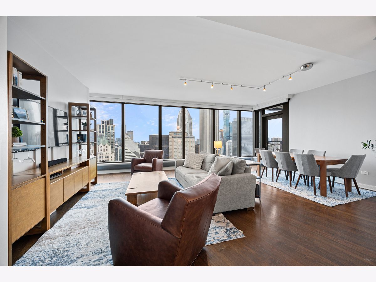Stunning 1,600-square-foot corner residence at The Legacy, offering unobstructed views of Millennium Park, Lake Michigan, and the city skyline. This highly upgraded home features floor-to-ceiling windows with motorized shades throughout, wide-plank hardwood floors throughout, and custom lighting. The newly renovated primary bath includes beautiful 4'x4' porcelain tiles, a separate whirlpool tub, large shower and double bowl vanity. The spacious primary bedroom has incredible NW views of the city skyline and a custom walk-in closet. The chef's kitchen is equipped with Sub-Zero and Bosch stainless steel appliances. Enjoy breathtaking northeast views from the spacious private terrace.The Legacy is a full-amenity building featuring multiple sky decks, resident lounges, an indoor lap pool, whirlpool, steam rooms, fitness center, dog run, dry cleaning services, and 24-hour door staff. Residents also enjoy direct access to the University Club, one of the city's premier private clubs. Ideally located just steps from Lake Michigan, Millennium Park, and public transportation. 1 prime deeded parking spot is available for purchase.
