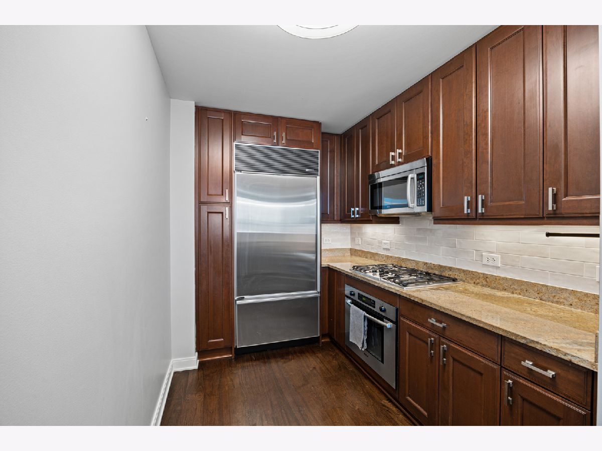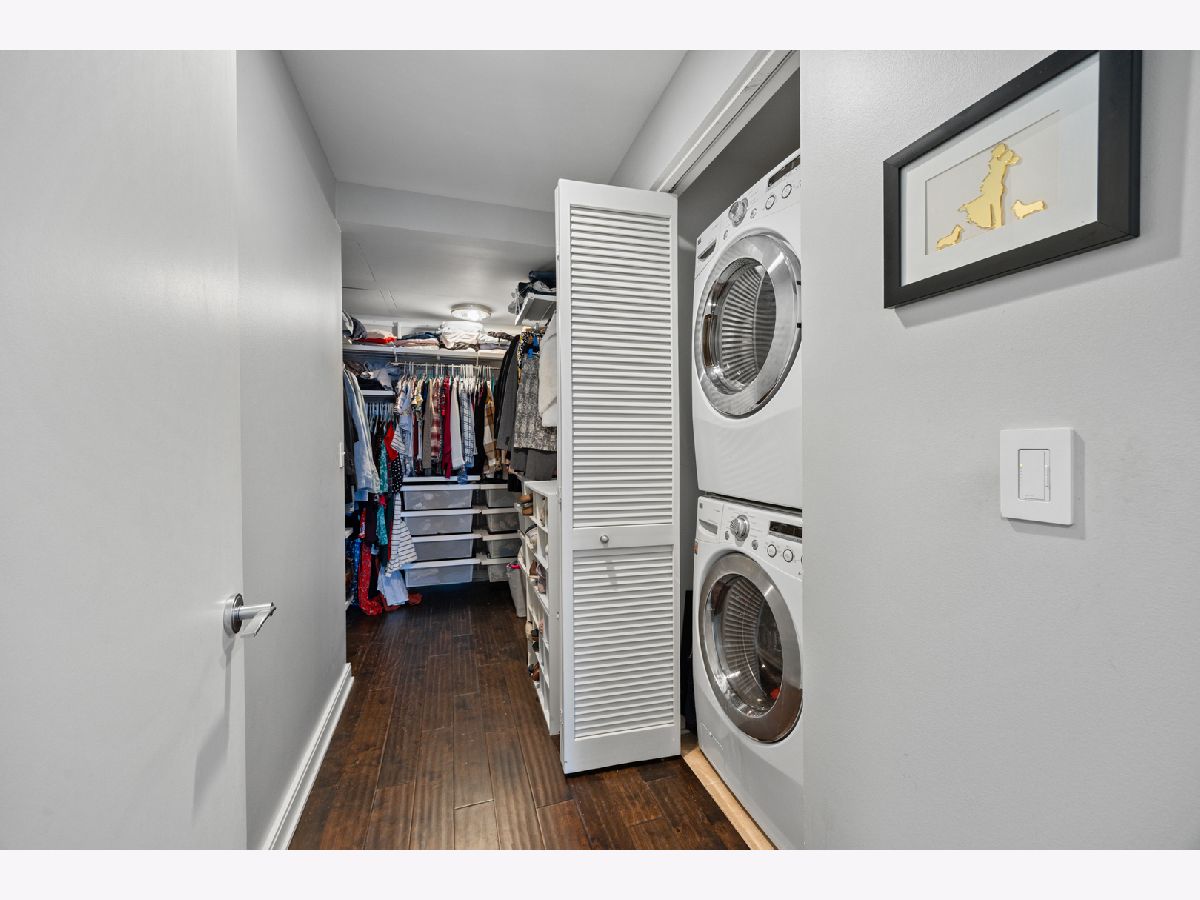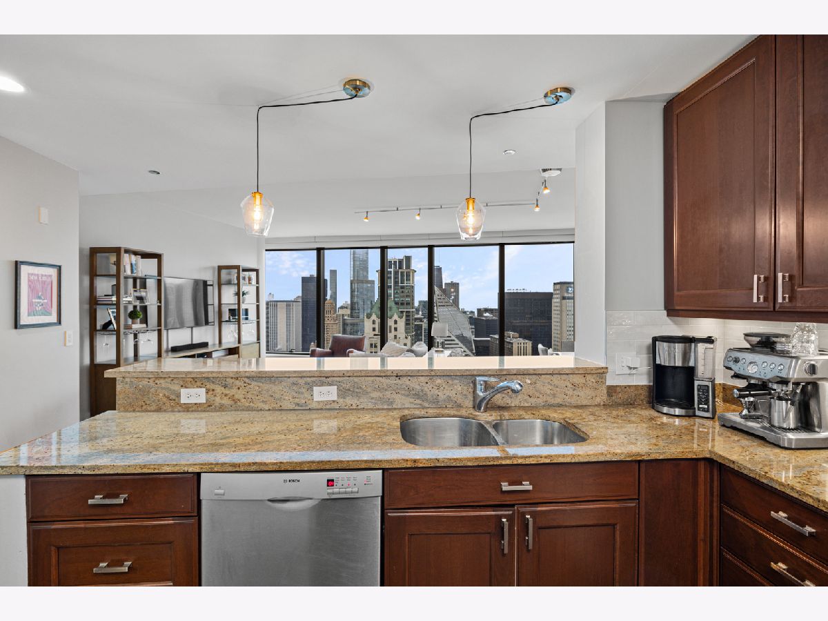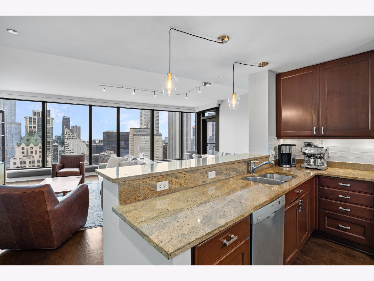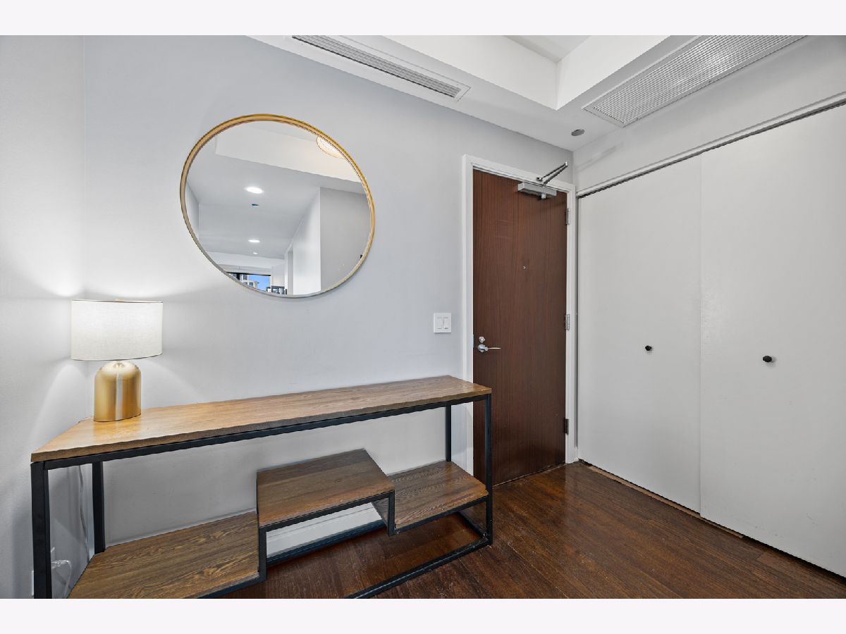 Stunning 1,600-square-foot corner residence at The Legacy, offering unobstructed views of Millennium Park, Lake Michigan, and the city skyline. This highly upgraded home features floor-to-ceiling windows with motorized shades throughout, wide-plank hardwood floors throughout, and custom lighting. The newly renovated primary bath includes beautiful 4'x4' porcelain tiles, a separate whirlpool tub, large shower and double bowl vanity. The spacious primary bedroom has incredible NW views of the city skyline and a custom walk-in closet. The chef's kitchen is equipped with Sub-Zero and Bosch stainless steel appliances. Enjoy breathtaking northeast views from the spacious private terrace.The Legacy is a full-amenity building featuring multiple sky decks, resident lounges, an indoor lap pool, whirlpool, steam rooms, fitness center, dog run, dry cleaning services, and 24-hour door staff. Residents also enjoy direct access to the University Club, one of the city's premier private clubs. Ideally located just steps from Lake Michigan, Millennium Park, and public transportation. 1 prime deeded parking spot is available for purchase.