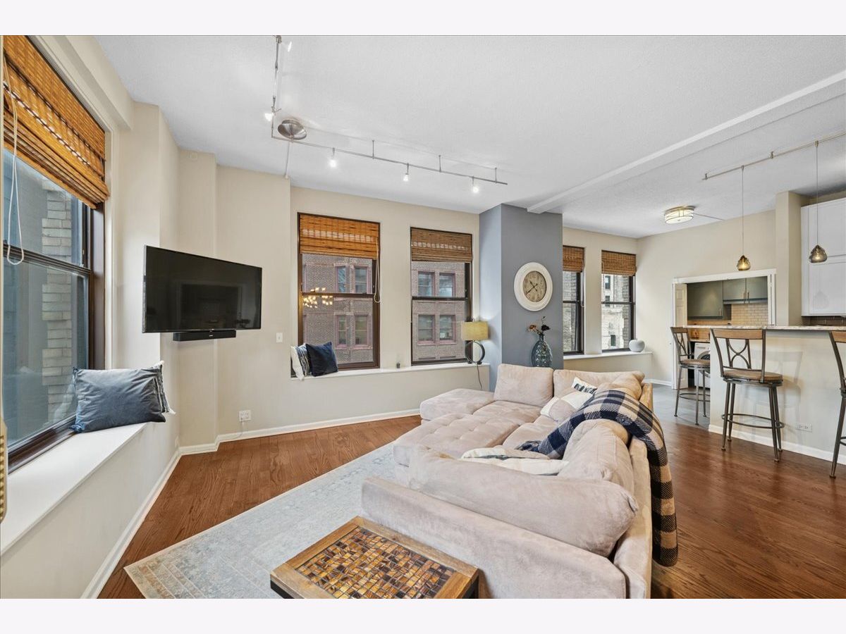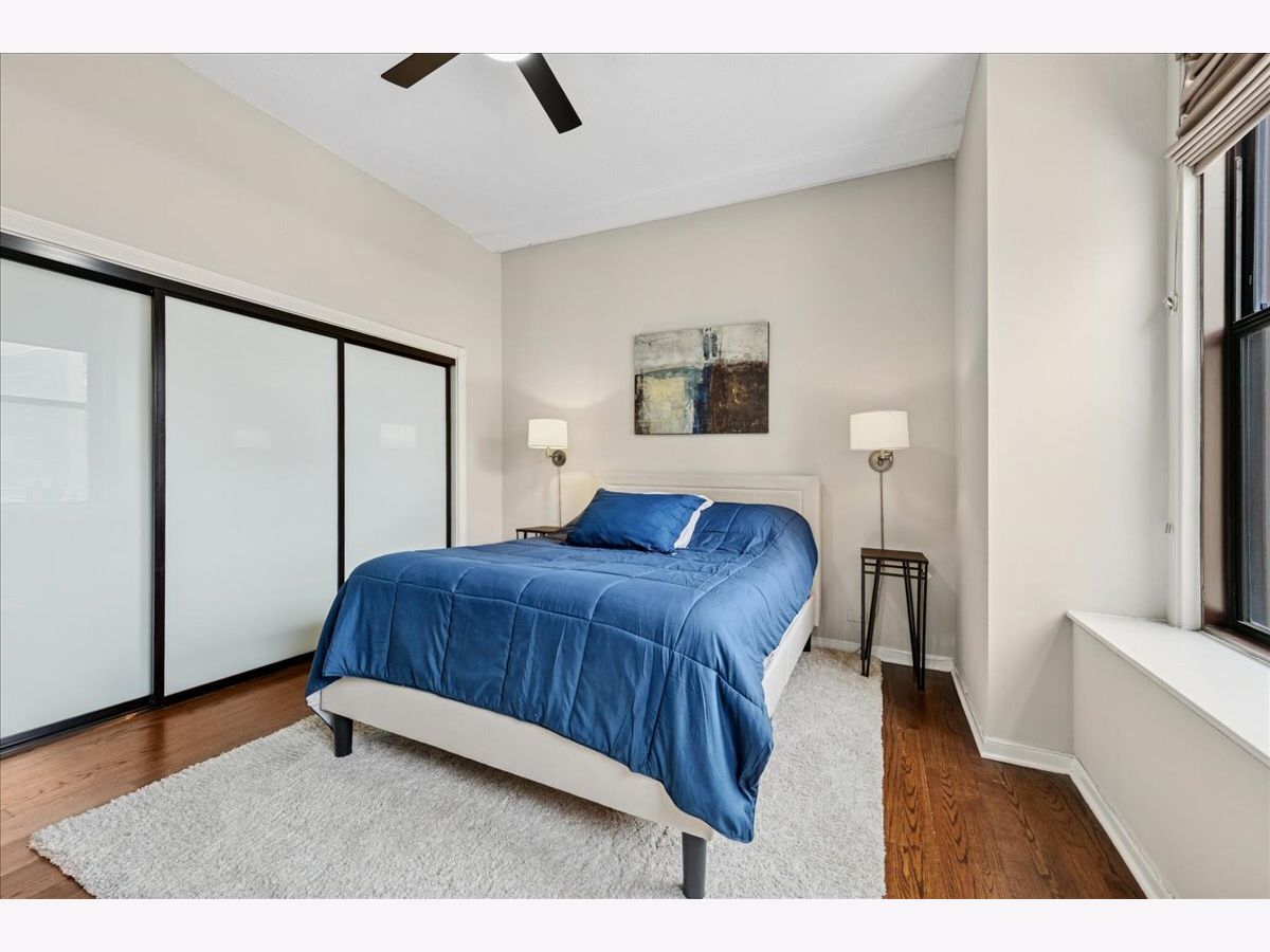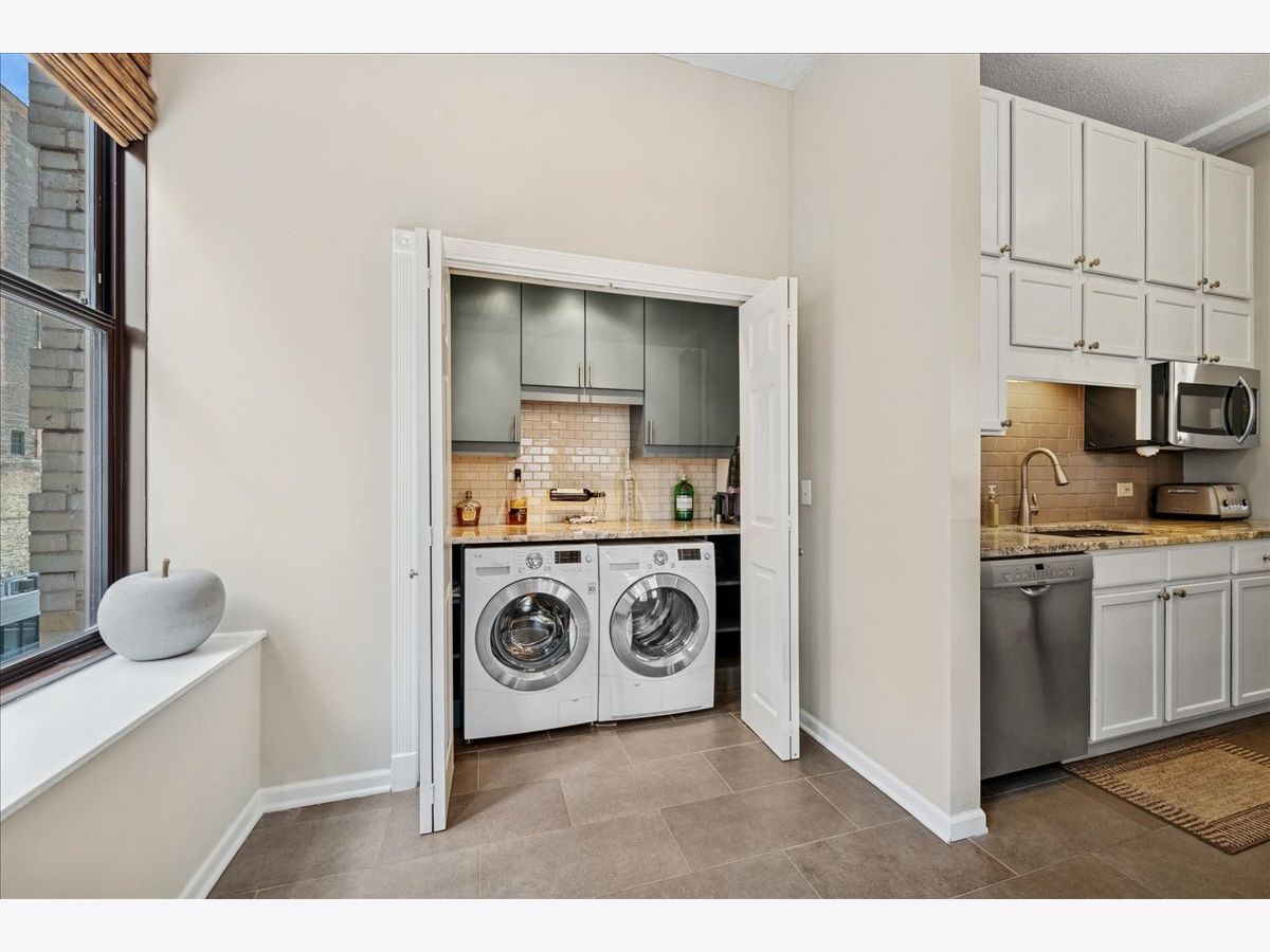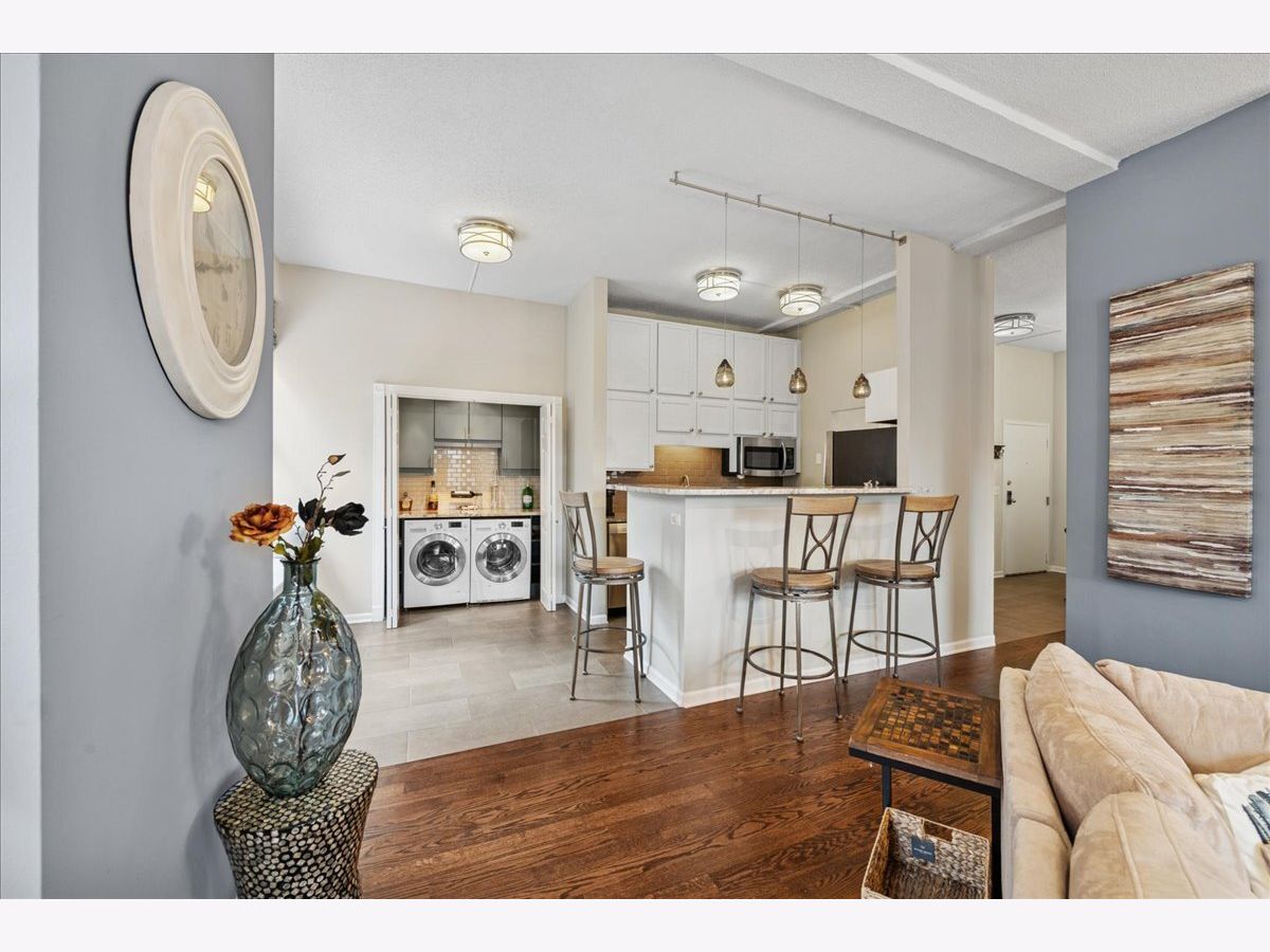 Welcome to city living at its finest! This stunning luxury condo in Printers Row is the perfect solution for Loop commuters or in-town property seekers with its bright corner layout, soaring ceilings, and open floor plan that's perfect for entertaining. This beautiful 2-bedroom, 1-bathroom gem features thoughtfully designed storage solutions throughout, plus smartly-placed in-unit laundry - side-by-side & right below the dry bar extension on the kitchen. Gorgeous dark hardwood floors throughout. You'll love the high-end custom lighting fixtures and custom window treatments that add an elevated touch. The kitchen is chef-ready with sleek 42" white cabinets, stainless steel appliances, and granite countertops. Both bedrooms offer true privacy with enclosed layouts, and the spacious primary bedroom features a custom organized closet system with premium sliding doors. Plus, there's an extra-large walk-in closet with additional organizers for all your storage needs-there is room for everything in here! The Transportation Building boasts some lovely amenities: 24-hour door staff, fitness center, bike storage, coin laundry, and convenient Tide dry cleaning lockers right onsite. There are plenty of parking options nearby, and you'll be steps from public transit (plus a stone's throw away from restaurants, parks, museums and the River Walk). 2-bedroom units in this building don't hit the market very often - schedule your showing before this one is gone!