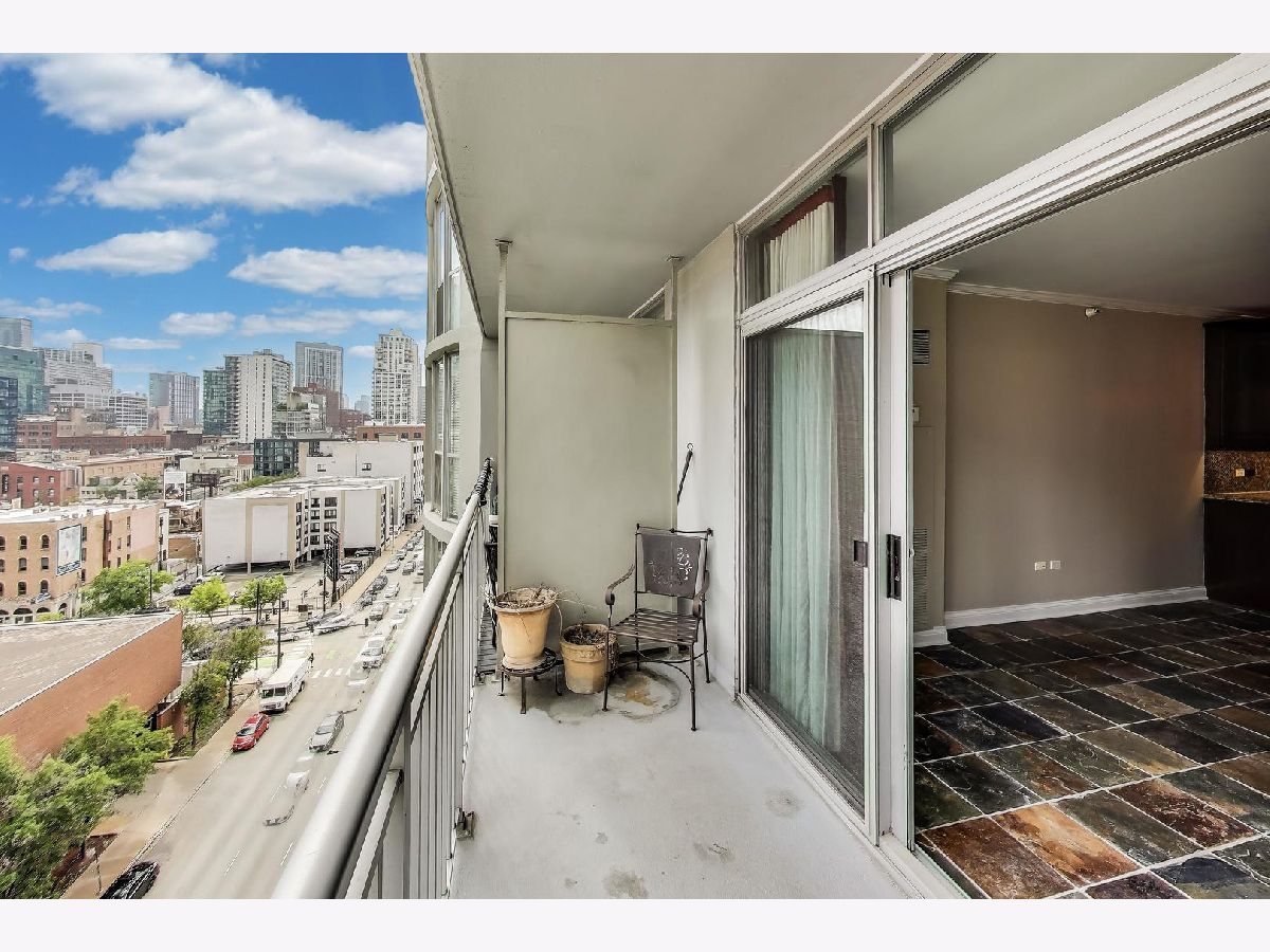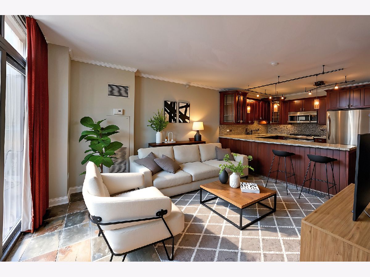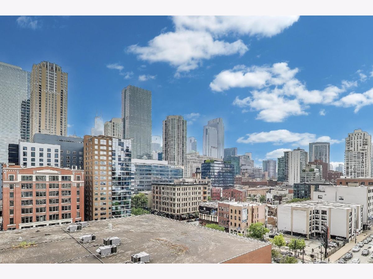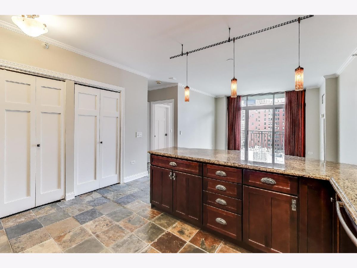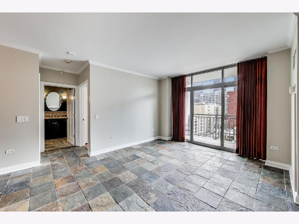 Welcome to this spacious one bed, one bath condo in the heart of River North, offering a private balcony with sweeping skyline views, modern upgrades, and a layout that truly lives large. This thoughtfully designed home offers an open-concept layout with slate tile flooring, tall ceilings, and floor-to-ceiling windows that fill the space with natural light. The modern kitchen features rich cherry cabinetry, granite countertops, a glass tile backsplash, stainless steel appliances, and a gas range with built-in microwave. A large breakfast bar with pendant lighting opens to the generous living and dining area-ideal for entertaining or everyday living. The king-sized bedroom offers hardwood floors, expansive windows, and a fully customized walk-in closet. The updated bath is finished with natural stone tile, a walk-in glass shower, and a clean, contemporary vanity light. Additional highlights include a full-size in-unit laundry closet, central air, and abundant storage with custom organizers throughout. Full-amenity building with 24-hour door staff, fitness center, on-site dry cleaners, and restaurants. Monthly assessments include cable, high-speed internet, and more. Located just steps from shopping, dining, the CTA Red Line, and everything River North has to offer. Heated garage parking available for an additional $20K.