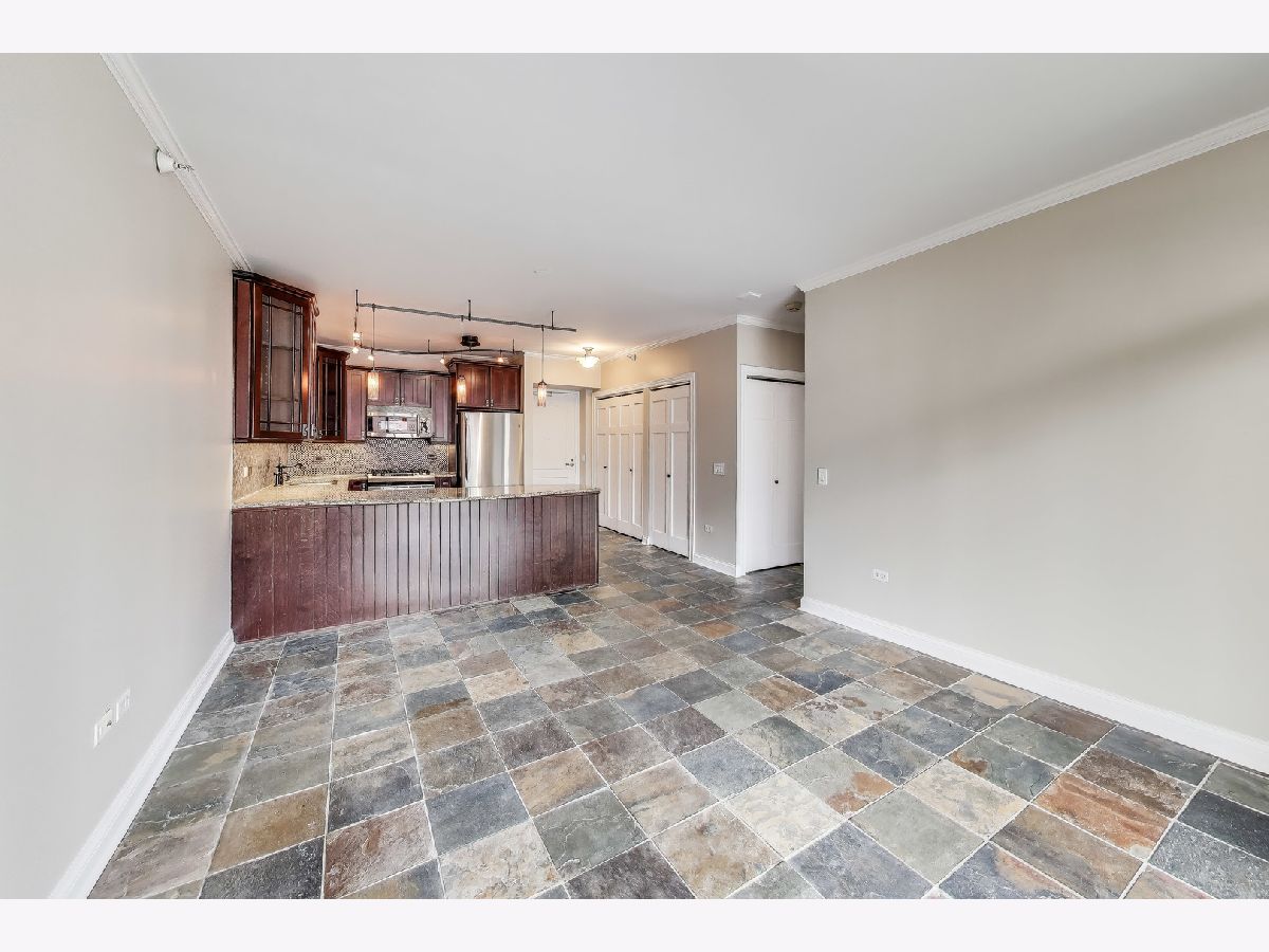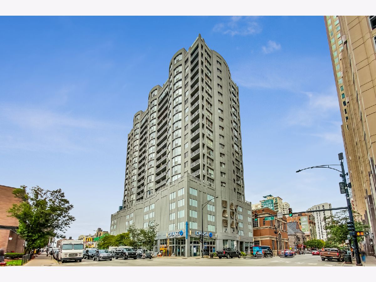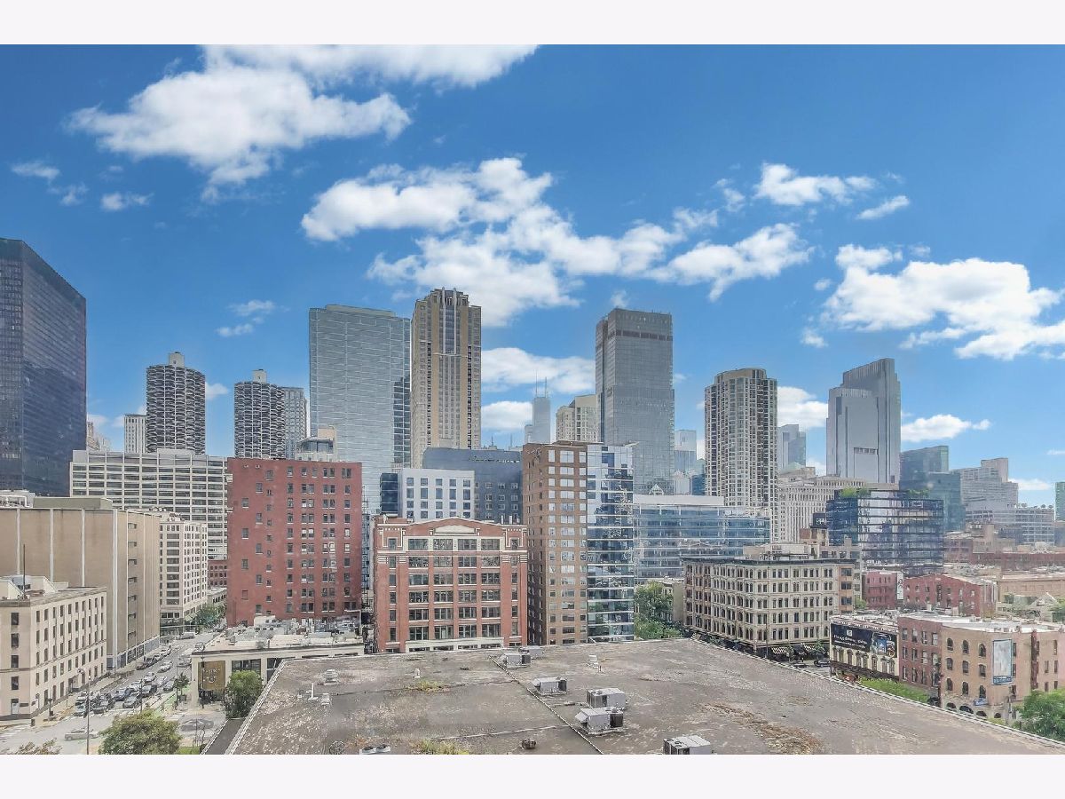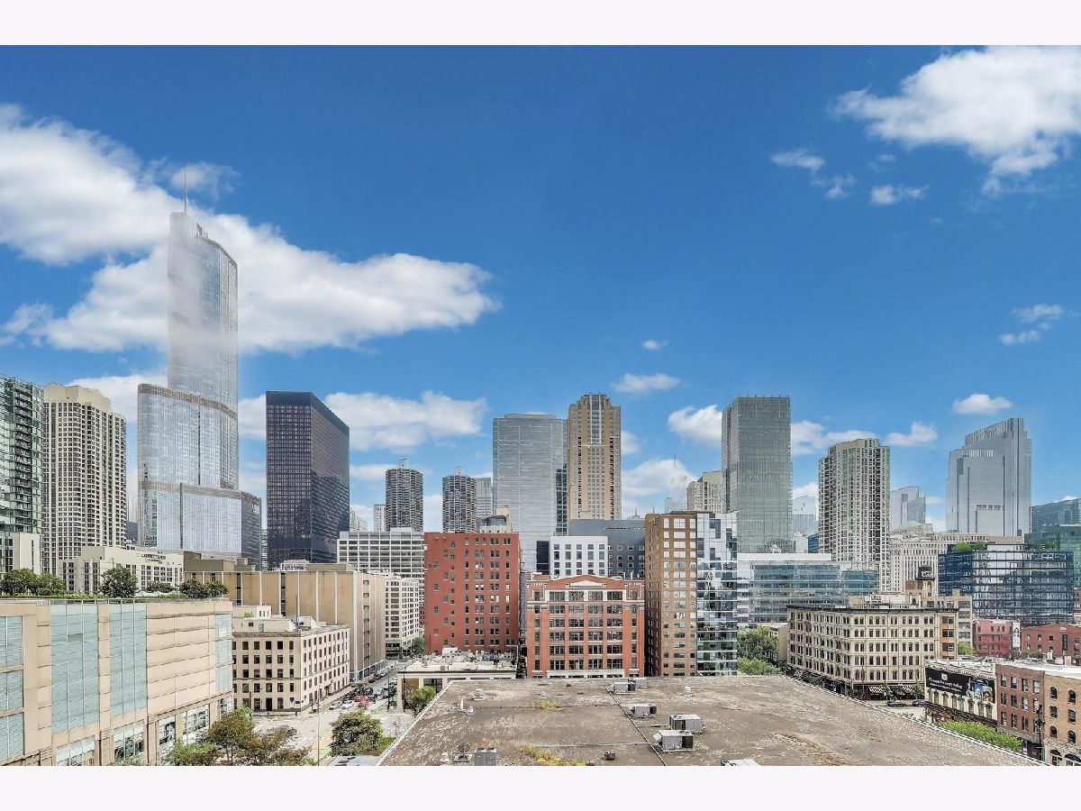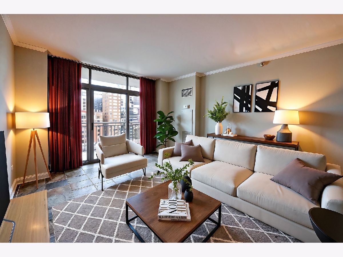 Welcome to this spacious one bed, one bath condo in the heart of River North, offering a private balcony with sweeping skyline views, modern upgrades, and a layout that truly lives large. This thoughtfully designed home offers an open-concept layout with slate tile flooring, tall ceilings, and floor-to-ceiling windows that fill the space with natural light. The modern kitchen features rich cherry cabinetry, granite countertops, a glass tile backsplash, stainless steel appliances, and a gas range with built-in microwave. A large breakfast bar with pendant lighting opens to the generous living and dining area-ideal for entertaining or everyday living. The king-sized bedroom offers hardwood floors, expansive windows, and a fully customized walk-in closet. The updated bath is finished with natural stone tile, a walk-in glass shower, and a clean, contemporary vanity light. Additional highlights include a full-size in-unit laundry closet, central air, and abundant storage with custom organizers throughout. Full-amenity building with 24-hour door staff, fitness center, on-site dry cleaners, and restaurants. Monthly assessments include cable, high-speed internet, and more. Located just steps from shopping, dining, the CTA Red Line, and everything River North has to offer. Heated garage parking available for an additional $20K.
