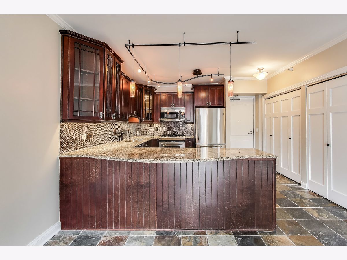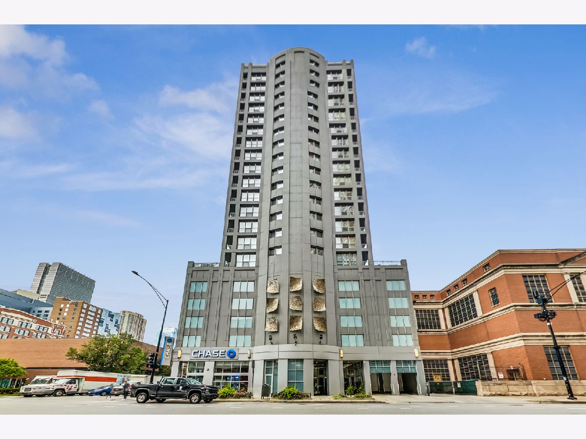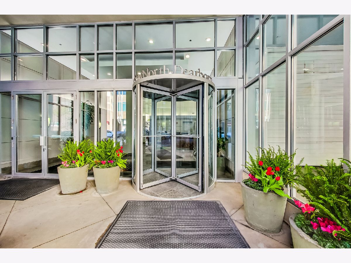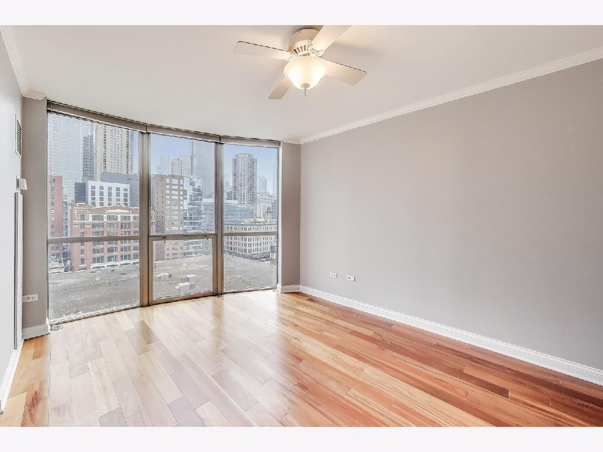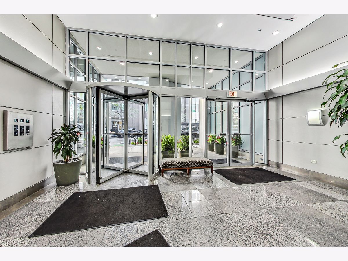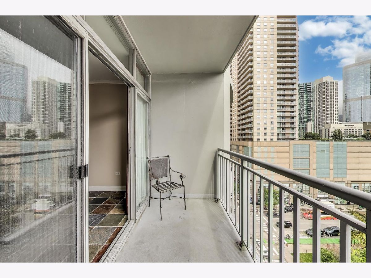 Welcome to this spacious one bed, one bath condo in the heart of River North, offering a private balcony with sweeping skyline views, modern upgrades, and a layout that truly lives large. This thoughtfully designed home offers an open-concept layout with slate tile flooring, tall ceilings, and floor-to-ceiling windows that fill the space with natural light. The modern kitchen features rich cherry cabinetry, granite countertops, a glass tile backsplash, stainless steel appliances, and a gas range with built-in microwave. A large breakfast bar with pendant lighting opens to the generous living and dining area-ideal for entertaining or everyday living. The king-sized bedroom offers hardwood floors, expansive windows, and a fully customized walk-in closet. The updated bath is finished with natural stone tile, a walk-in glass shower, and a clean, contemporary vanity light. Additional highlights include a full-size in-unit laundry closet, central air, and abundant storage with custom organizers throughout. Full-amenity building with 24-hour door staff, fitness center, on-site dry cleaners, and restaurants. Monthly assessments include cable, high-speed internet, and more. Located just steps from shopping, dining, the CTA Red Line, and everything River North has to offer. Heated garage parking available for an additional $20K.