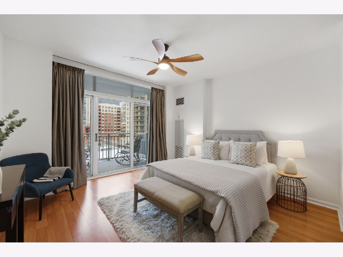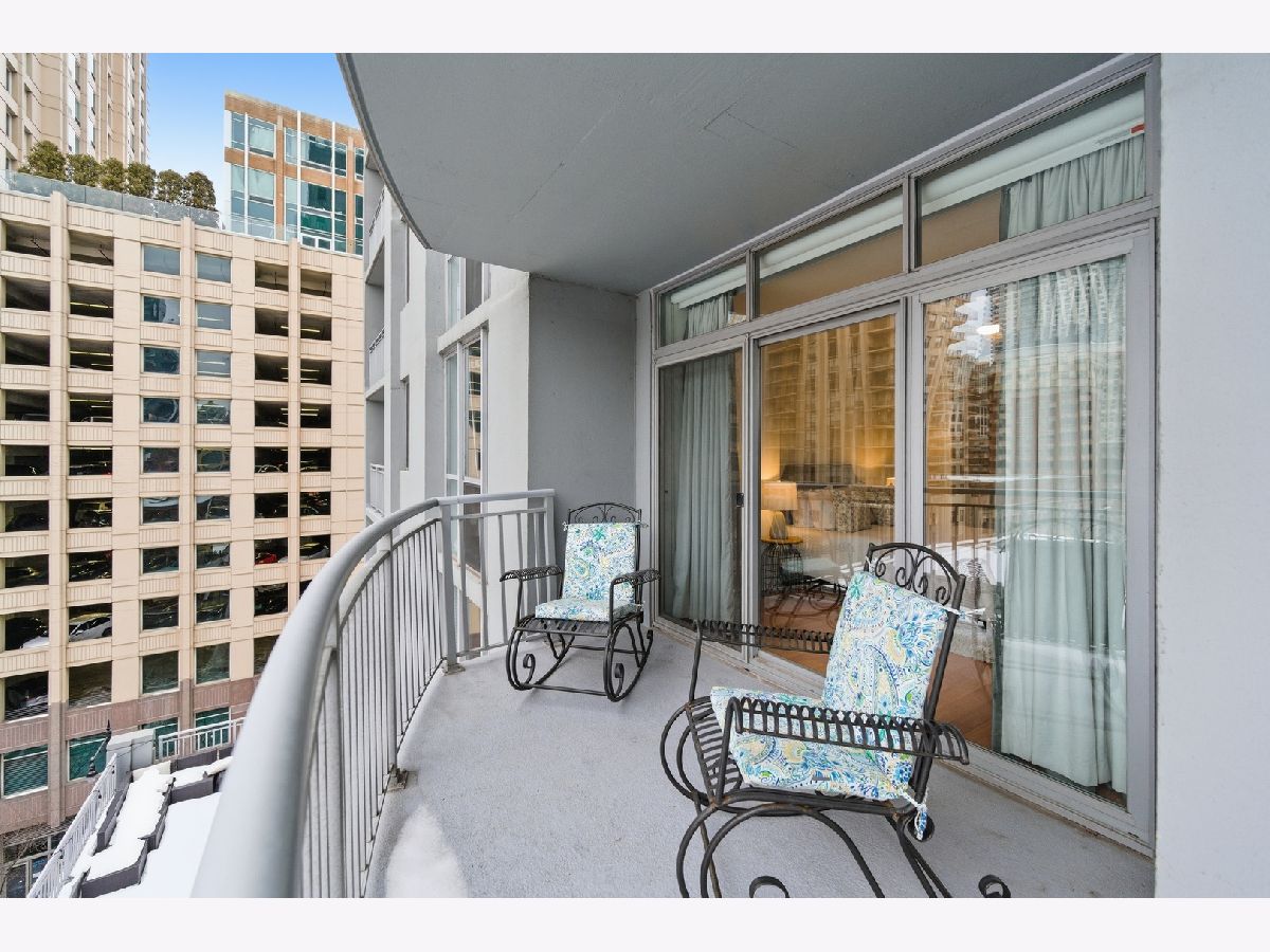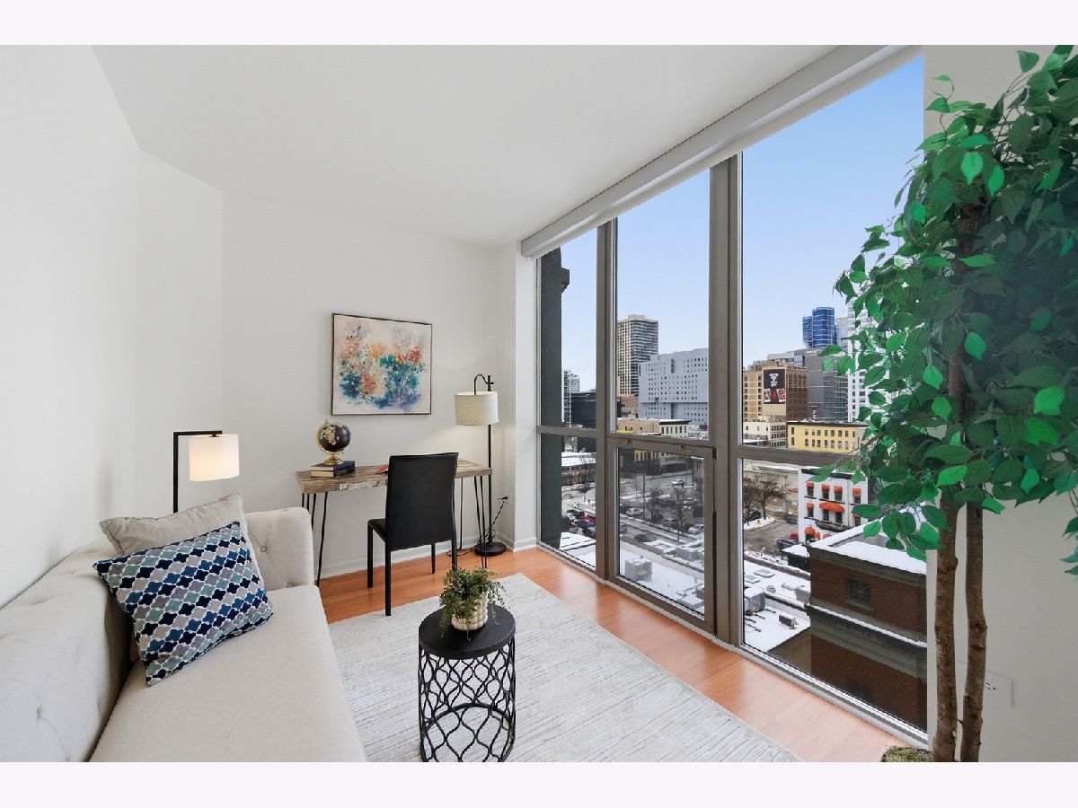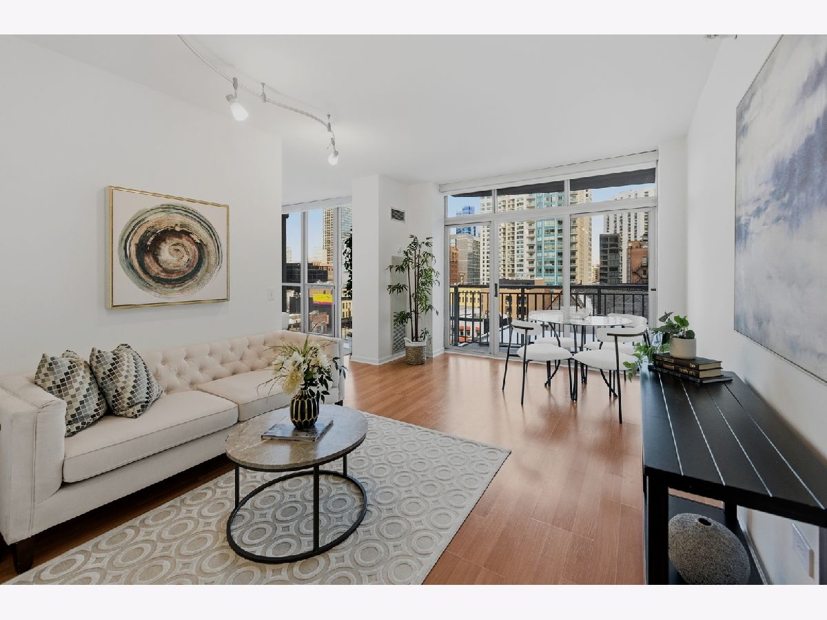 Welcome to this beautifully maintained 1-bedroom plus den, 1 1/2 - bath home in the heart of River North. An open-concept floor plan is enhanced by floor-to-ceiling windows that span the length of the residence, filling the space with natural light. Entertain on the extra-wide balcony-accessible from both the living room and primary suite-and enjoy sweeping north and west city views. The home offers a generously sized living and dining area, a comfortable primary suite, and a versatile den ideal for a home office or guest space. The updated kitchen features extensive cabinetry, a stylish backsplash, stainless steel appliances, and a newer refrigerator. The primary bath boasts a separate shower and tub, a newer vanity, mirror and light fixture as well as a linen closet. Roller shades and elegant drapery add warmth and sophistication throughout. Additional highlights include in-unit laundry, one garage parking space, and extra storage. This full-amenity building offers 24-hour door staff, a fitness center, sundeck, party room/hospitality suite, and on-site management. Monthly assessments include heat, air conditioning, water, cable, Wi-Fi, common insurance, door staff, exercise facilities, exterior maintenance, scavenger service, snow removal and parking. Ideally located with easy access to the Magnificent Mile, world-class shopping, dining, nightlife, and CTA transportation.