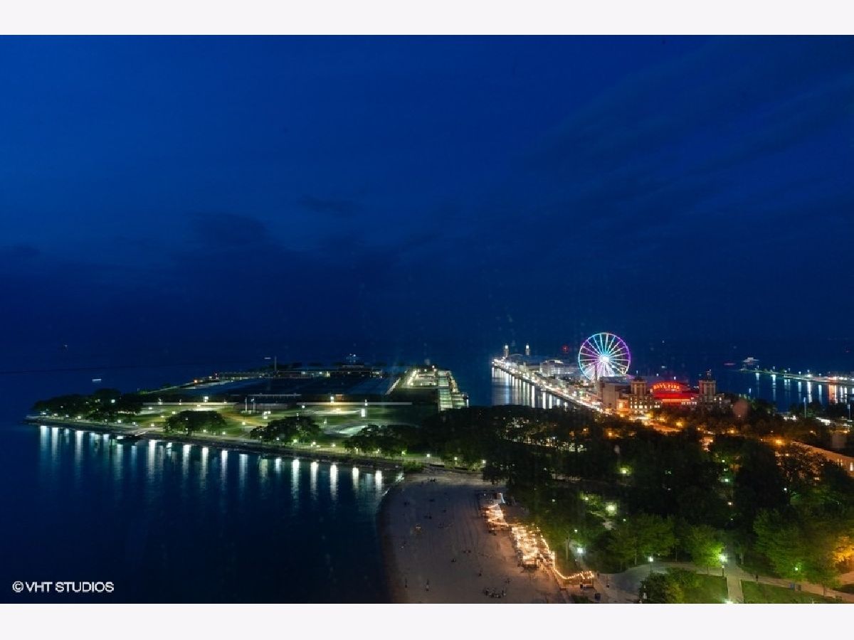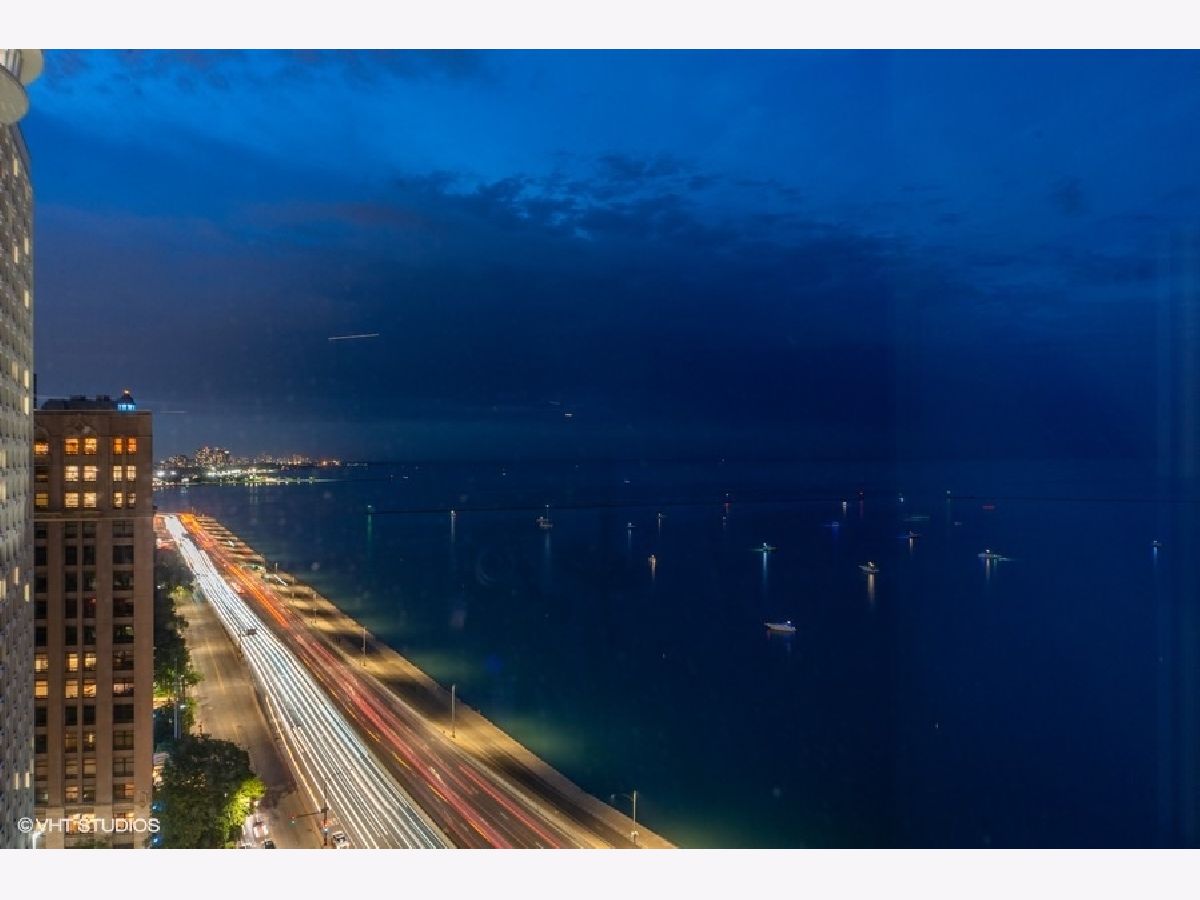 Greeted by a large open foyer dressed in travertine, with wonderful unobstructed views of Lake Michigan, the boats and ever popular Playpen. 4" natural cherry hardwood floors, Signature Belgravia tiered baseboards and moldings. Enormous walk in closet for bulk kitchen storage. Side by side LG Tromm Steam front load washer and dryer. A four person + kitchen with plenty of counter space for food prep and food display at holiday time. Raised bar for seating. Open kitchen to living and dining areas,. Upgraded GE Profile stainless steel appliances, Refrigerator with ice/water dispenser. Double oven. Overhead microwave and cooktop. Brookhaven Mahogany cabinetry with elegant crown and tumbled glass panes, rounded edge granite counters. Dry bar off living room with rounded granite. 2540 square foot true three bedroom split floor plan with 3.1 bathrooms. Third bedroom with views of Oak Street Beach, Olive Park and Navy Pier. Third bath dressed in consistent travertine, raised vanity, honed travertine counter All Kohler plumbing fixtures and large shower. Second full bath in travertine. Large balcony for at least a four top comfortably accessible from living room and second bedroom looking north up LSD, Lake Michigan and North Avenue Beach. Master suite with his and hers walk in closets, separate soaking tub and large shower. Bathroom is dressed in natural marble all light wood vanities and honed travertine counters. Roller shades throughout. Full amenities include 24 hour doorstaff, onsite management and maintenance, two roof top decks, party/lounge rooms and full kitchens. State of the art gym WITH NEW PILATES REFORMER AND GOLF SIMULATOR. Dry cleaners. Two garage side by side parking spaces (P536, P537) are $50,000 each. A third parking space can be purchased. Asking price is $50,000. FOUR PIPE HEATING AND COOLING SYSTEM.