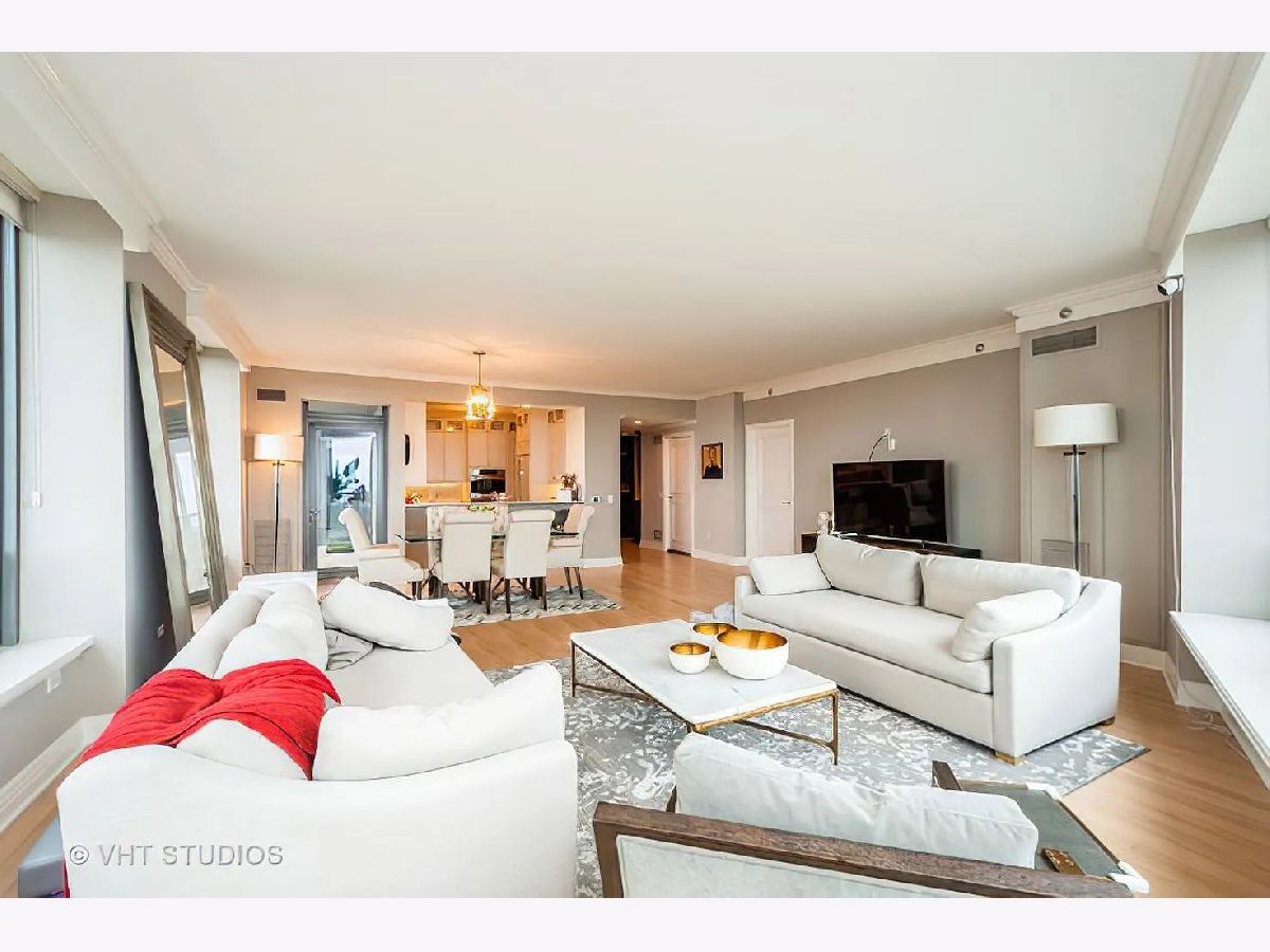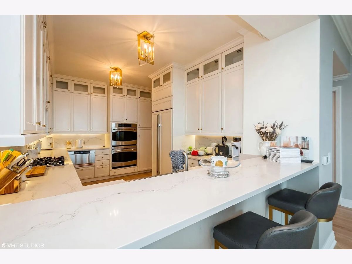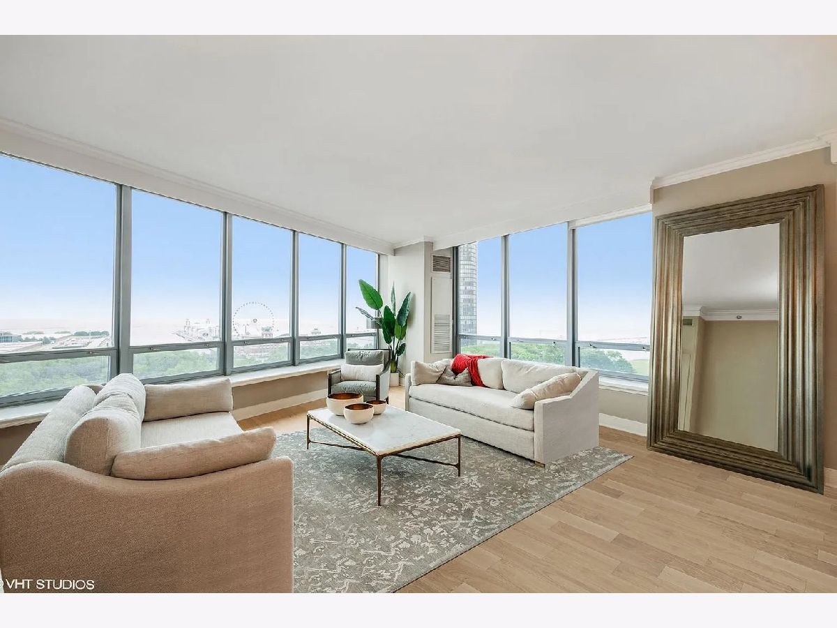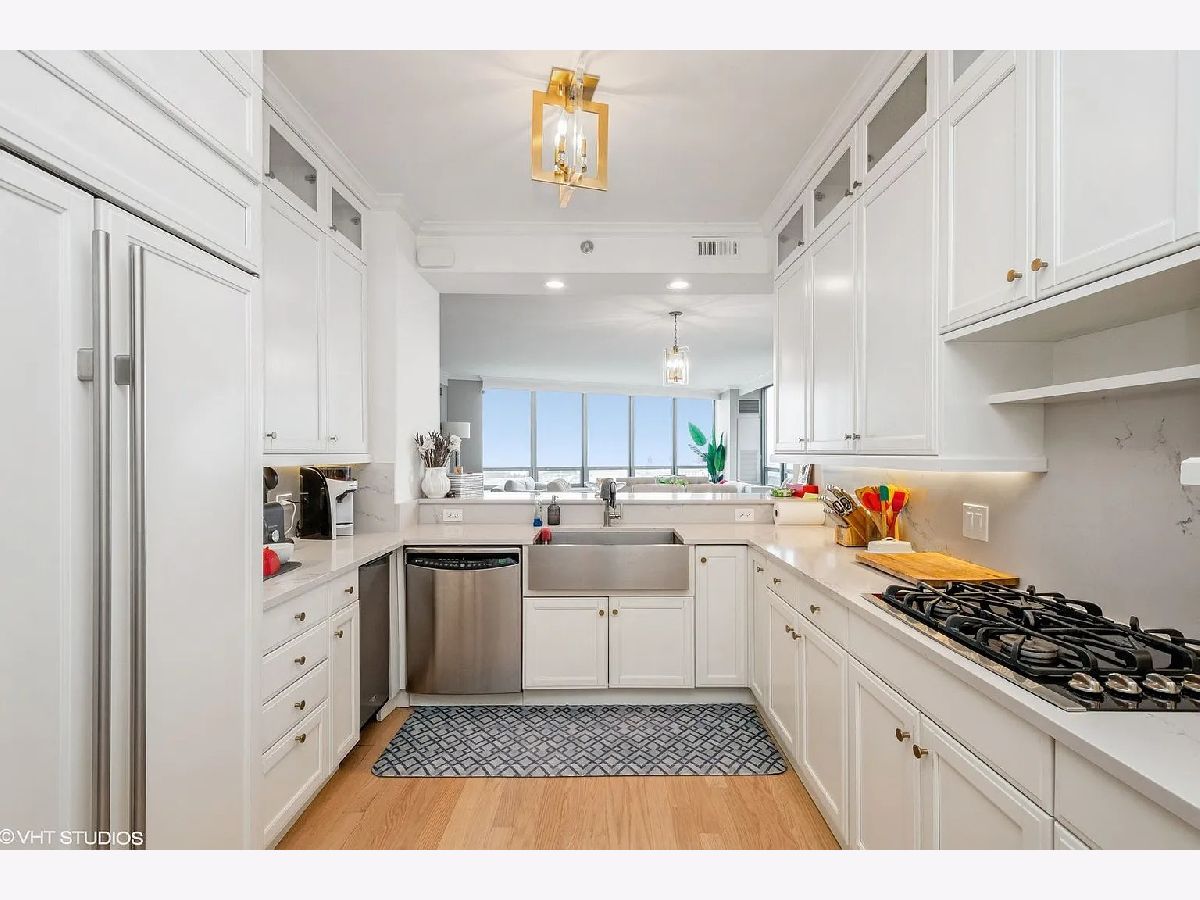 Refined quality and distinctive style only begin to describe this 3-bedroom luxury residence. From the moment you step inside, you'll fall for the rich and tasteful finishes starting in the foyer with the elegant overhead designer light fixture nestled in the trey ceiling. Custom millwork throughout includes crown molding, solid core paneled doors, window seats, white kitchen cabinetry throughout, and an amazing butler's pantry. Butler's pantry is ebony wood/glass with imported backsplash, custom hammered sink, and wine cooler. The gourmet kitchen boasts Subzero refrigerator, Dacor microwave, Bosch dishwasher, Wolf double oven, new Caesarstone Quartz countertops with full backsplash, wood flooring, unique ice maker, single bowl sink, custom lighting, custom pulls, custom cabinets to the ceiling with glass inserts, and breakfast bar seating for four. The living/dining area features unobstructed stunning lake views, custom-designed window seating, refinished hardwood floors, and access to the private south facing balcony. Escape to serenity in the master suite with views, wood floors, and two large walk-in closets. Master bath is spa-like with white cabinetry, custom lighting, glass-surround shower, and soaking tub. Second bed has Navy Pier views, en-suite bath with white cabinetry, refinished hardwood floors, and direct balcony access. The third bedroom again offers en-suite bath, white cabinetry, refinished hardwood floors, unobstructed Ohio Street beach, lake, and Navy Pier views. 600 Lake Shore Drive features a luxurious lobby to greet guests, enormous private covered driveway, 24-hour door staff, 24-hour maintenance, on-site management, valet cleaners, fully equipped business center, fabulous fitness center open 24/7 with top-of-the-line equipment and yoga room, 2 recently remodeled roof-top community rooms with floor-to-ceiling windows including full kitchens, and terraces with unobstructed lake and city views, patio furniture, fire pits, outdoor grills with dining and sunbathing areas, separate storage, and bike room. Steps from Ohio Street Beach, the lakefront bike path, Navy Pier, Northwestern University and Hospital, award-winning restaurants, and The Magnificent Mile shopping district.