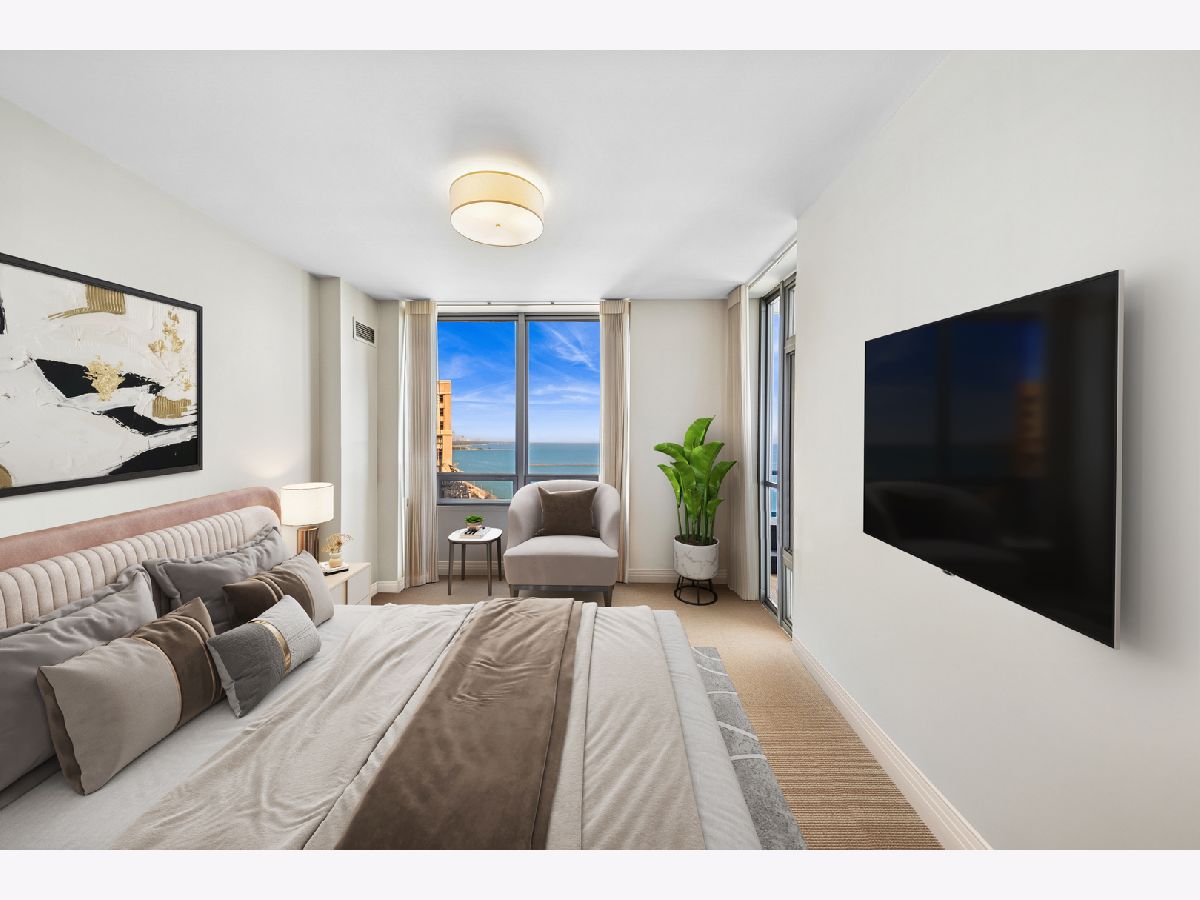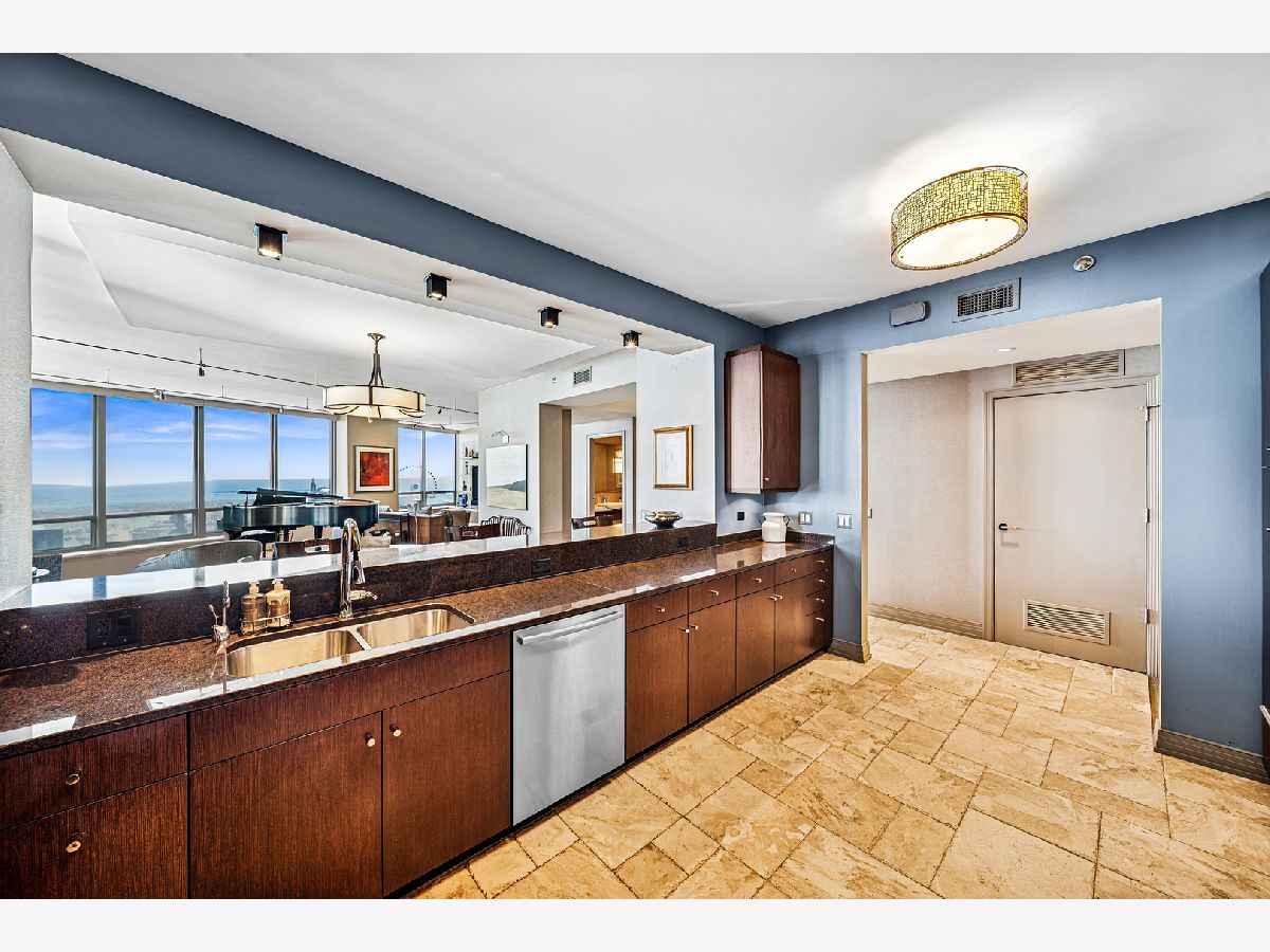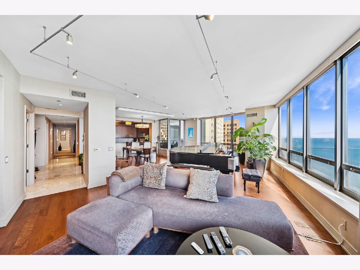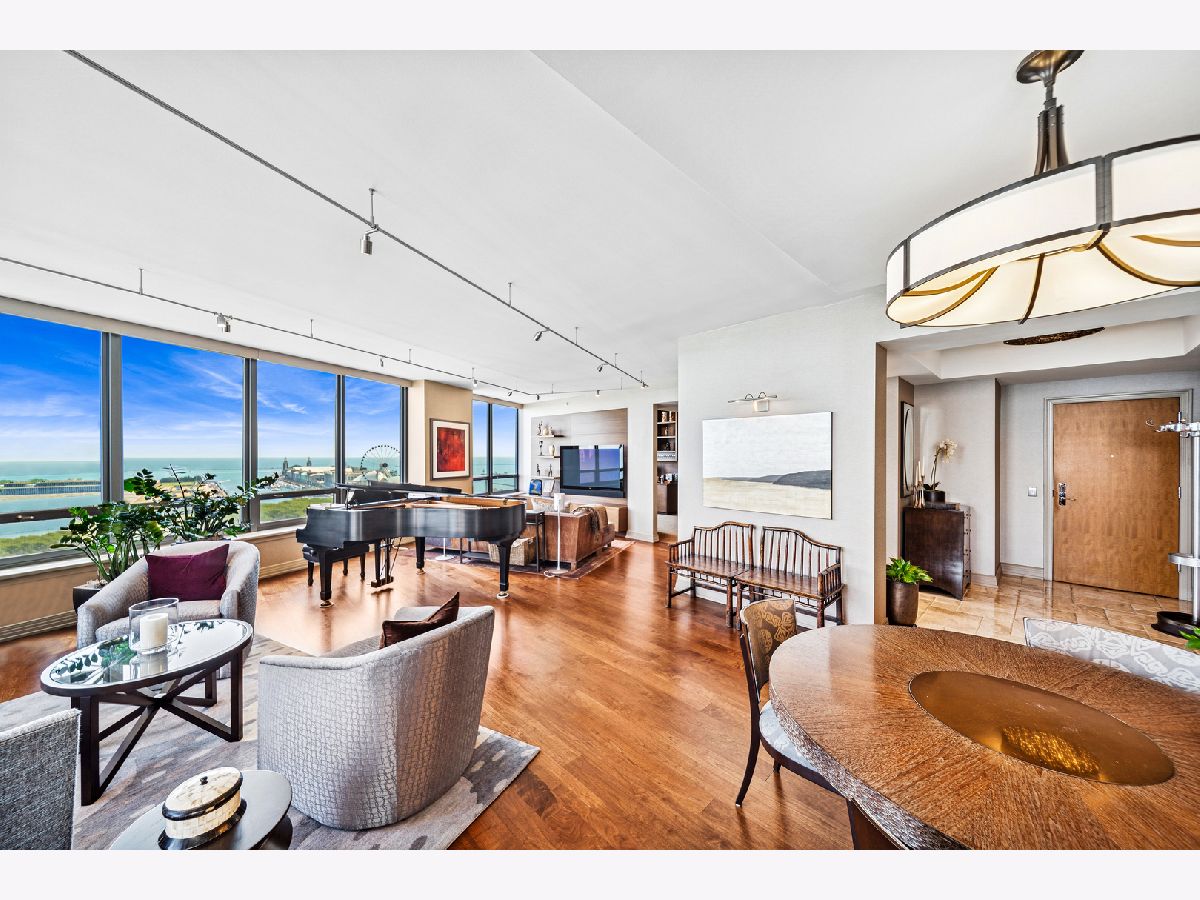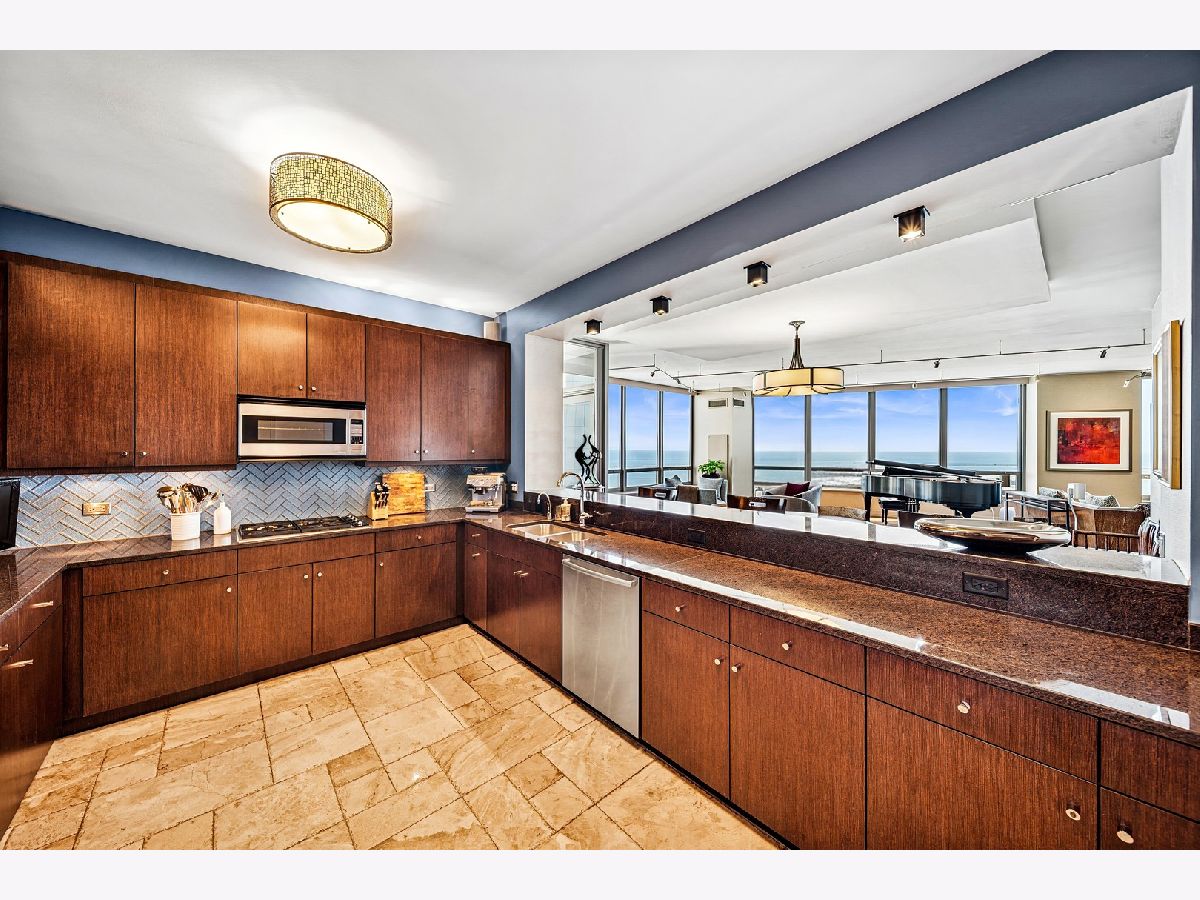 Spectacular northeast water views in the largest North Tower three-bedroom home at 600 Lake Shore! Enter the dramatic foyer with elegant tray ceiling, Tuscan style tile floor, and custom lighting which instantly reveals sweeping views of the lake, Ohio Street Beach, Olive Park and Navy Pier from every window. Upon entry, the soothing earth tone color palette blends seamlessly with the blue hues of the lake views. The gourmet kitchen opens to the living/dining area with Tuscan style tile floor, rich wood cabinetry with custom pulls, undermount lighting, full tile backsplash, sleek dark granite counters, filtered water dispenser, and premium stainless steel appliances including luxury brands Sub-Zero fridge, Bosch dishwasher, Wolf double oven, and Dacor microwave. The oversized breakfast bar easily accommodates five full size seats. Entertain with ease with the open living/dining/kitchen floor plan with access to a large inset balcony perfect for enjoying morning coffee or cocktails with the backdrop of magnificent Lake Michigan. Designer touches include custom window coverings and custom lighting throughout. The exquisite cherry wood flooring, with in-floor hidden outlets, extends into the living space overlooking the lake allowing for an additional seating area configured with a built-in electronics cabinet and shelving. The lavish master suite also offers lake views, custom carpet, custom ceiling fan, and features two large walk-in closets with built-ins. The ensuite private master bath includes double granite vanities with custom pulls, custom mirror with attached lighting, custom wall coverings, soaking tub, and walk-in waterfall marble shower. The second bedroom also features premium carpet and north views, along with an expanded walk-in closet and private balcony access. Located conveniently across the hall, the second bath was completely gutted and refinished, now featuring custom vanity and sleek Robern mirror, along with a walk-in shower with floor to ceiling marble. The third bedroom has been completely redesigned into an inspiring office/den space with lake views including custom finishes floor to ceiling featuring built in desk, shelving, and cabinets with integrated outlets and lighting. The stunning powder room is conveniently located off the foyer for guests which features a custom vanity, designer mirror, and custom wall coverings. The laundry room is located off of the kitchen and accommodates a full-size side-by-side washer and dryer with on-wall storage shelves. With meticulous interior design in the finishes of this home including whole home integrated audio, in-wall speakers, and accent lighting for artwork, it invites luxury, comfort and relaxation at the best address on the lake, 600 LSD! Seller prefers to close at the end of April.