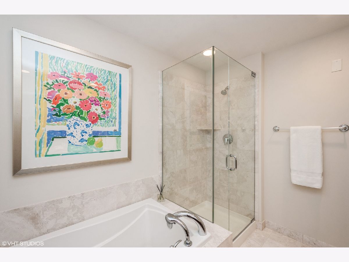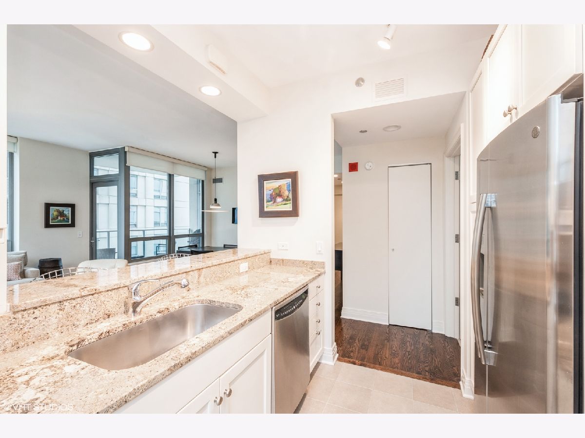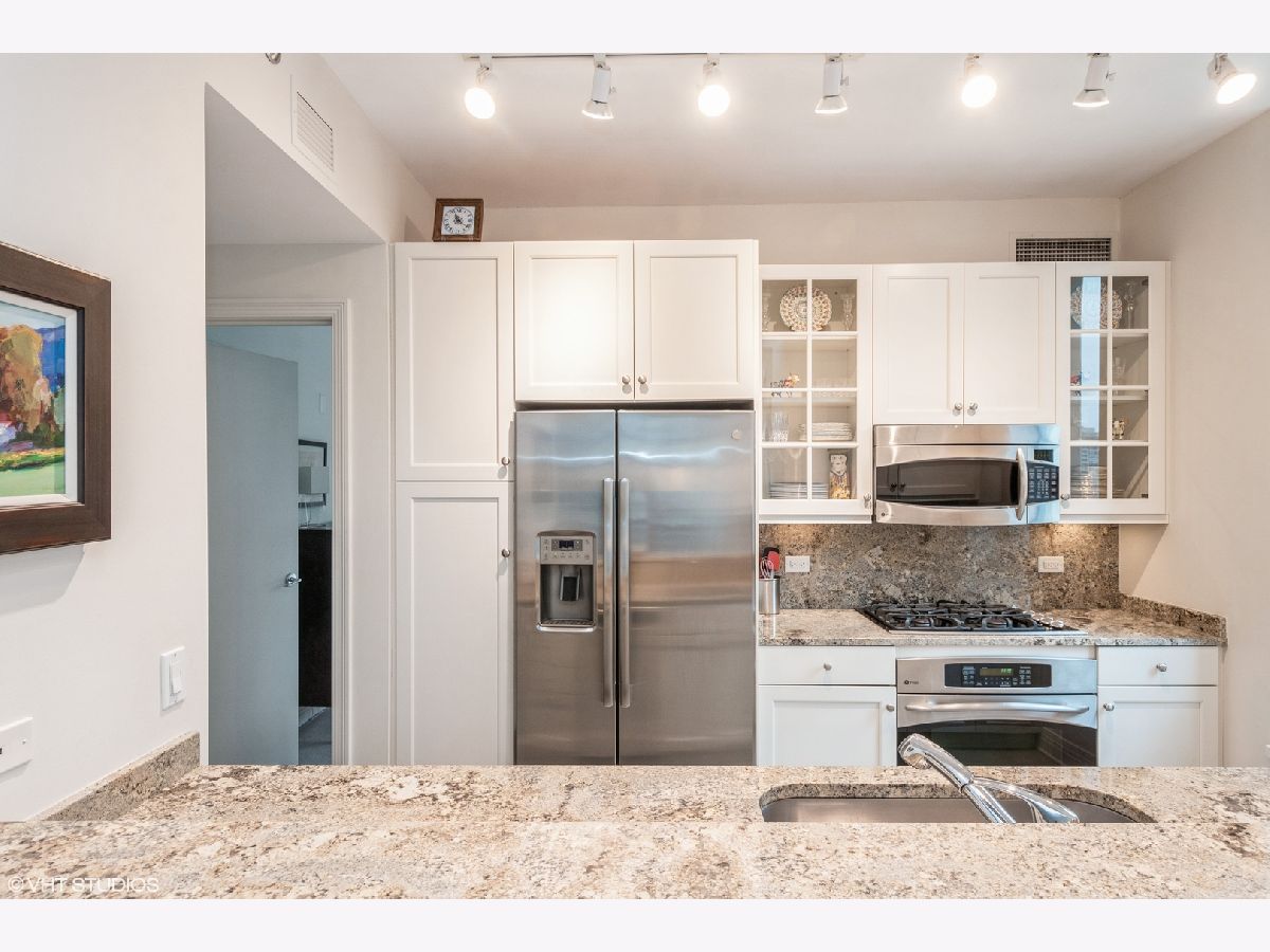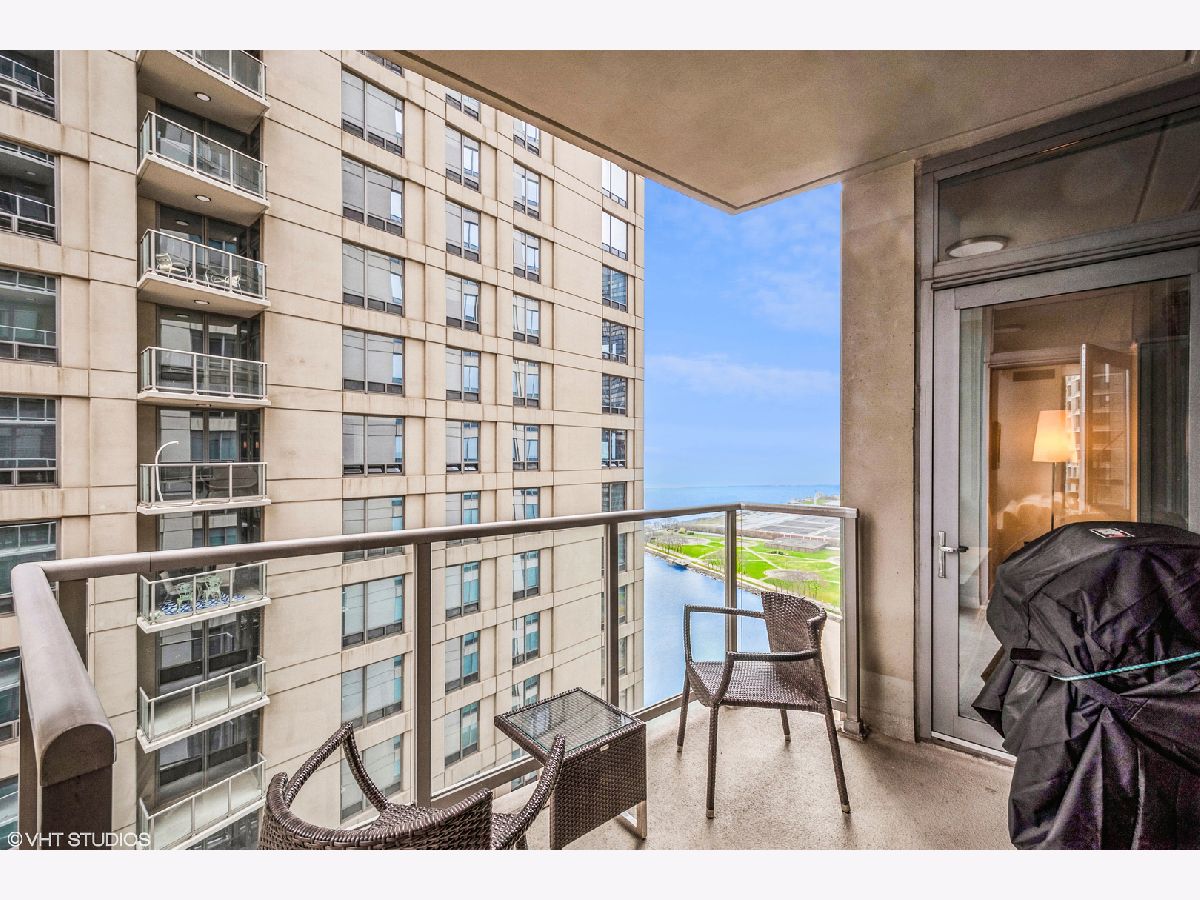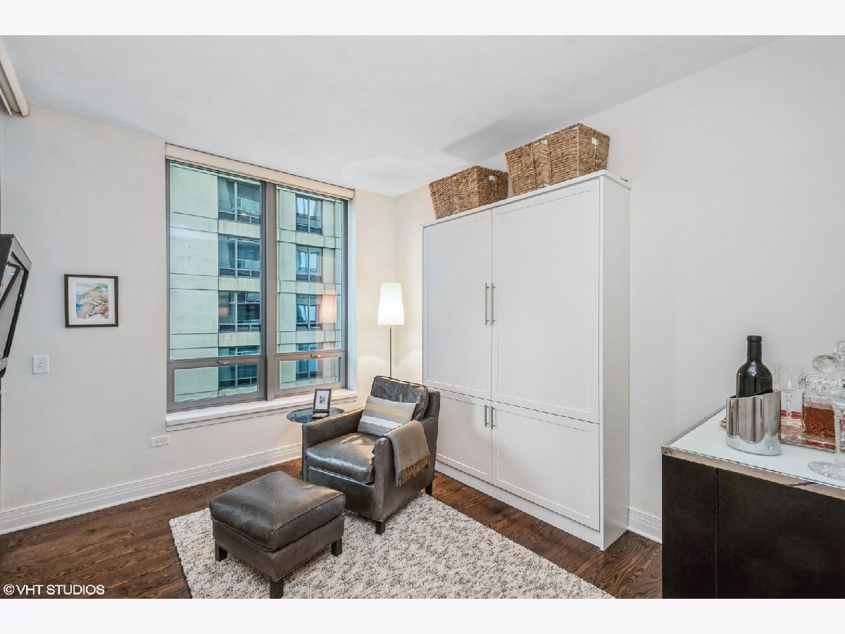 Updates/Improvements: New fridge in January 2020, new designer carpet in master bed in August 2020, kitchen features white cabinets/glass fronts, full height granite backsplash, track lighting, roll out drawers and single bowl sink, marble cleaned and sealed by Prestige Grout & Marble in the master shower, kitchen, and both baths in January 2022, master bath vanity refinished and anti-etch treatment with a 10-year warranty, custom built-in closets throughout, glass shower door in 2nd bath, custom lighting in the foyer and dining room from Lightology, safety locks on both balcony doors, hardwood floors in living/dining/foyer/2nd bedroom with custom dark stain, custom Queen-size Murphy wall bed in 2nd bedroom. Dramatic city views abound in this highly upgraded split 2 bedroom, 2 bath northwest corner condo in perfect move-in condition! You are greeted with elegance starting with the custom dark stained hardwood flooring extending from the foyer into the hallway and open living/dining area, along with a custom-built coat closet, and even extra storage above the side-by-side washer/dryer. Spectacular views of the lake are enjoyed from the balcony, which is accessible from both the living room and the second bedroom/study, west views of the city are seen throughout, and south and west views of the city lights from the master bedroom to end your day. The west facing kitchen has a window for fresh air and boasts full granite backsplash and countertops, single bowl sink, stainless-steel appliances and newer refrigerator, a breakfast bar which opens to the living/dining area, along with refreshing white tall cabinetry with glass fronts doors and custom pull-out drawers. Retreat to the spacious master suite offering a custom-built walk-in closet with newer designer carpet and a master bath including dual vanities with marble tops that have been refinished including an anti-etch treatment with a 10-year warranty, walk-in shower with a premium custom shower door, and separate tub with all marble surrounds. 2nd bedroom features a custom-built Queen-size Murphy bed providing the ultimate room versatility as either home office/study or instant guest room. The second bathroom includes all marble surrounds and a custom shower door. Murphy bed can be removed if needed prior to closing. Finishing touches include custom lights in the foyer and dining room from Lightology and custom track lighting in the kitchen.