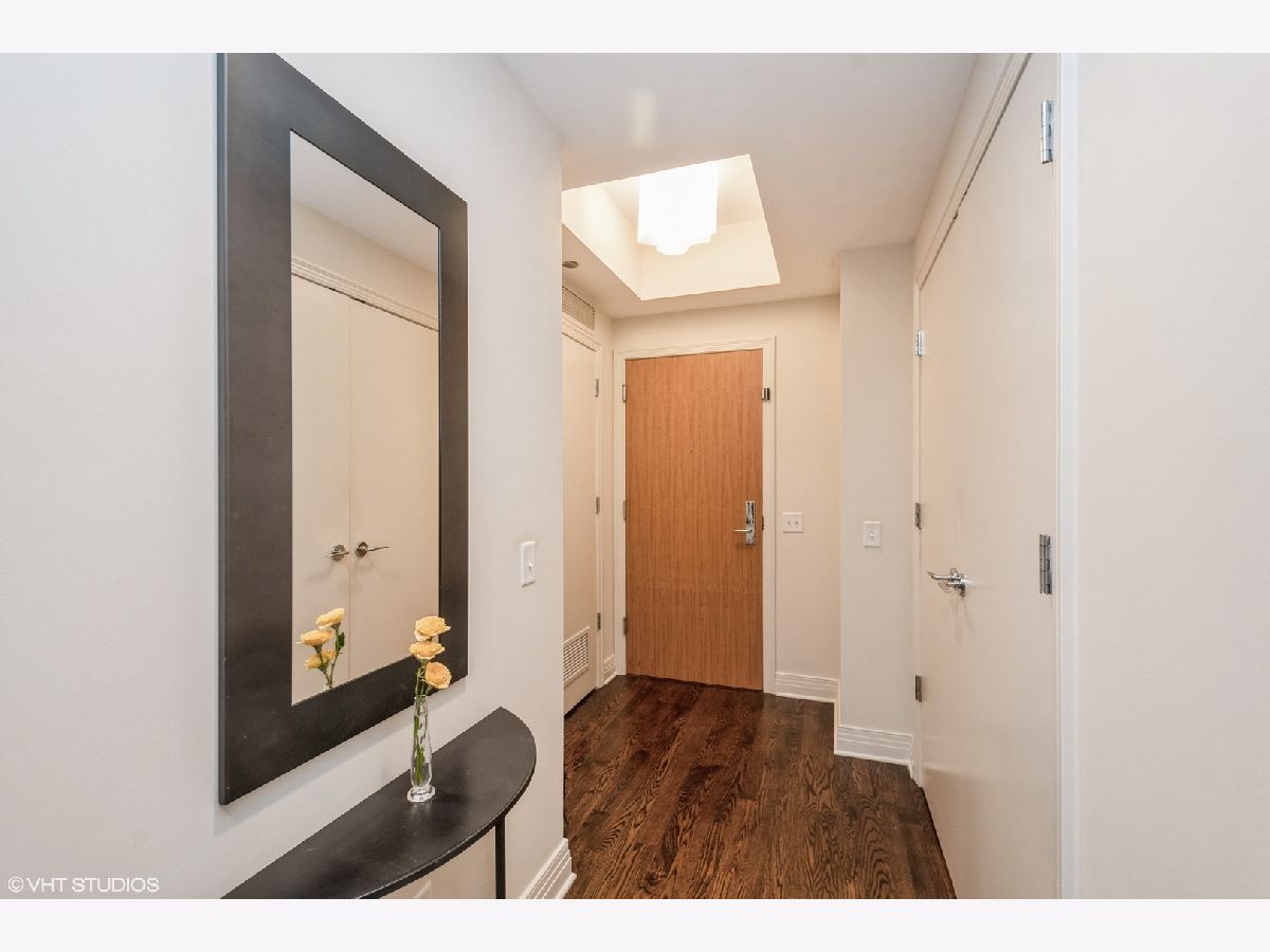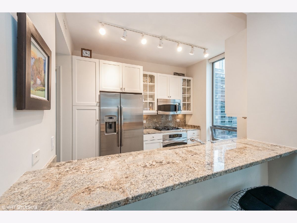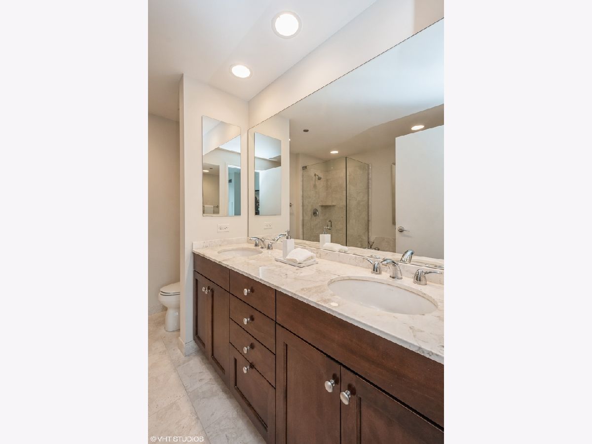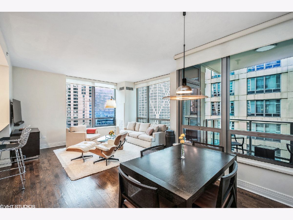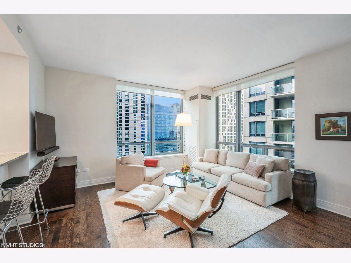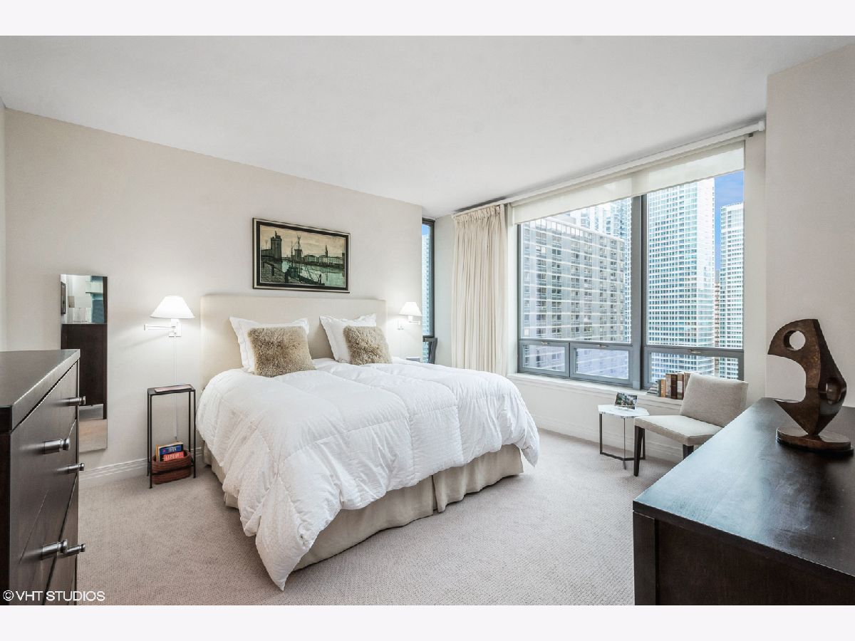 Updates/Improvements: New fridge in January 2020, new designer carpet in master bed in August 2020, kitchen features white cabinets/glass fronts, full height granite backsplash, track lighting, roll out drawers and single bowl sink, marble cleaned and sealed by Prestige Grout & Marble in the master shower, kitchen, and both baths in January 2022, master bath vanity refinished and anti-etch treatment with a 10-year warranty, custom built-in closets throughout, glass shower door in 2nd bath, custom lighting in the foyer and dining room from Lightology, safety locks on both balcony doors, hardwood floors in living/dining/foyer/2nd bedroom with custom dark stain, custom Queen-size Murphy wall bed in 2nd bedroom. Dramatic city views abound in this highly upgraded split 2 bedroom, 2 bath northwest corner condo in perfect move-in condition! You are greeted with elegance starting with the custom dark stained hardwood flooring extending from the foyer into the hallway and open living/dining area, along with a custom-built coat closet, and even extra storage above the side-by-side washer/dryer. Spectacular views of the lake are enjoyed from the balcony, which is accessible from both the living room and the second bedroom/study, west views of the city are seen throughout, and south and west views of the city lights from the master bedroom to end your day. The west facing kitchen has a window for fresh air and boasts full granite backsplash and countertops, single bowl sink, stainless-steel appliances and newer refrigerator, a breakfast bar which opens to the living/dining area, along with refreshing white tall cabinetry with glass fronts doors and custom pull-out drawers. Retreat to the spacious master suite offering a custom-built walk-in closet with newer designer carpet and a master bath including dual vanities with marble tops that have been refinished including an anti-etch treatment with a 10-year warranty, walk-in shower with a premium custom shower door, and separate tub with all marble surrounds. 2nd bedroom features a custom-built Queen-size Murphy bed providing the ultimate room versatility as either home office/study or instant guest room. The second bathroom includes all marble surrounds and a custom shower door. Murphy bed can be removed if needed prior to closing. Finishing touches include custom lights in the foyer and dining room from Lightology and custom track lighting in the kitchen.