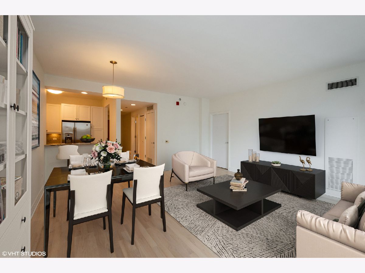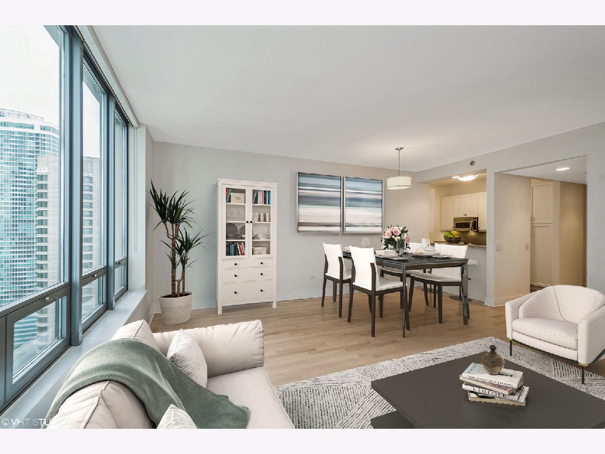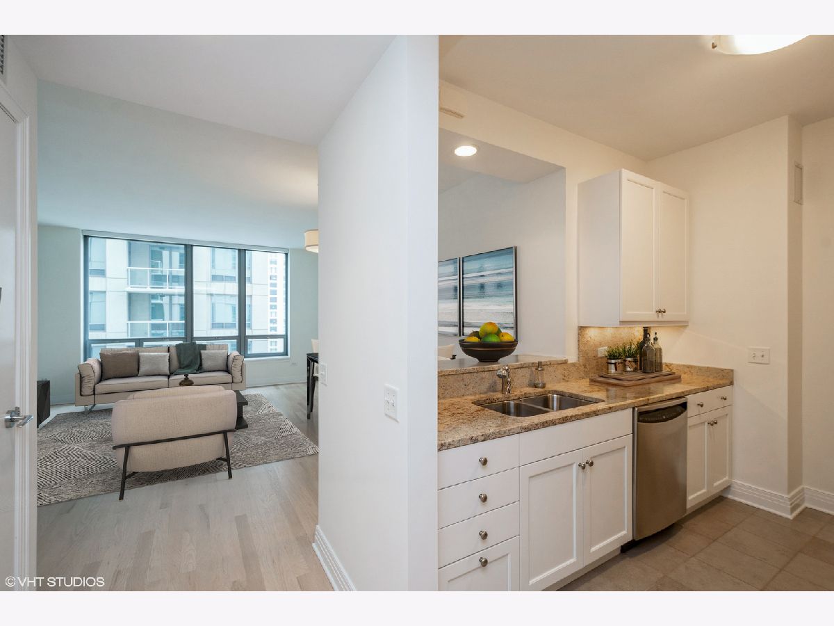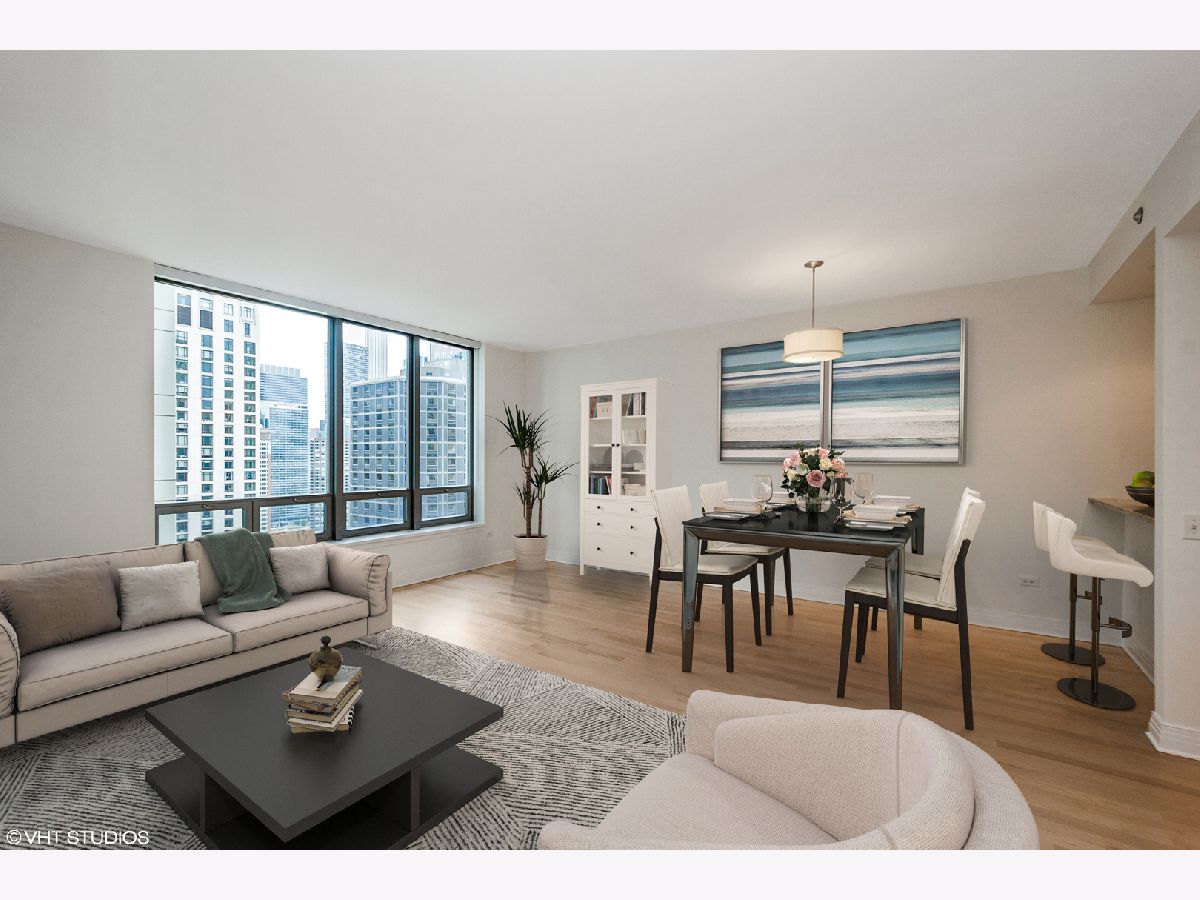 Come home to this updated high floor south facing 1 bedroom 1.5 bath in excellent condition with a large open living/dining room. You are warmly greeted with hardwood floors throughout the living/dining and bedroom along with custom overhead lighting. Escape to the private balcony with spectacular Navy Pier, lake, and south city views! The kitchen features all stainless-steel appliances including a brand-new microwave, granite countertops, white cabinetry, and full-size breakfast bar. The master bedroom also has private access to the inviting balcony along with a spacious walk-in closet, hardwood floors, and south city views. The ensuite master bath includes dual vanity with separate tub, glass enclosed walk-in shower, white cabinetry, and all marble surrounds. The powder room and laundry are conveniently located off the kitchen. Live in lakefront luxury and enjoy all the city has to offer!