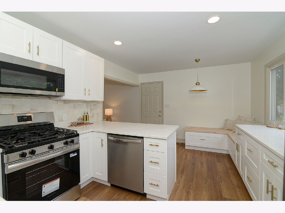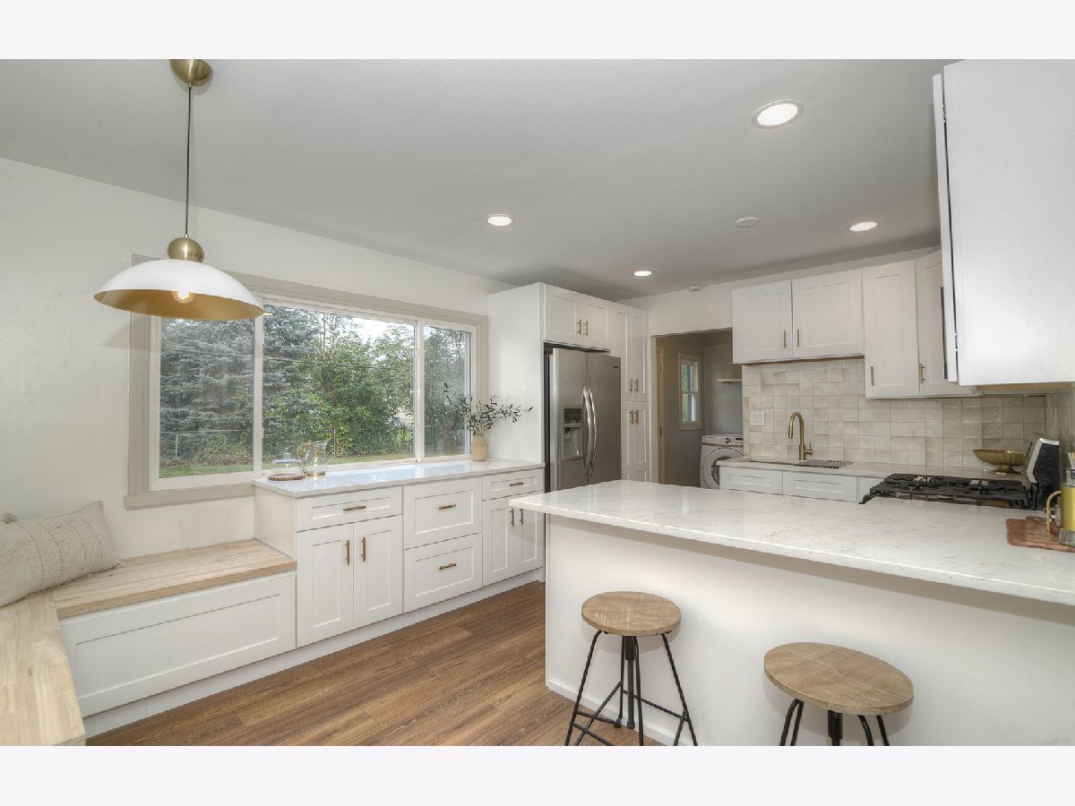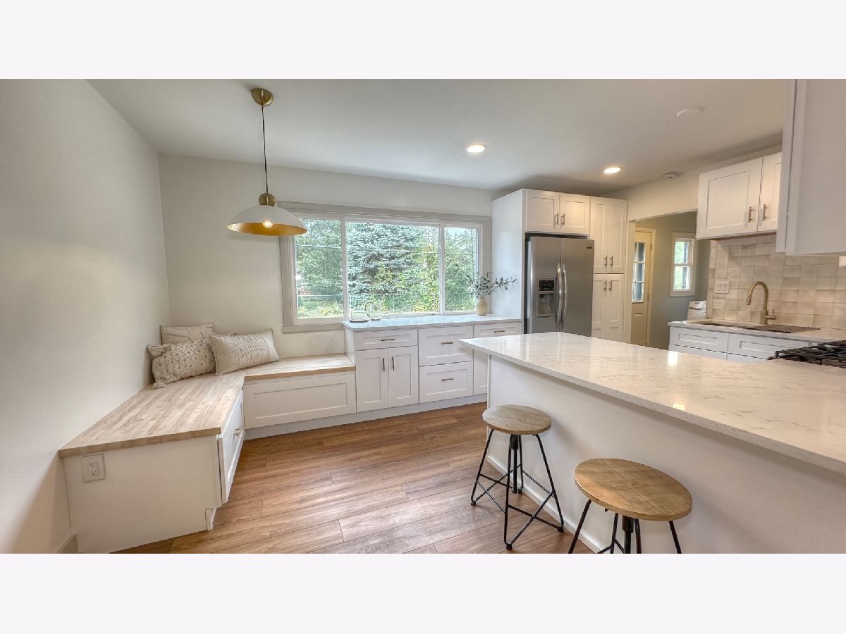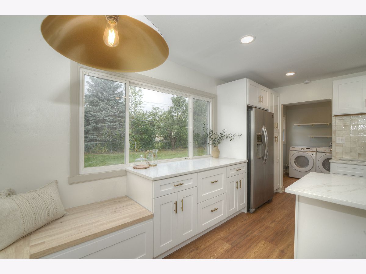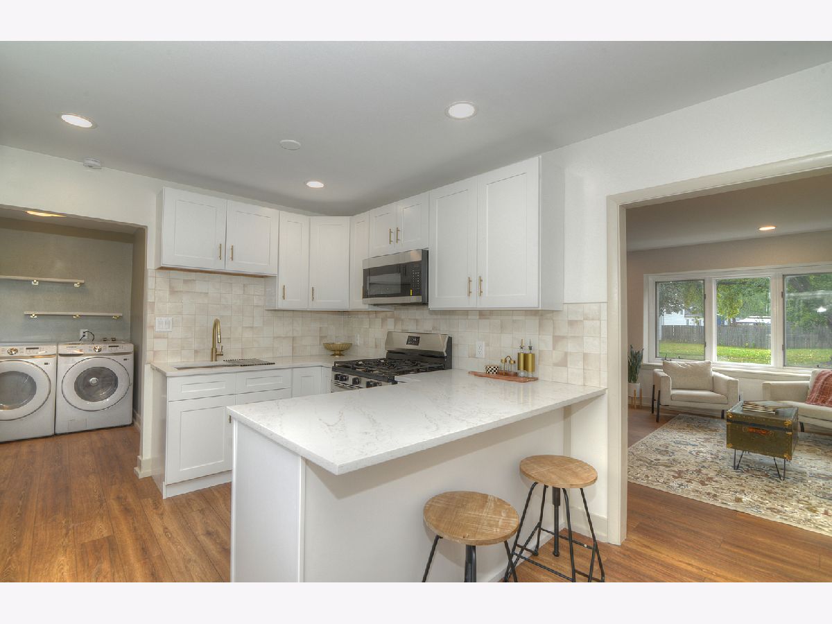Step into this completely remodeled showstopper where modern design meets everyday comfort! This 3-bed, 1-bath ranch has been professionally designed from top to bottom - featuring luxury vinyl plank flooring, stunning quartz countertops, dreamy backsplash, and a custom built-in breakfast nook with butcher-block seating and drawer storage. The kitchen is a dream with brand-new stainless-steel appliances including range, microwave, dishwasher, and garbage disposal - plus endless cabinet space for storage. Just off the kitchen, you'll find the laundry room is made stylish and convenient with Samsung front-load washer and dryer topped with double quartz folding shelves. The stunning bathroom features penny tile flooring and custom wall tile and new vanity, while the primary bedroom highlights a designer accent wall that adds personality and charm. Major updates include a new roof (OCT 2025), furnace, A/C, and water heater (2024) for total peace of mind. Outside, enjoy brand-new concrete driveway, walkways, and a large patio-perfect for entertaining. The oversized one-car garage has new drywall and a pristine epoxy floor, creating a clean, functional space. Laundry is made stylish and convenient with Samsung front-load washer and dryer topped with a quartz folding shelf. Located in the highly desired Coventry neighborhood, near parks, schools, and downtown Crystal Lake, this turnkey, move-in ready home stands out with its designer finishes and timeless appeal. No gray and white here-this one is full of warmth, style, and personality! You'll be the talk of the neighborhood at 600 Sussex Lane!