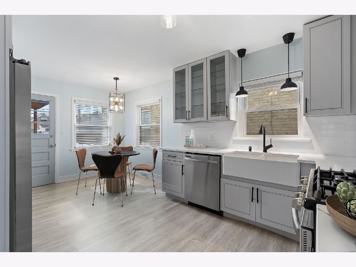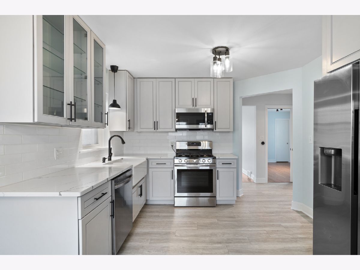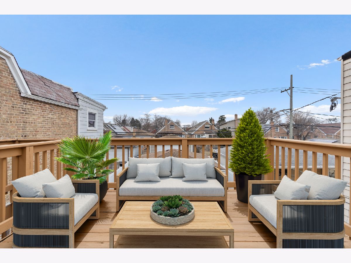 Beautifully updated 5-bedroom, 3-bath home in the popular Jefferson Park neighborhood. Gleaming hardwood floors and large windows welcome you into the main living area with warmth and natural sunlight. The kitchen is a chef's dream, featuring crisp grey cabinetry, quartz countertops, classic subway tile backsplash, stylish light fixtures, stainless steel appliances, and a charming farmhouse sink, plus enough space for an eat-in dining area. Enjoy seamless indoor-outdoor living as the kitchen opens out to a stunning multi-level deck, the perfect setting for entertaining guests or relaxing in the evenings. Two bedrooms conveniently located on the main level, adjacent to a full bath. In fact, every level features a full bathroom, all boasting high-end Kohler hardware and fixtures. Upstairs, you'll find two more spacious bedrooms and a spa-like full bathroom with walk-in shower, as well as walk-out access from the back bedroom to a private deck. The lower level offers new flooring throughout, a massive laundry room with washer/dryer, and an open recreation/living area-plus a separate room perfect as a 5th bedroom, home office, or extra storage. Outside, an enclosed large backyard with privacy fence awaits, complete with a two-car garage and newer deck. Easy access to I90-94 expressway, Metra stops and O'Hare, plus nearby parks and restaurants, this exceptional home combines comfort, style, and convenience in an unbeatable location. Don't miss your chance to make it yours!
