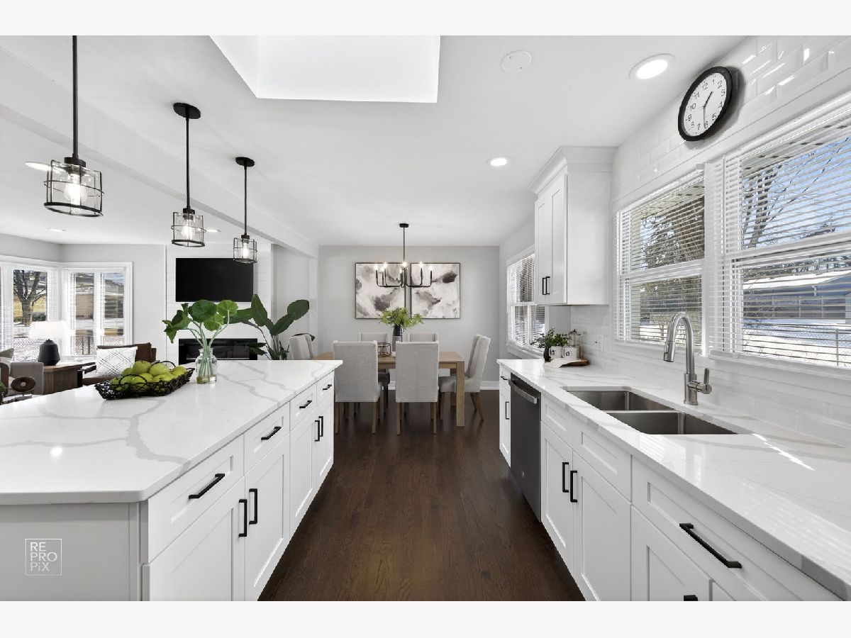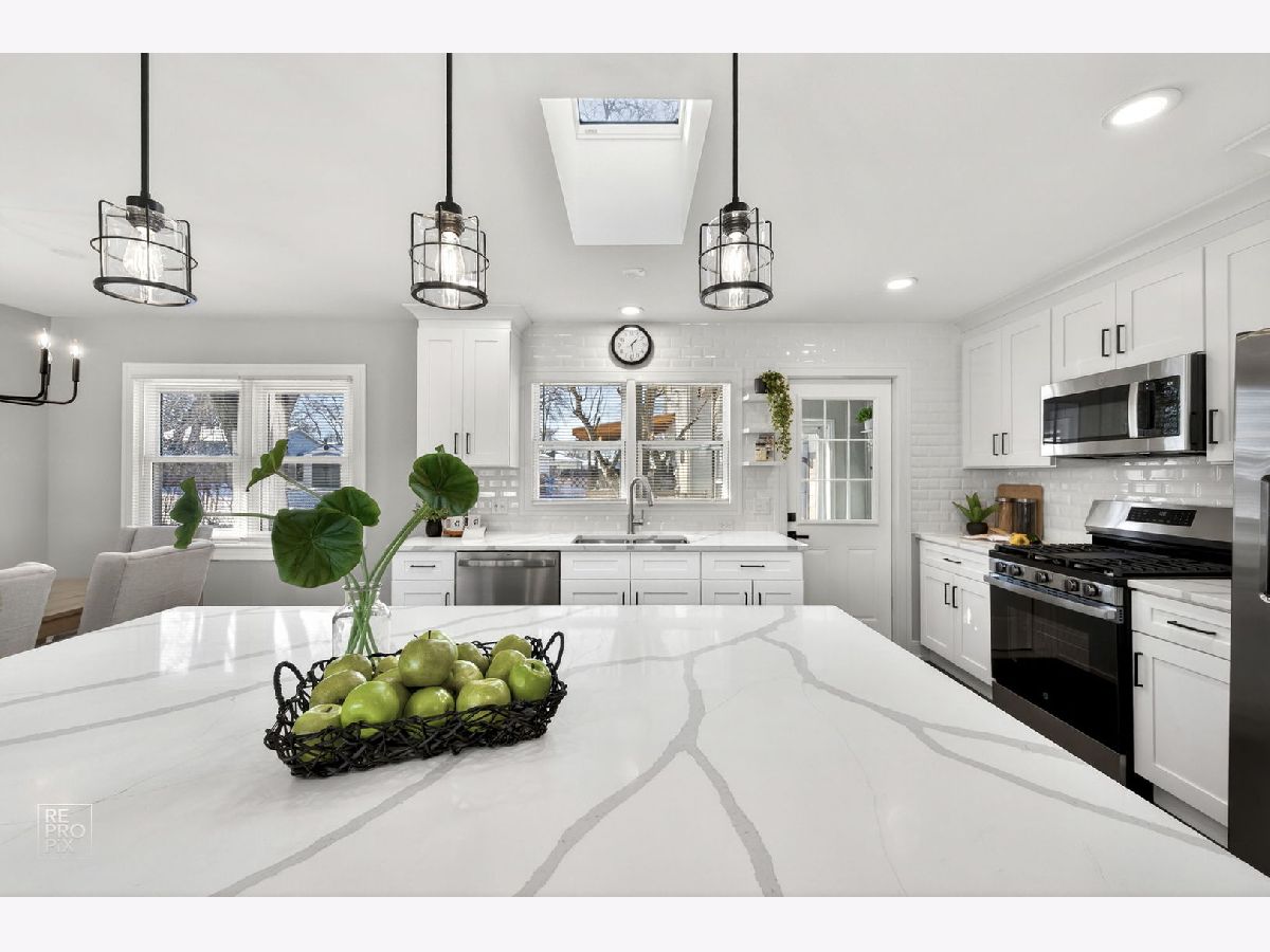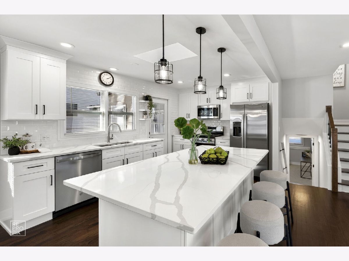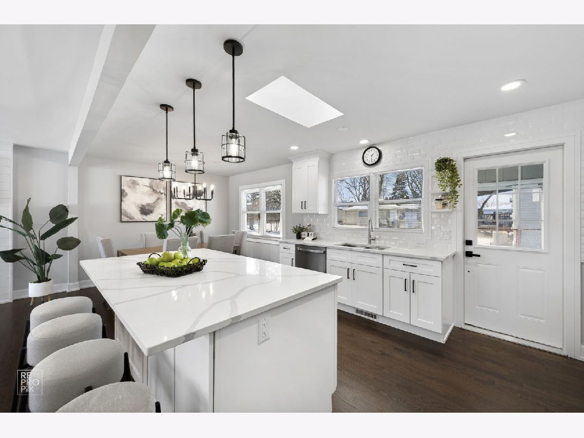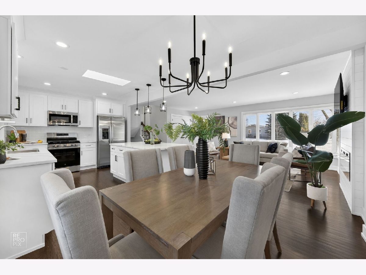 Rarely available absolutely stunning and fully remodeled split-level home with 3 bedrooms and 2 updated bathrooms, located in a prime Mount Prospect subdivision! Step into a bright and open floor plan filled with natural light, featuring a spacious living room with recessed lighting and large windows that flow seamlessly into the dining area and modern kitchen. The kitchen boasts a large island, quartz countertops, brand new stainless steel appliances, and an island cabinet for extra storage. Upstairs you'll find three generous bedrooms and a beautifully updated full bath. The lower level offers a cozy family room with an updated bathroom, and a spacious laundry/utility area. Enjoy outdoor living in the fully fenced backyard offering privacy. Additional highlights include brand new roof, LED lights, hardwood floors throughout the home, a 2-car garage, and a separate driveway on the other side of the house provides two additional parking spaces. TV and fireplace stay with the house. Award winning school districts and John Hersey High School. Near shopping, restaurants and entertainment. Awesome LOCATION! Motivated seller.