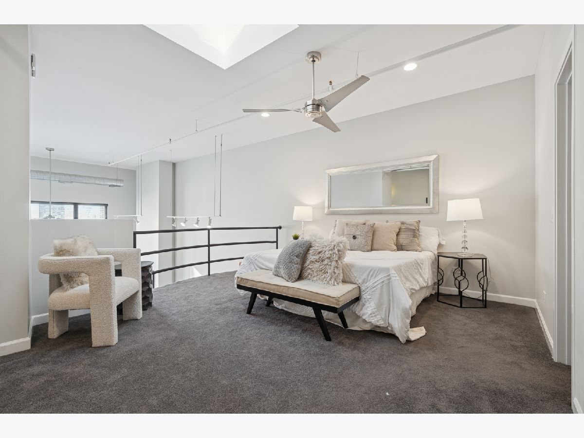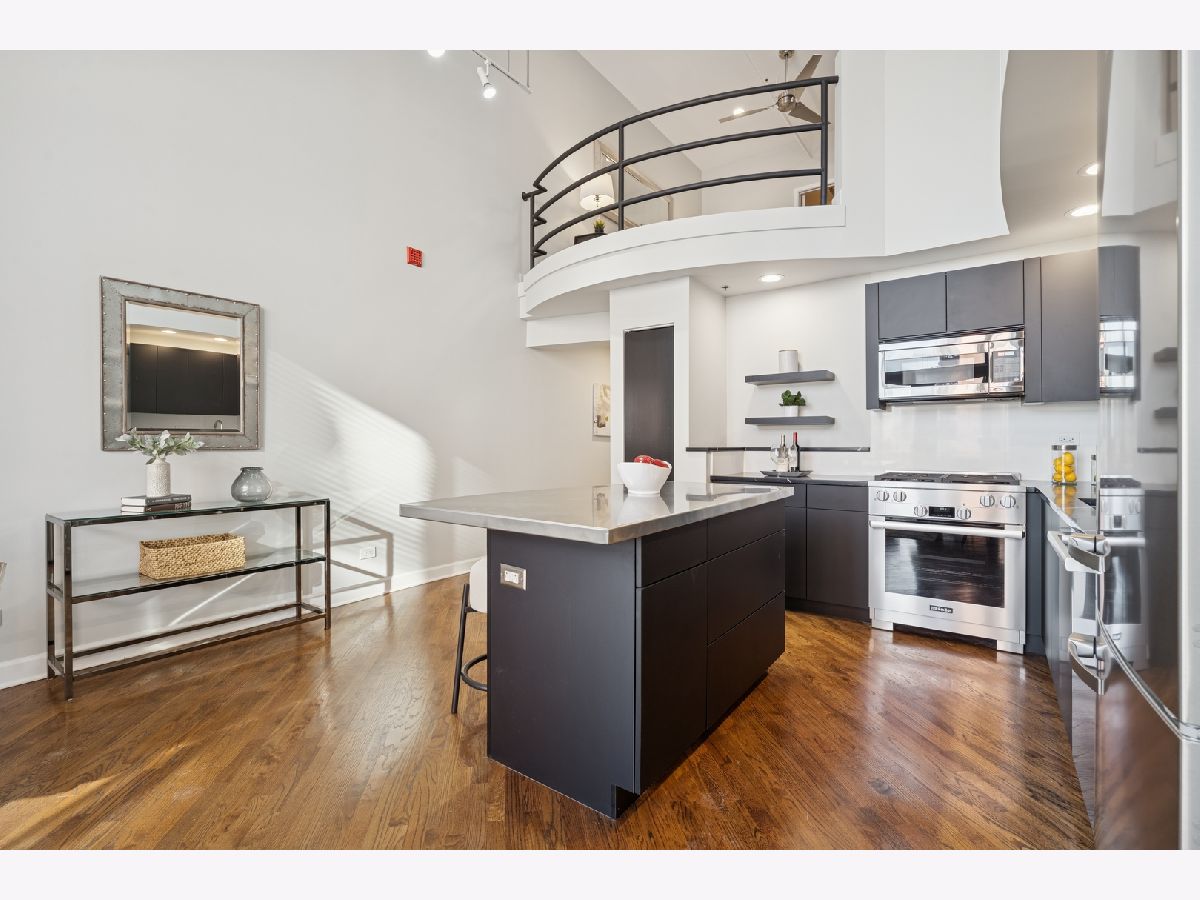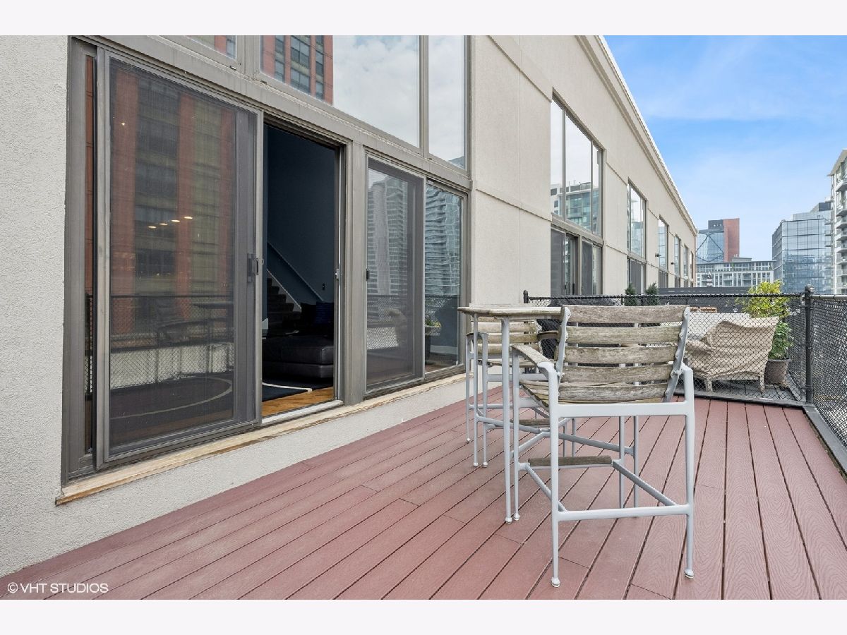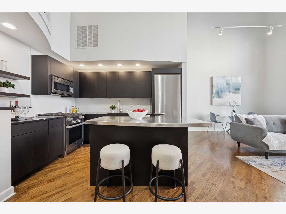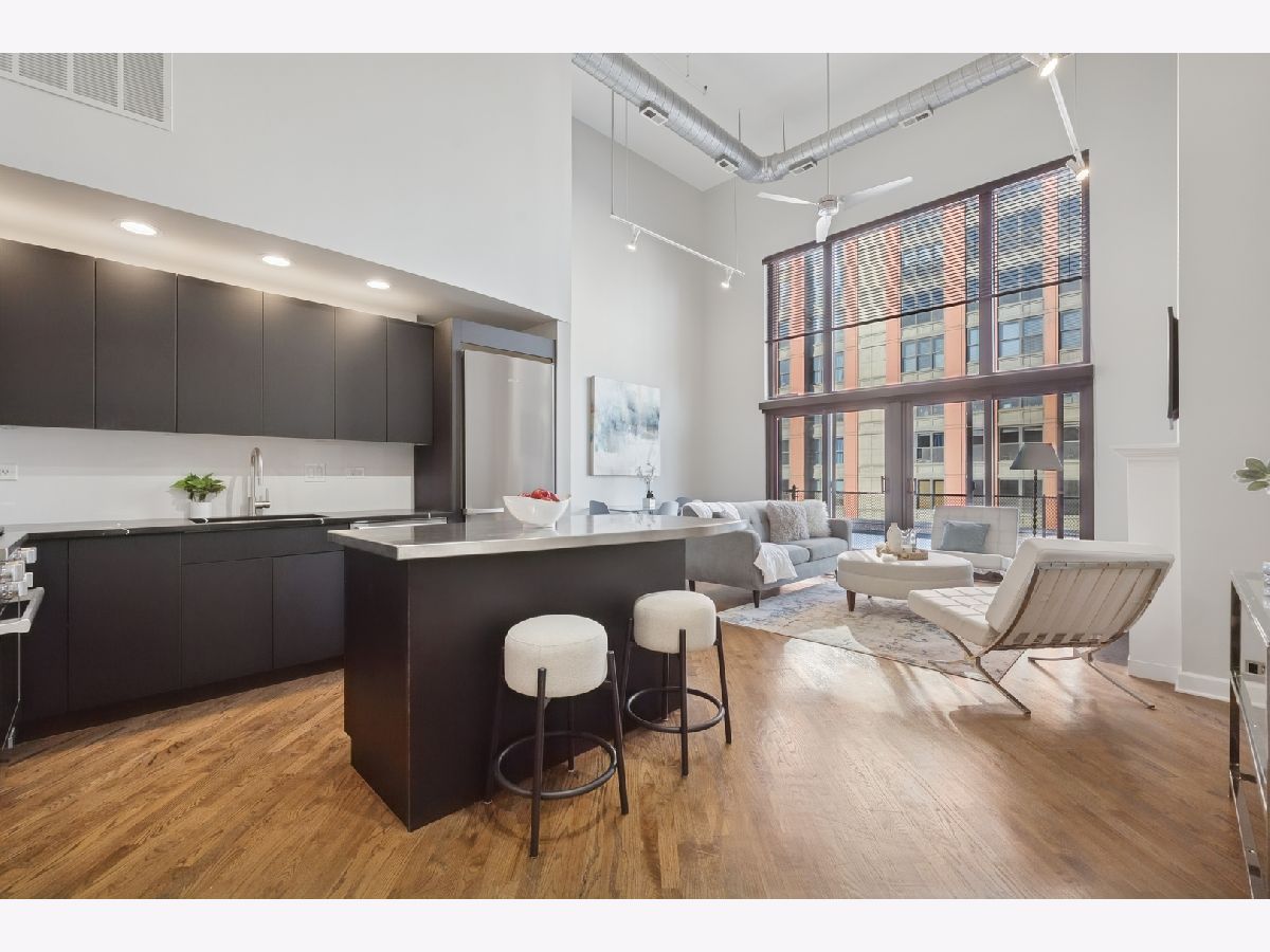 Penthouse-level duplex in the heart of Fulton Market with soaring ceilings, dramatic floor-to-ceiling windows, and skyline views from your expansive private terrace. The modern, open-concept kitchen features matte black cabinetry, a stainless steel island, premium appliances, and sleek stone countertops-ideal for entertaining or everyday living. The spacious living area includes hardwood flooring, a gas fireplace, and seamless access to the terrace for indoor-outdoor flow. Upstairs, a versatile loft with plush carpeting, skylight, and ceiling fan overlooks the main living space-perfect as a guest suite, home office, or den. The home offers two full bathrooms, including a spa-inspired upper-level bath with marble tile, jetted tub, and dual vanities. Additional highlights include a large custom walk-in closet, in-unit laundry, and excellent storage throughout. This property epitomizes a sophisticated urban lifestyle, steps away from the award-winning restaurant Row, the river walk, the Loop, and the renowned East Bank Club. Take advantage of this unparalleled opportunity to make your home in one of Chicago's most sought-after neighborhoods. A deeded garage parking is available for an additional $30K.