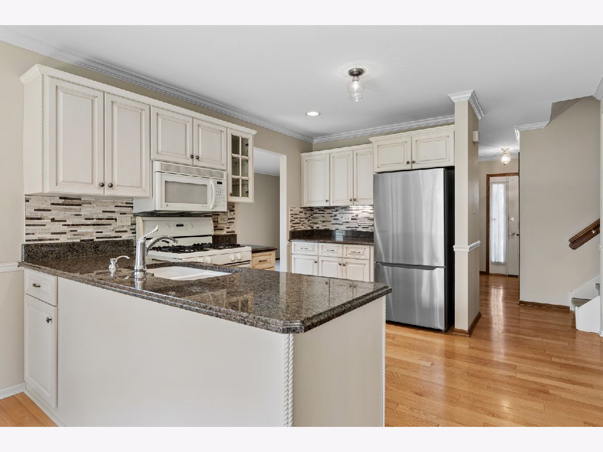 Beautifully maintained split-level home in a prime location close to shopping and restaurants! This inviting home offers 4 bedrooms and 3 full baths, along with an oversized 2-car garage. The sun-filled formal living and dining rooms feature neutral decor and large windows. Upstairs you'll find three bedrooms, including a spacious primary suite with dual closets and a private full bath. The lower level features a generous family room with a cozy brick fireplace, plus a bedroom with an adjacent full bath-perfect for guests or related living. There is also a large utility/laundry room. A sub-basement provides abundant storage and flexible living space. The kitchen offers off-white cabinetry, granite countertops, a charming bay window, and access to the patio. Enjoy the beautiful backyard with mature trees and plenty of room to relax or play. This is a home you will want to see!