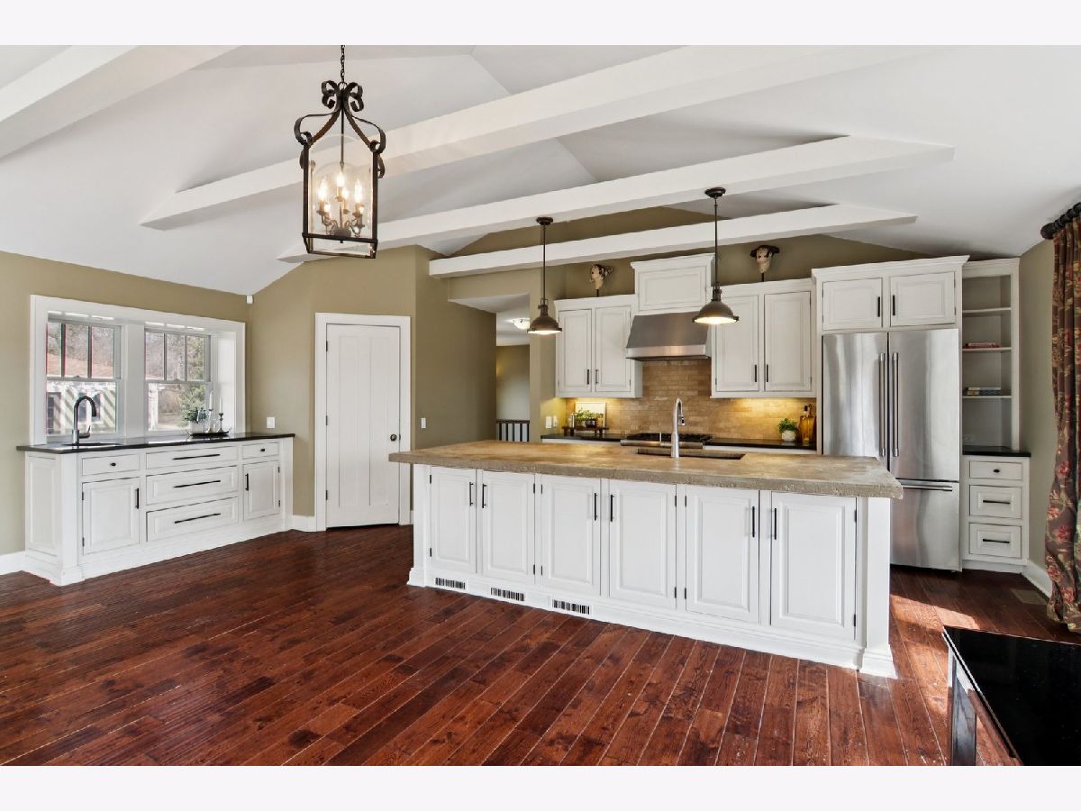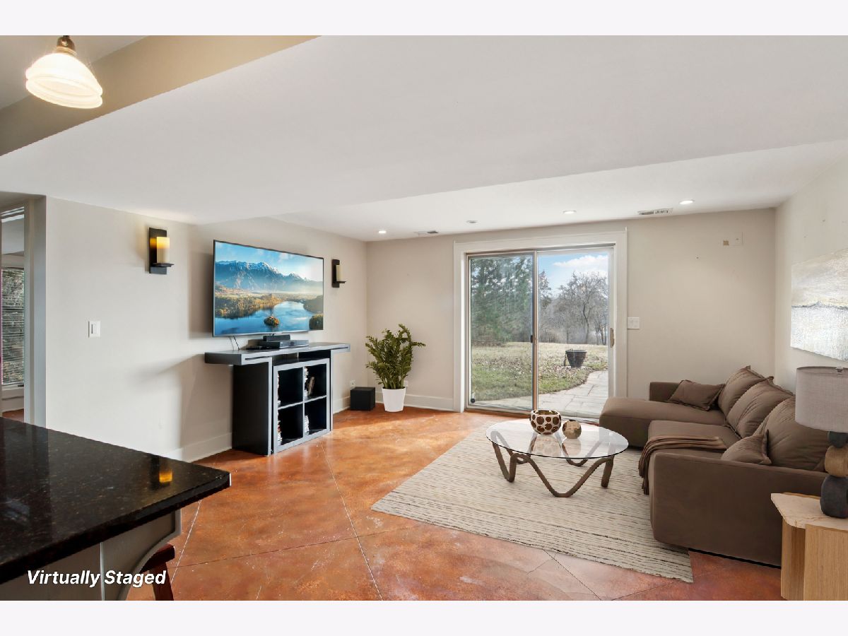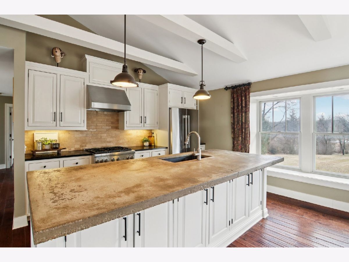 A rare retreat offering privacy, beauty, and thoughtful design. Set on 3.1 acres backing to protected wildlife conservation land, ensuring permanent open views and unmatched tranquility. This breathtakingly renovated 3-bedroom, 2.1-bath ranch with walkout lower level is truly one of a kind. The main level features hand-scraped dark hardwood floors, dramatic vaulted and beamed ceilings, and expansive floor-to-ceiling windows that flood the home with natural light. The stunning chef's kitchen is designed for both everyday living and entertaining, offering high-end stainless steel appliances, concrete and granite countertops, and a striking custom island with a farmhouse sink and built-in appliances. Seamless indoor-outdoor living is achieved with access from both the kitchen and living room to an expansive deck overlooking dual paver patios, a hot tub, and a built-in fire pit. This area is ideal for relaxing or hosting gatherings. The meticulously planned grounds feature perennial gardens, raised garden boxes, paver walkways, and mature fruit trees, creating a peaceful, private sanctuary. The primary suite offers a spa-inspired bath with steam shower, double vanity, and custom concrete countertops. The walkout lower level is fully equipped with a second custom kitchen, a family room with exterior access to an additional patio, two additional bedrooms, and a full bath. This makes it perfectly suited for multi-generational living, guests, or extended stays while still maintaining privacy. The home has been well maintained with recent owner refreshes and improvements throughout. Horses and chickens are allowed on this property. All of this is just minutes to shopping, dining, and the train, delivering a rare combination of privacy, functionality, and convenience.