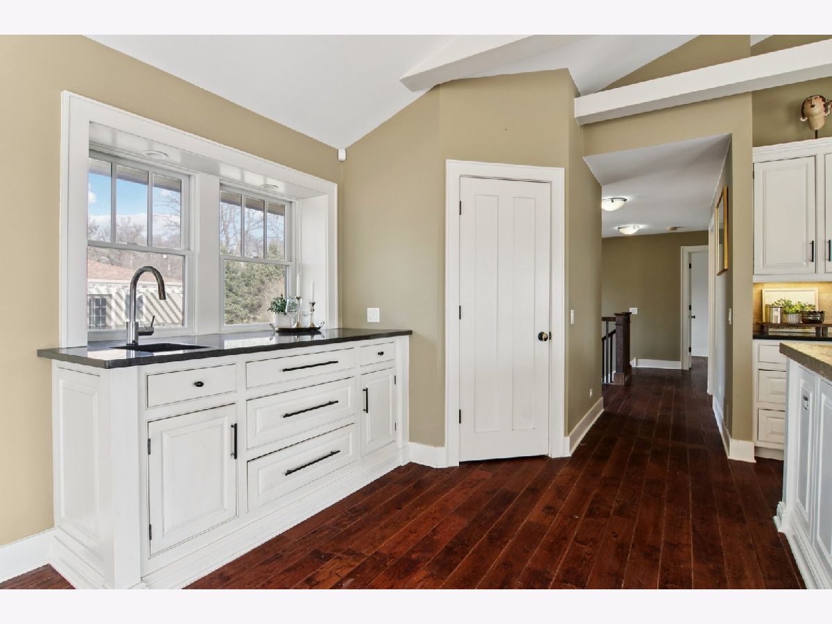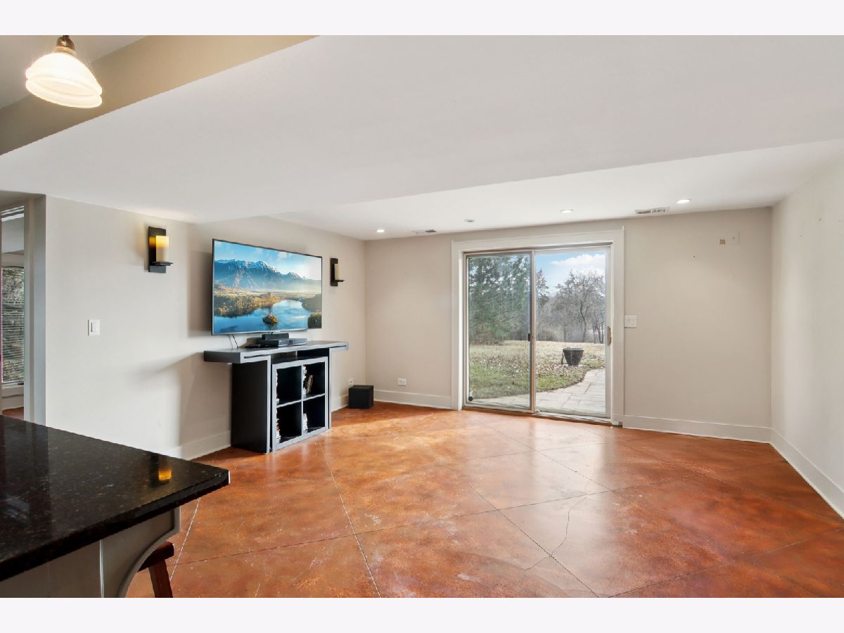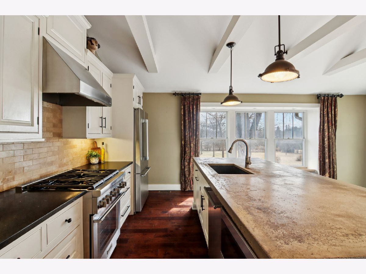 A rare retreat offering privacy, beauty, and thoughtful design. Set on 3.1 acres backing to protected wildlife conservation land, ensuring permanent open views and unmatched tranquility. This breathtakingly renovated 3-bedroom, 2.1-bath ranch with walkout lower level is truly one of a kind. The main level features hand-scraped dark hardwood floors, dramatic vaulted and beamed ceilings, and expansive floor-to-ceiling windows that flood the home with natural light. The stunning chef's kitchen is designed for both everyday living and entertaining, offering high-end stainless steel appliances, concrete and granite countertops, and a striking custom island with a farmhouse sink and built-in appliances. Seamless indoor-outdoor living is achieved with access from both the kitchen and living room to an expansive deck overlooking dual paver patios, a hot tub, and a built-in fire pit. This area is ideal for relaxing or hosting gatherings. The meticulously planned grounds feature perennial gardens, raised garden boxes, paver walkways, and mature fruit trees, creating a peaceful, private sanctuary. The primary suite offers a spa-inspired bath with steam shower, double vanity, and custom concrete countertops. The walkout lower level is fully equipped with a second custom kitchen, a family room with exterior access to an additional patio, two additional bedrooms, and a full bath. This makes it perfectly suited for multi-generational living, guests, or extended stays while still maintaining privacy. The home has been well maintained with recent owner refreshes and improvements throughout. Horses and chickens are allowed on this property. All of this is just minutes to shopping, dining, and the train, delivering a rare combination of privacy, functionality, and convenience.