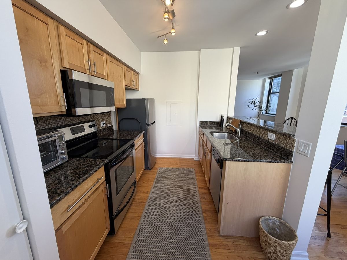 This extra-large 950 sq ft 1 Bedroom/1 Bathroom Printer's Row condo is sure to please. Surrounded by windows and flooded with natural light, this bright, spacious northwest corner unit is sure to please, boasting a rehabbed kitchen with maple cabinets, granite countertops, and stainless steel appliances. Solid oak hardwood floors throughout, a separate home office with a built-in desk and bookshelves, tons of closet space, and a remodeled bathroom. The condo association features a huge storage locker, a 24-hour exercise room, bicycle storage, onsite management, and security. Just steps to all CTA buses, the Red and Blue line trains, Lake Michigan, Grant Park, and all of the shopping, dining, and nightlife that downtown Chicago has to offer! Rental parking available in the attached garage.
