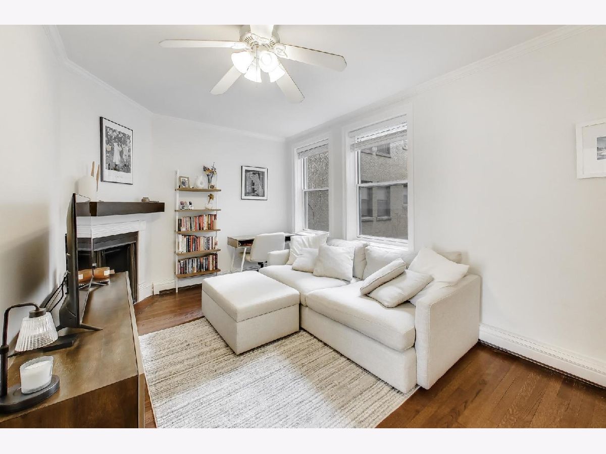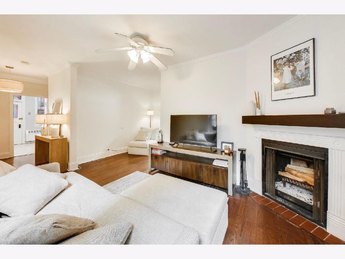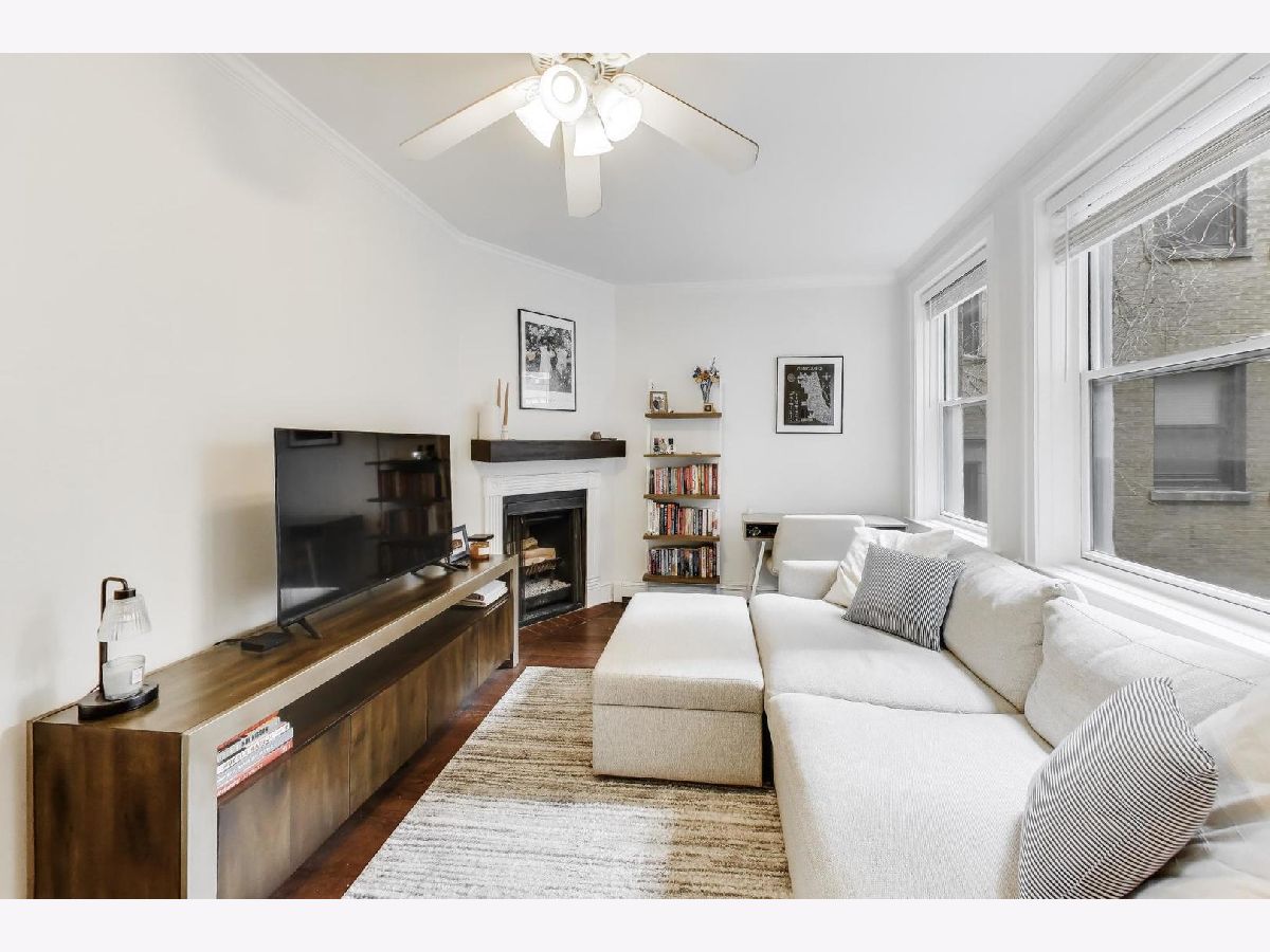 Welcome home to this beautiful 2 bed, 1 bath condo in the heart of East Lakeview. The sunny living area is anchored by the wood-burning fireplace and offers ample room for seating, along with a versatile nook that's perfect for a work-from-home setup, cozy reading space or dining table. South-facing windows overlook the building's landscaped courtyard, filling the room with natural light throughout the day. The large kitchen has been thoughtfully updated with white cabinetry, stainless steel appliances, and direct access to your outdoor space perfect for grilling. Both bedrooms are generously sized with excellent closet space. The bathroom has been recently updated with white subway tile and a new vanity + medicine cabinet. Additional highlights include hardwood floors throughout, abundant storage, and in-unit washer and dryer. Monthly HOA includes heat, cooking gas, high-speed internet, cable, snow removal and professional landscaping. Ideally located just half a block from the lakefront underpass, providing immediate access to the Lakefront Trail, and moments from the best dining, shopping, and transit East Lakeview has to offer. Additional storage and bike room included. Garage parking available at nearby building for $200-300/month. Rental cap of 30% is met.