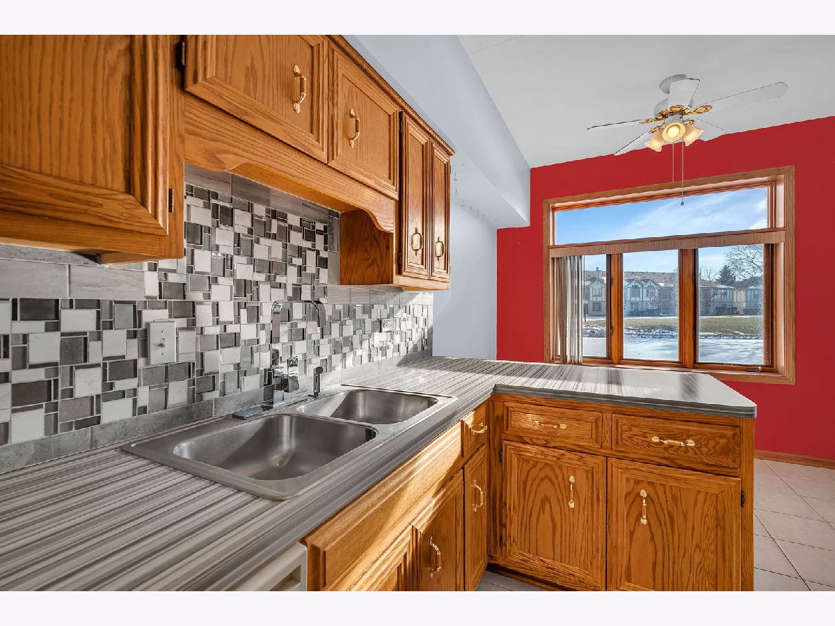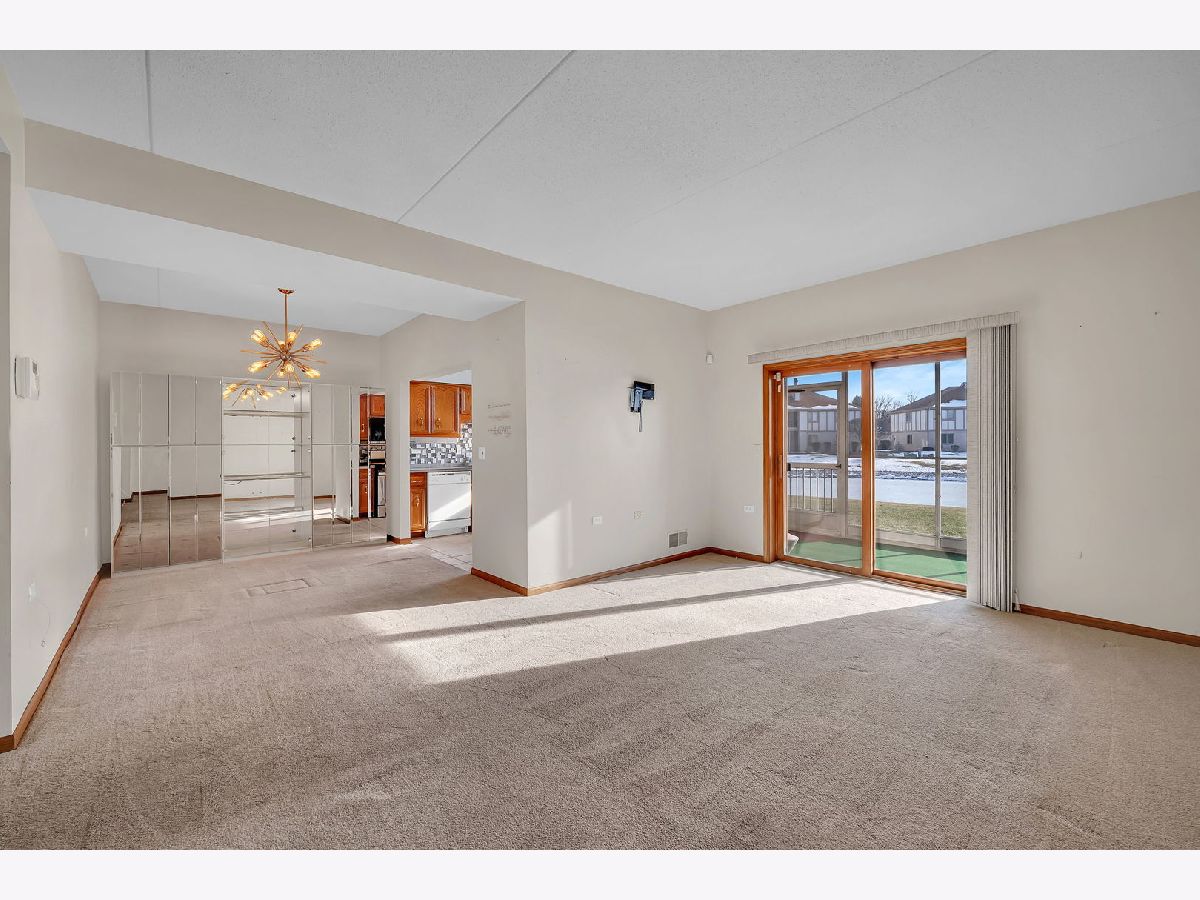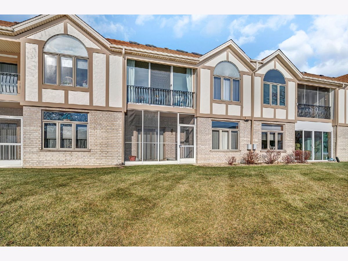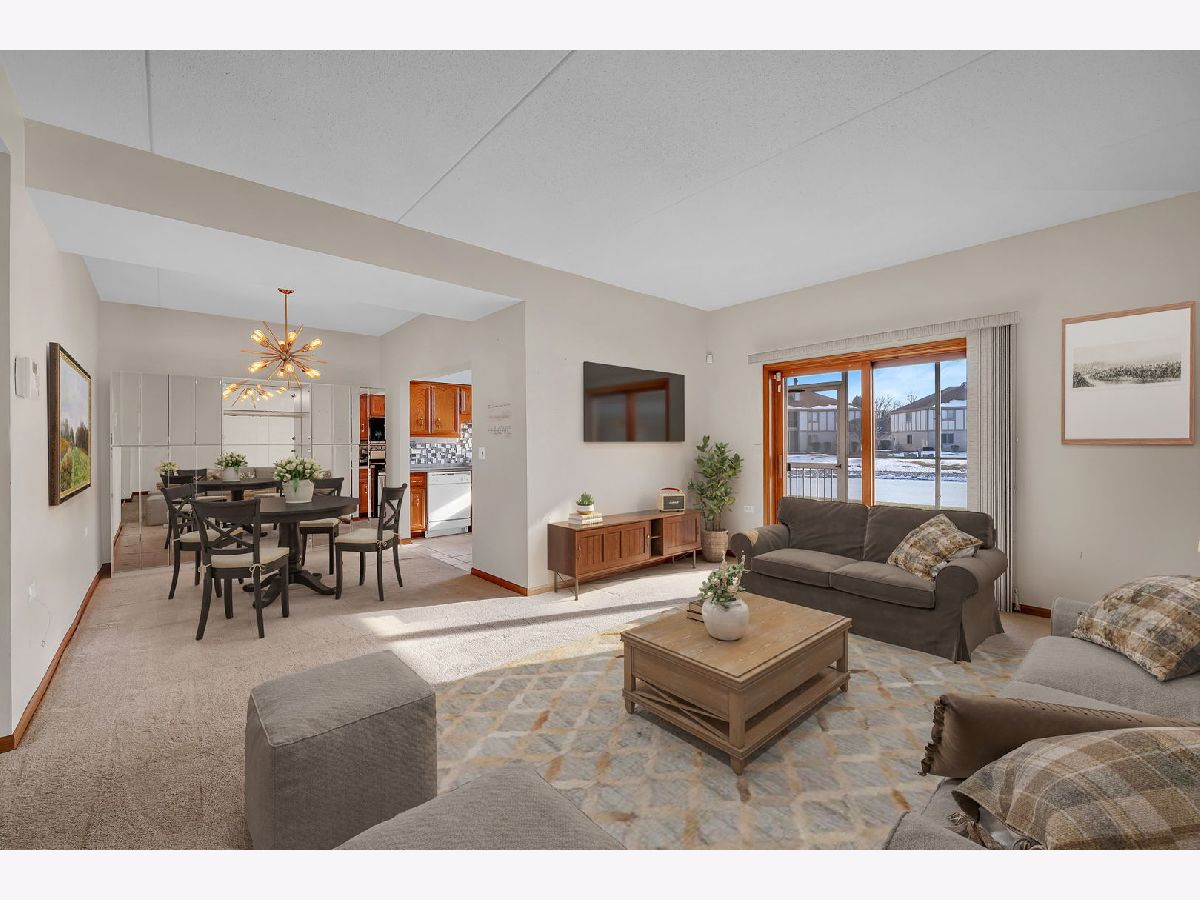Welcome to this well-maintained two-bedroom, two-bath first-floor condo in Tinley Park, set in a quiet and well-kept building with peaceful pond views. This no-stairs unit offers a bright, open living area filled with natural light and sliding doors leading to a screened-in porch-perfect for relaxing and enjoying the serene setting. The spacious kitchen features ample cabinetry, tile flooring, and a cozy breakfast nook, flowing seamlessly into the dining area for comfortable everyday living. The generously sized primary suite includes a walk-in closet and a private bath equipped with a walk-in tub and grab bars for added convenience. A second bedroom and full bath provide flexibility for guests or a home office. Additional highlights include in-unit laundry, an attached one-car garage, and abundant storage throughout. Located in a peaceful 55+ community, this home offers comfort, functionality, and an inviting atmosphere.
