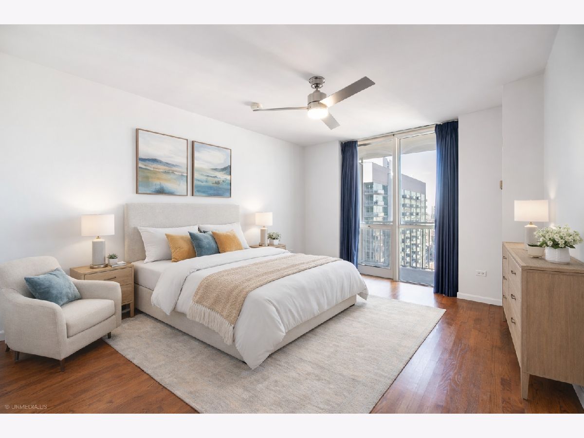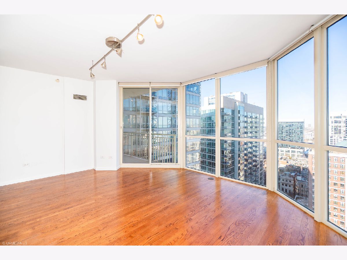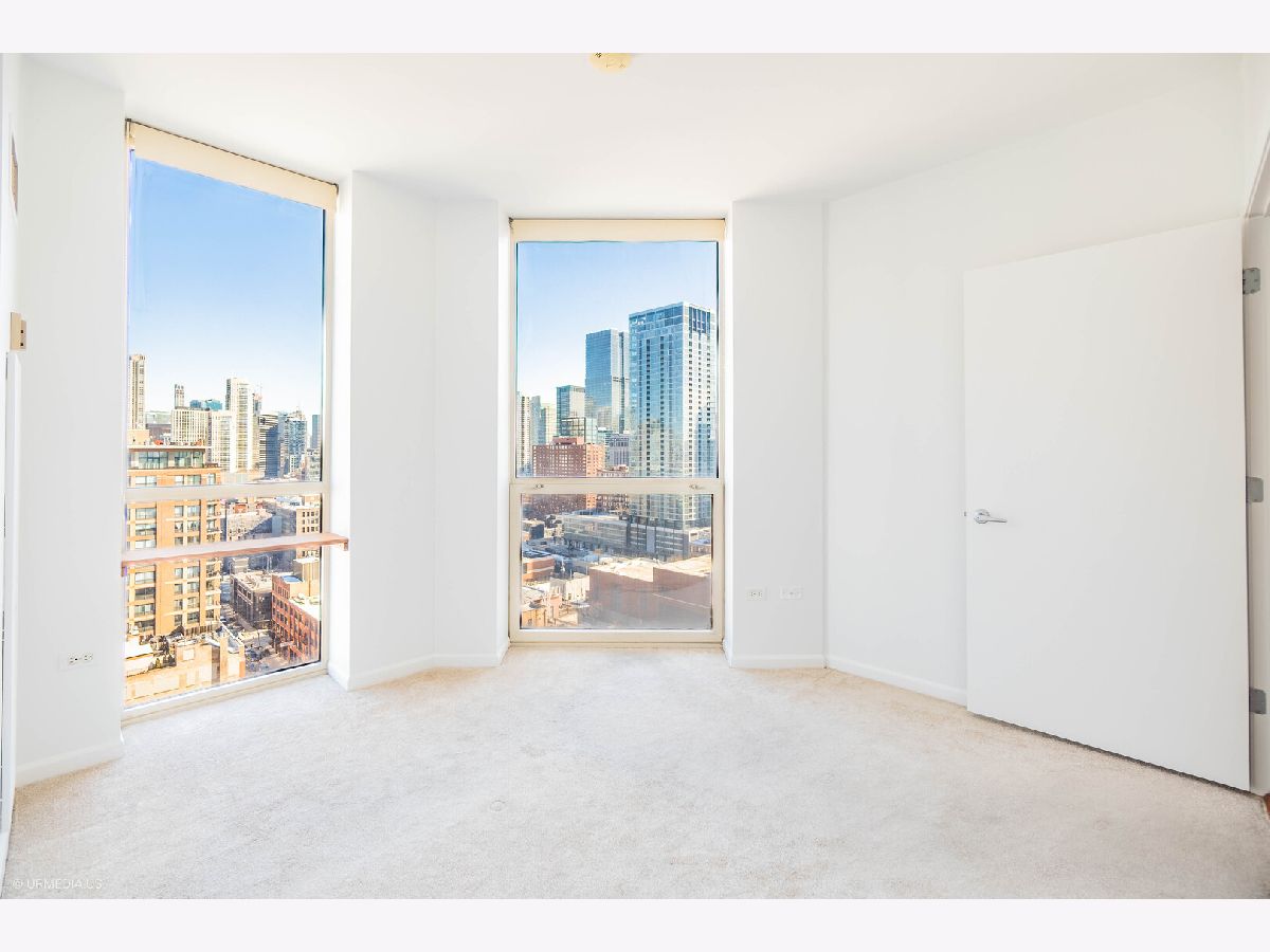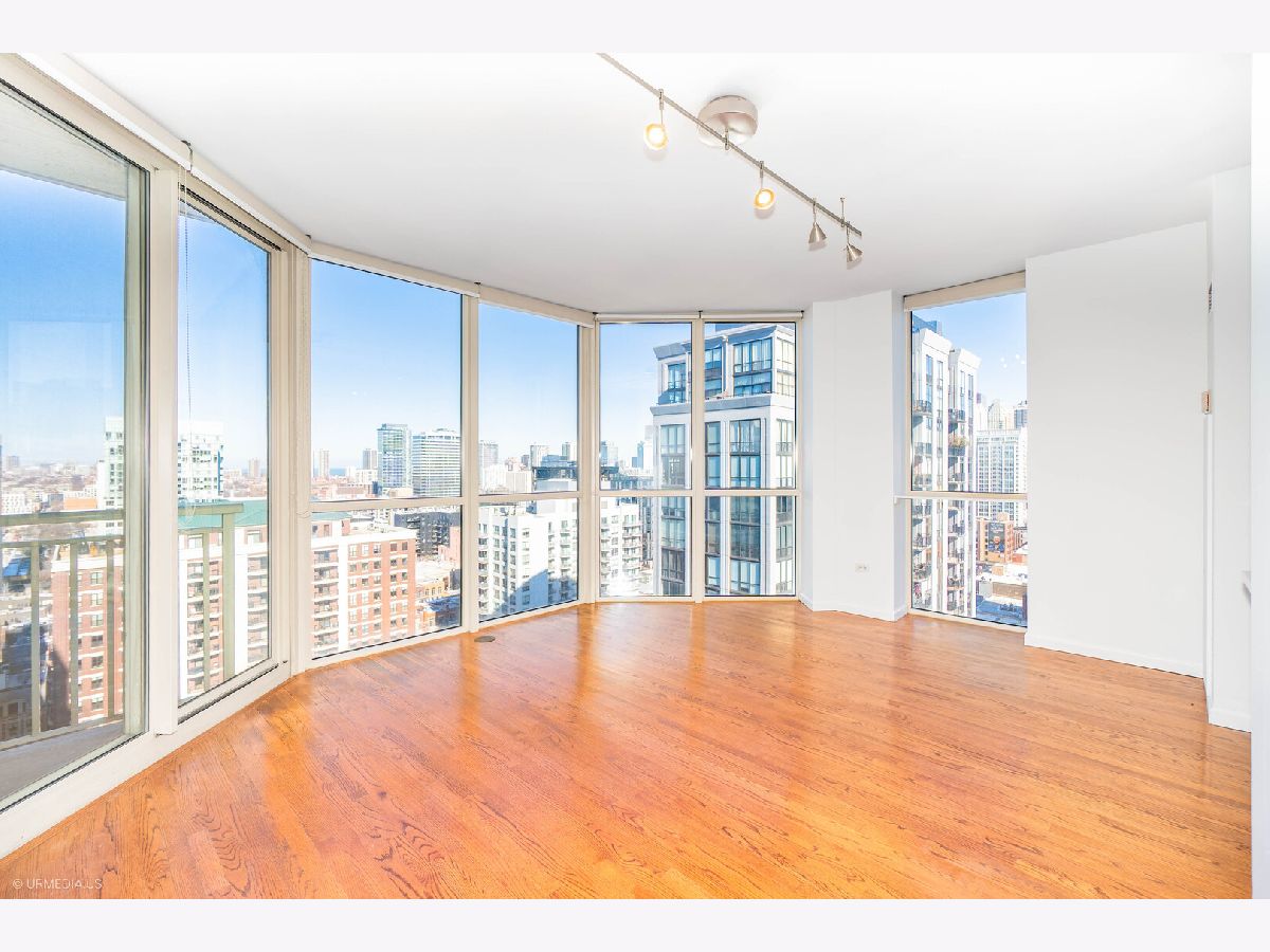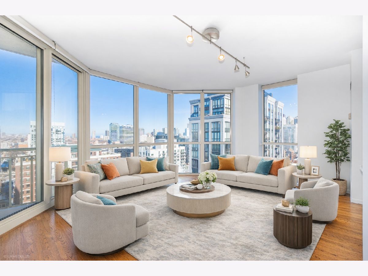 Incredible opportunity to own a sophisticated corner residence in one of River North's most desirable tiers at 645 N Kingsbury. Floor-to-ceiling windows flood the home with natural light and showcase dramatic skyline views. The open layout features hardwood floors throughout, a chef's kitchen with stainless steel appliances and brand new quartz countertops, freshly painted, upgraded light fixtures and a private balcony off the living room, perfect for relaxing or entertaining. The luxurious primary suite offers spa-inspired comfort with double vanities and a serene bath. Full-amenity building includes 24-hour door staff, fitness center, party room, and bike room. Perfectly situated across from Montgomery Ward Park with easy access to the East Bank Club, Chicago's Riverwalk, and many shopping and dining options. Commuters take ease with highway access only 3 blocks away. Deeded parking available for $30,000.