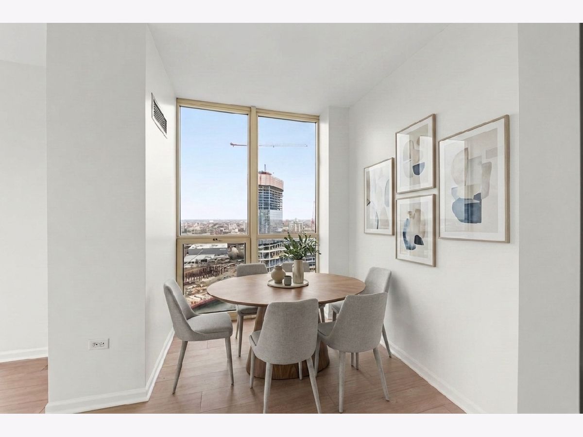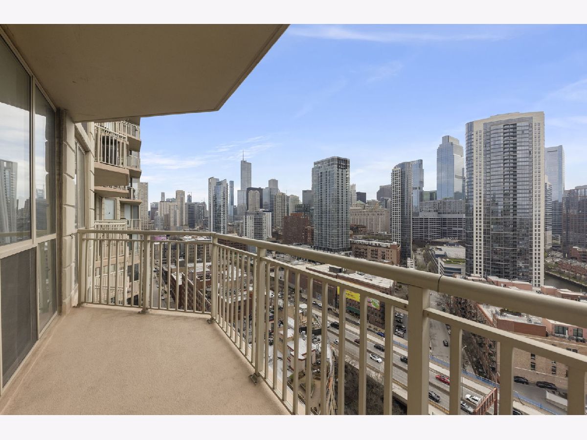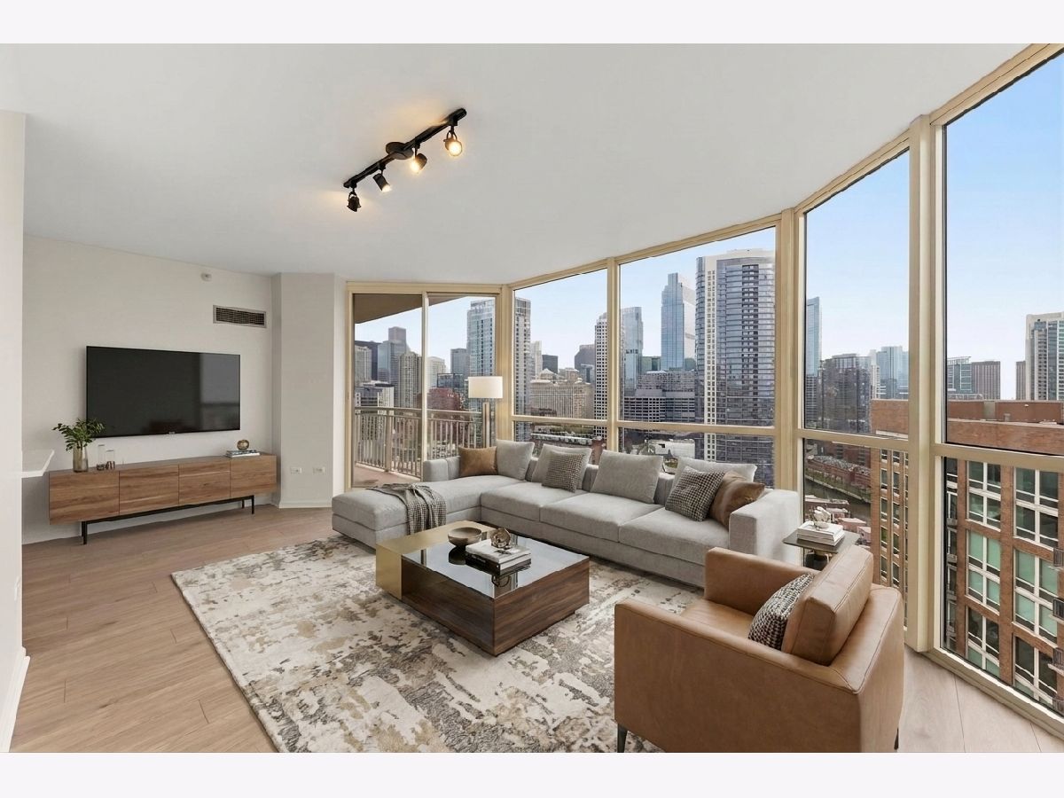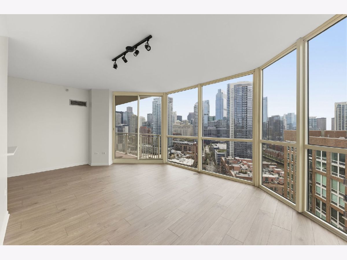 Welcome to this meticulously maintained modern condo in the heart of River North! This beautifully updated 2-bedroom, 2-bathroom unit offers an open-concept design with floor-to-ceiling windows, flooding the space with natural light and fabulous views of the Chicago River. Step out onto your private balcony and take in the iconic city skyline! The unit has been thoughtfully updated throughout, featuring newly installed luxury vinyl plank flooring, new kitchen cabinets, sleek quartz countertops, and stainless steel appliances. Enjoy the convenience of an in-unit washer and dryer. One garage space is included. Residents enjoy full-service amenities including 24-hour door staff, a well-equipped fitness center, a stylish party/meeting room, and storage lockers. Unbeatable location just steps from top restaurants, nightlife, shopping, parks, and the river, with easy access to the Brown Line, Metra, and major expressways. This is city living at its finest, move right in and enjoy everything River North has to offer!