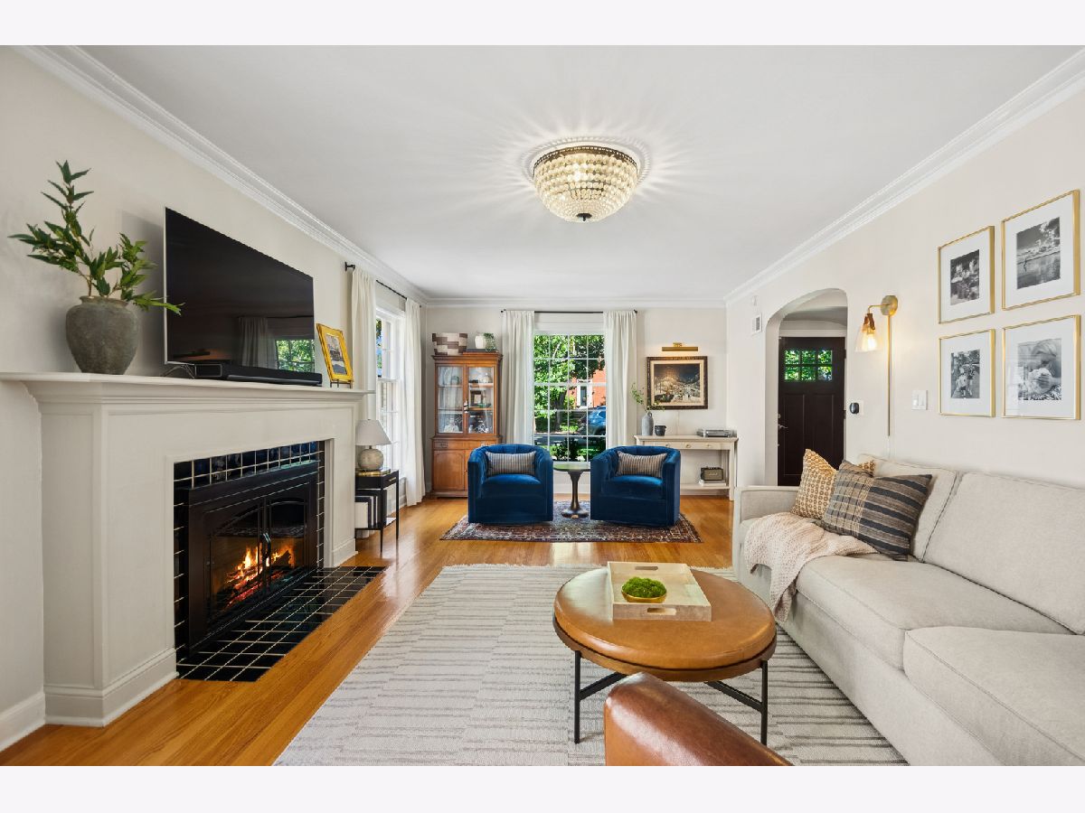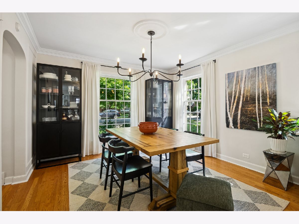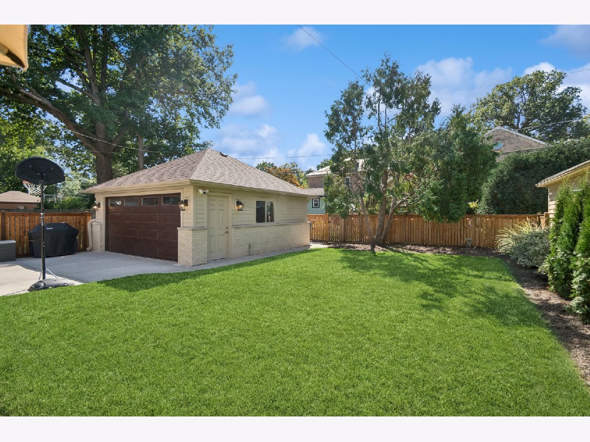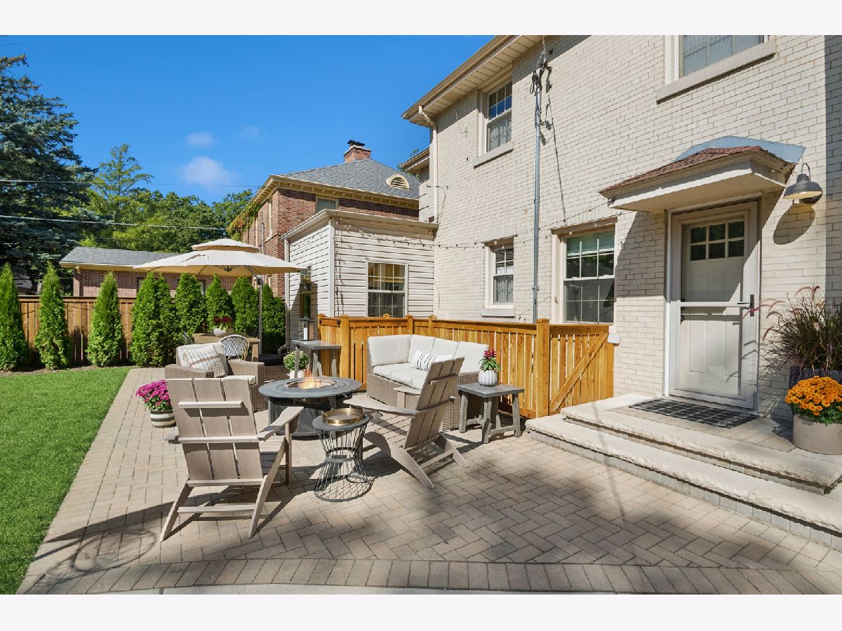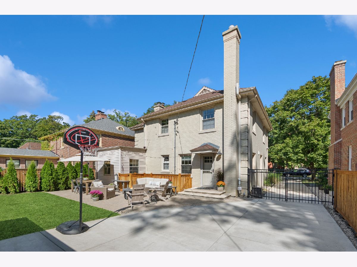 This Stately 1940s Brick Colonial tastefully combines vintage charm with a fresh and sophisticated interior for a contemporary lifestyle. The entire first floor has warm hardwood floors, oversized windows with elegant crown molding and arched doorways. The inviting LR is centered by a WB fireplace. A unique glass barn style door separates a light filled space perfect for an office. There is a large and sophisticated open concept kitchen and dining area. The kitchen has been tastefully updated and includes a unique and cozy corner seating area with views of the lovely backyard. There is also a convenient half bath on the first floor. A classic staircase takes you upstairs to the primary bedroom and 2 good sized bedrooms all light-filled from oversized windows. The beautifully updated bathroom has double sinks and a relaxing soaking tub. The finished basement has a welcoming and comfy family room, complete with a second WB fireplace and a second full bath with a walk-in shower. The oversized lot has large grassy area and brick paver patio with italian lights for outdoor entertaining plus a new 2-car garage. Recent updates: 2025 New 2-car garage, new basement ejector pump, 2024 Fireplace flue and firebox repaired & relined, 2022 New energy efficient furnace and humidifier installed, 2021 perimeter cedar fence installed, 2018 full kitchen remodel and expansion, touch screen, whole house security system installed, 2014 updated main floor half-bath. Fabulous location on a tree-lined street, just walking distance to everything Edgebrook, including the Edgebrook School, Metra, shops, and restaurants with easy access to 90/94, downtown and O'Hare. Stunning home in the heart of Edgebrook.